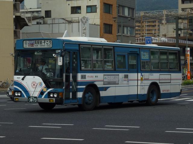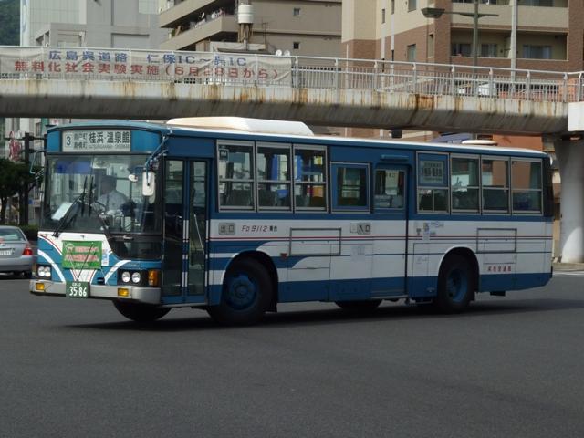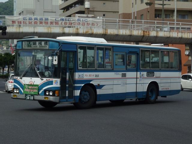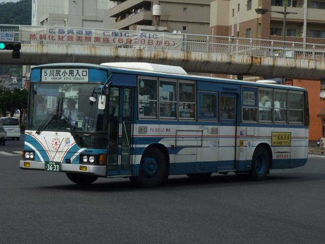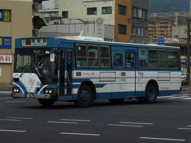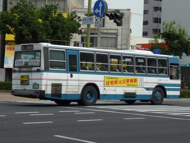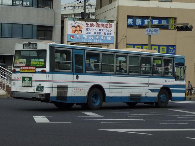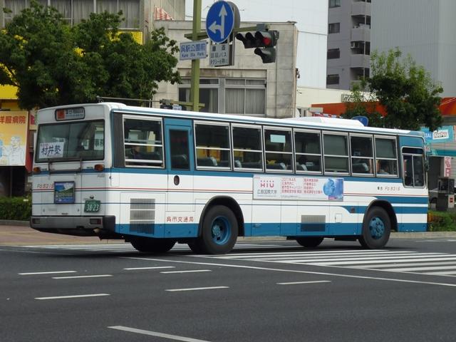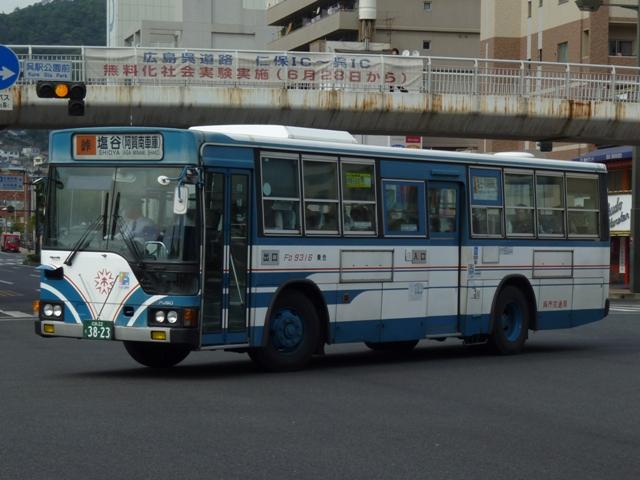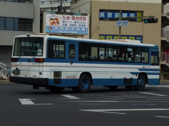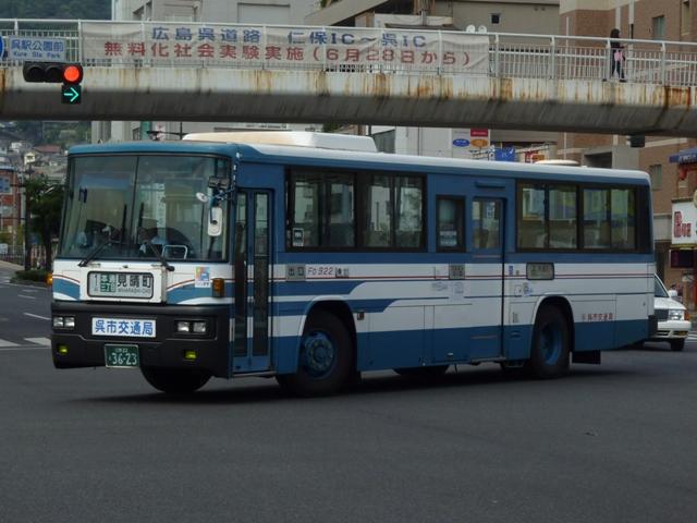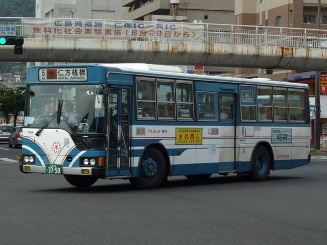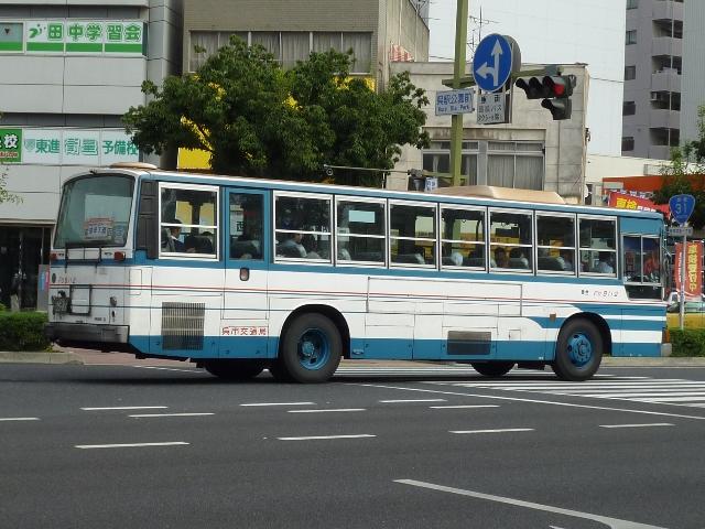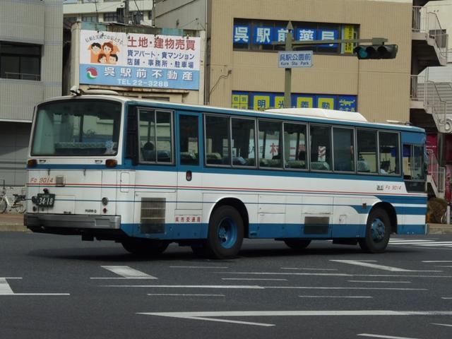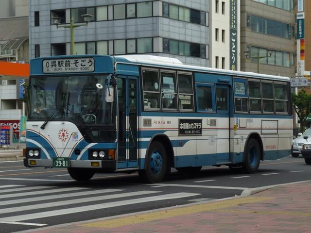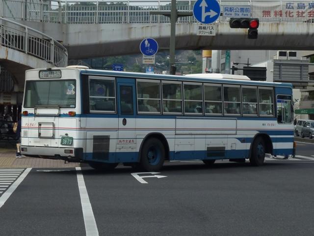 2011年の新ネタはまだ確保できず。もうしばらく、2010年に記録した画像をお付き合 いください。2010年10月下旬に記録した呉市交通局のバス画像よせ集めシリーズ、 今回は三菱ふそうの一般乗合車でU規制車の画像を並べていきます。 なお、型式・年式は呉市交通局の路線移譲あたりHP上に掲載された「公募資料4 車両 一覧」、ツーステップ低床車・標準床車の区別は「呉市交通局 在籍車両一覧」『バスラマ インターナショナル62号』(2000),ぽると出版を参照しました。 局番:Fo 9014.U-MP618M(90年車)。 側面が全引窓仕様のエアロスターK。セーフティウィンドが無く、側面行先表示を窓下に 配置するなど手の込んだ仕様です。貸切兼用車でしょうか。 局番:Fo 9112.U-MP618M(91年車)。 先ほど並べた全引違側面窓仕様は呉市交通局では少数派。一般的な車両はご覧のよ うなセーフティウィンド有でサッシ窓仕様となっています。 なお、見た目での判別が難しいのですが、呉市交通局では91年よりツーステップ低床 車と標準床車を運用担当路線にあわせて導入しています。この車両は標準床車。 局番:Fo 922.U-MP618M(92年車)。 呉市交通局で「準専車」と呼ばれる西工E型ボディの貸切兼用車。元々は92年に開園し た「呉ポートピアランド」専用車として導入された車両。2009年訪問時は旧マスクの西工 E型ボディ車も見ることが出来ましたが、まだ残っているのでしょうか。 局番:Fo 9212.U-MP618M(92年車)。 こちらはツーステップ低床車のエアロスターK。 局番:Fo 932.U-MP618M(93年車)。 エアロスターのボディ共通化により、93年車からエアロスターMボディとなりました。ボディ 変更にあわせてなのか、93年導入車から後面の行先表示を装備しています。 引き続きツーステップ低床車と標準床車を導入しており、まずはツーステップ低床車。 局番:Fo 9316.U-MP618M(93年車)。 こちらは標準床車。小生のレベルでは違いを判断するポイントが分からず。 局番:Fo 936.U-MP618M(93年車)。 中扉横のサボ受けは「休山新道」経由の運行時に使用されている模様。このためサボ受 けの無い車両も在籍しています。 局番:Fo 941.U-MP618M(94年車)。 94年車もほぼ同様。まずはツーステップ低床車。 局番:Fo 943.U-MP618M(94年車)。 こちらは標準床車。 局番:Fo 958.U-MP618M(95年車)。 95年は導入時期によりU規制車とKC規制車が在籍。三菱ふそう車はこの車両までU規 制車となっています。 PR