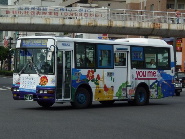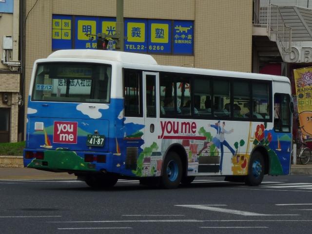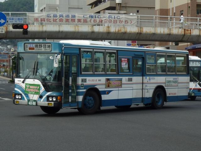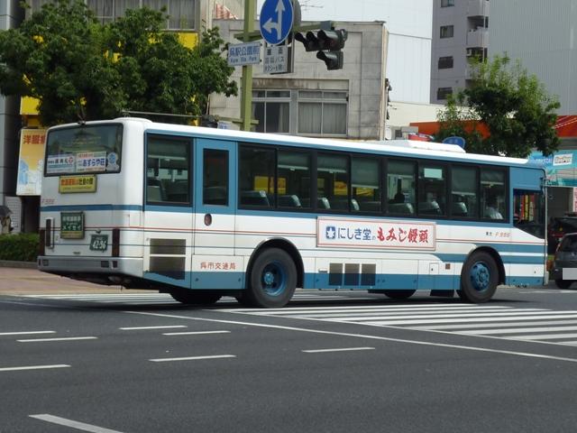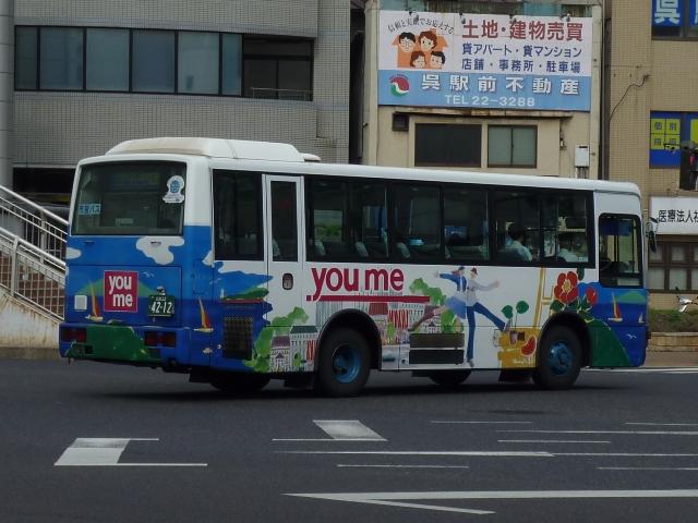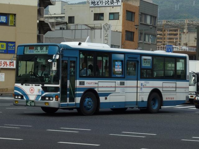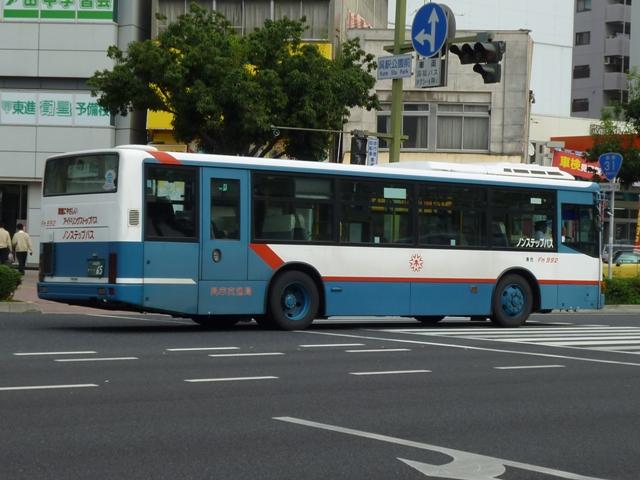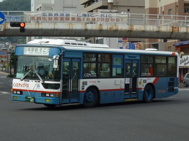 2010年10月下旬に記録した呉市交通局のバス画像よせ集めシリーズ。今回は三菱 ふそうの一般乗合車でKC規制車の画像を並べていきます。 なお、型式・年式は呉市交通局の路線移譲あたりHP上に掲載された「公募資料4 車両 一覧」、ツーステップ低床車・標準床車の区別は「呉市交通局 在籍車両一覧」『バスラマ インターナショナル62号』(2000),ぽると出版を参照しました。 局番:Fo 9516.KC-MP617M(95年車)。 95年後半に登場した車両からKC規制車となります。もっとも変わったのは型式くらいで、 U規制車同様に標準床車と低床車を並行導入。こちらはツーステップ標準床車。 局番:Fo 961.KC-MP617M(96年車)。 エアロスターMボディ最終期の車両となる96年導入車。側面窓が全引窓仕様に変更され ました。画像のように一部の車両は行先表示をLED改造を行っています。 局番:Fso 9611.KC-MK619F改(96年車)。 96年から導入を開始した中型MK短尺車。画像の車両はゆめタウンラッピングで呉駅発 着の循環路線で活躍しています。リヤ側のみの画像で失礼。 局番:Fo 974.KC-MP717M(97年車)。 呉市交通局生え抜きのニューエアロスターは97年に導入した2台から。まずはM尺車。 局番:Fmo 975.KC-MP717K(97年車)。 こちらはK尺。局番に「m」がつきます。 局番:Fso977.KC-MK619F改(97年車)。 前年に引き続いての導入となったMK短尺車。呉駅で見ることが出来るMK短尺車は、 次回並べる予定の赤色「くれたん」などラッピング車ばかりです。 局番:F986.KC-MP717M(98年車)。 98年の導入車から局番にワンマンを表す「o 」の表記が無くなりました。前年同様M尺と K尺を導入しています。 局番:Fmo9810.KC-MP717K(98年車)。 ということでK尺車。 局番:Fs9813.KC-MK619F改(98年車)。 98年もMK短尺車を導入。画像の車両は昭和営業所の在籍車で、いすゞLR短尺車と 同じく主に昭和循環線で活躍している模様。 局番:Fm992.KC-MP747K(99年車)。 呉市交通局に初登場したノンステップバス。この塗装は以後スロープ付低床車の標準色 となります。 呉市交通局に在籍する三菱ふそうのKC規制車は移籍車も多く在籍しています。東急・京 急のエアロスターMはもちろん、横浜市交通局ニューエアロスター移籍車も見られず。頼 りの広島焼山線もセレガだったりと、まったく記録することが出来ませんでした。どうやら 呉駅以外にも足を伸ばさないとダメだと実感。 PR