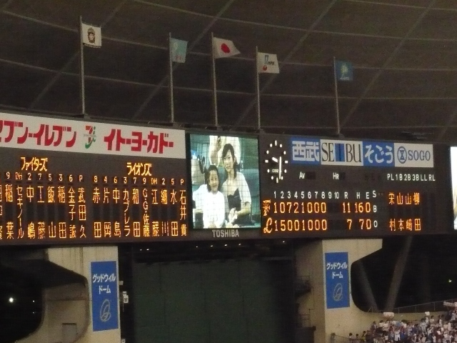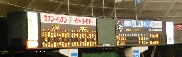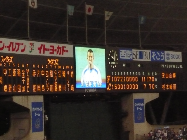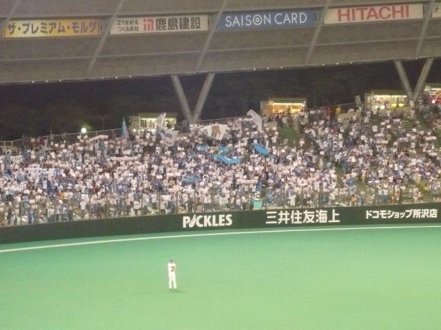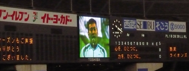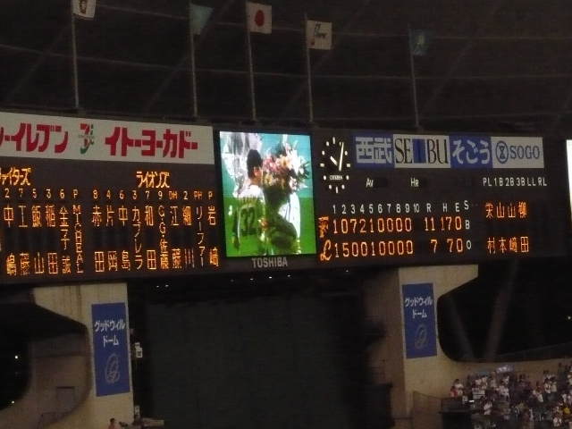 結局2日続けて観戦。いつもどおり19時40分頃に球場に。 展開がなんかすごいんですけど・・・。長時間試合の感も漂います。 しかし、3回に大逆転とは!前日の4安打4点の日本ハム打線とは違います。 文化放送もこの日がライオンズナイター2007年最終日でしたが、よりによって解説が 岩本。小生は猫ファンではないのでハムより解説でも問題無しですが、西武ファンはか ちんときたことでしょう。もっともハムよりにせざるを得ない西武の拙攻・拙守でしたが。 しかし、日本ハムの内野守備が見ていて安心できます。同じようなゴロでも片やゲッツー 片や2塁アウトのみと、表裏で随分差があります。金田ロッテの頃の西武にはいいように やられてましたが、随分とかわったものです。 9回にようやっと石井貴引退登板。奥さんきれいですね。 文化放送の応援レポーター三拍子によれば引退惜別の人文字応援が出るとのこと。 どんなもんかと見ていましたが・・・・・・・・・・・・、もう少し大きいものかと思ってました。 ただ自発的な応援でこういうものが起こるんですから、石井貴はすごいですね。 試合は結局、 西武 7-11 日本ハム 試合後引退セレモニー。日本ハムの中島から花束をもらう石井貴。 そういえば一時期は西武にいたんですよね、中島。 引退セレモニー後、今シーズン本拠地最終戦ということで総括する伊東監督。 あのー・・・、退任発表はないんでしょうか?それが楽しみで残っていたんですが。 退任発表は無く、グランド一周に。 観戦でしたが。図らずも26年ぶりBクラス転落という記念すべきシーズンの目撃者 となることが出来ました。 PR