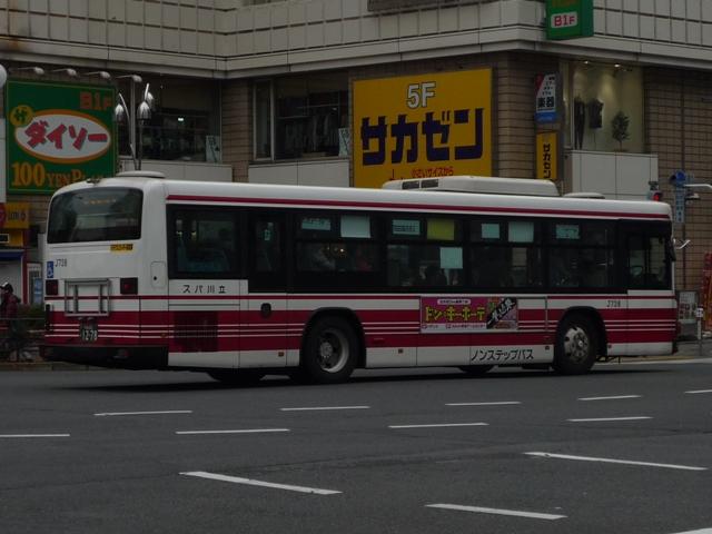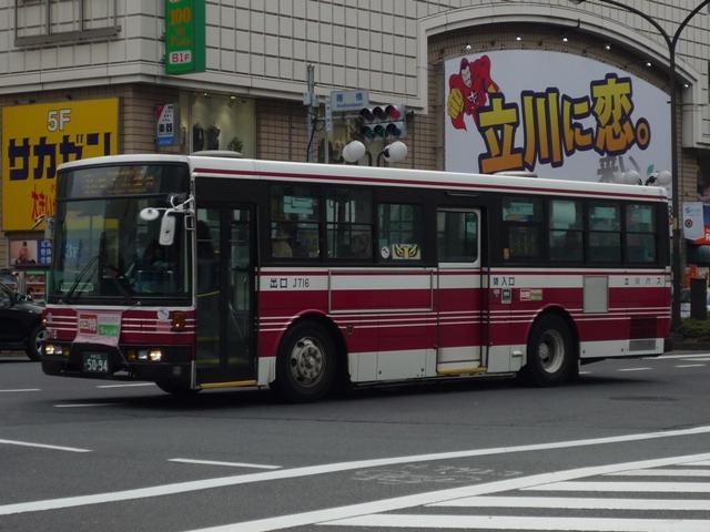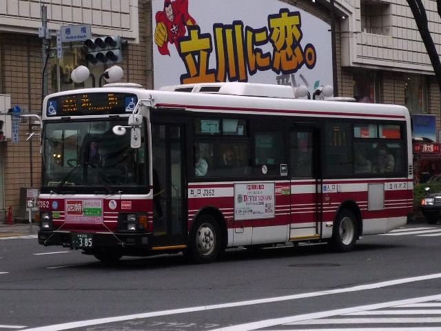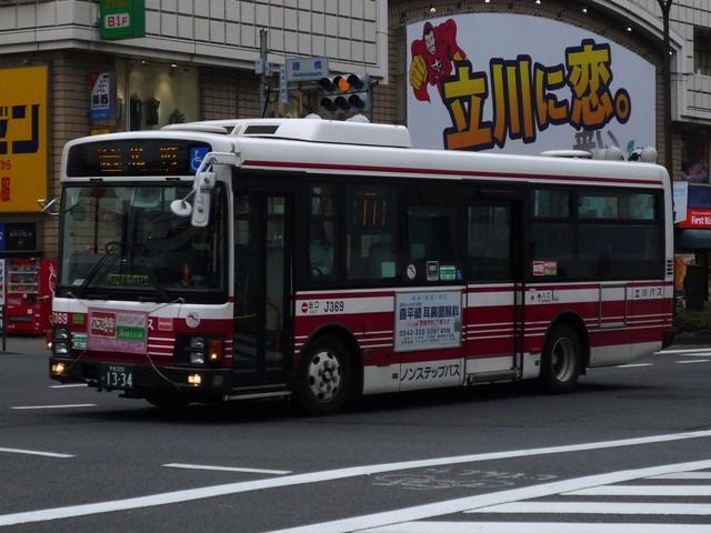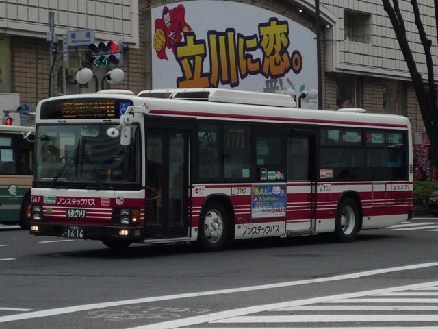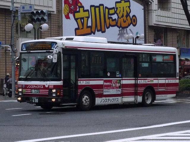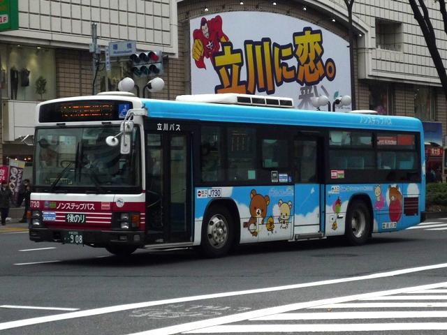 立川競輪場送迎無料バスとあわせて記録した「立川で見たバス2010冬」、2011年の 2月も終わりに更新するのもどうかという頃になってきたので、今回で終了です。おおむ ね2010年12月に立川で記録した立川バスのいすゞ車と日野車を並べていきます。 なお、型式・年式は『BJハンドブックシリーズR65 小田急バス・立川バス』(2008),BJ エディターズ を参照しました。 <いすゞ車> 社番:J716.KC-LV380L(98年車)。 まずは富士7Eボディのツーステップ車。競輪場開催日の無料送迎バスだけでなく、路線 運用にも当然ながら入っています。 社番:J730.KL-LV280L1(04年車)。 エルガのノンステップ車。キュービックを販売初期に導入して以来、立川バスでは久々に 登場した純正ボディの大型乗合車です。 画像は青色カラーのリラックマバス2号車。黄色の1号車は現在国立方面で運行しており、 立川で見られるのはこの色のみ。 社番:J738.PJ-LV234L1(06年車)。 PJ規制車のエルガノンステップ。冷房装置はサーモキング。 社番:J747. PKG規制車で冷房装置はデンソーに変更。 社番:H406.PK-HR7JPAC(05年車)。 全国的に導入事例が少ない日野HRのいすゞOEM車「エルガJ」。2004年から2005年 にかけて導入。立川でも見ることが出来ます。 社番:J352.KK-LR233J1(02年車)。 北町線を中心に活躍する中型車。まずは初期に導入したワンステップ車。 社番:J360.KK-LR233J1(03年車)。 03年より中型車もノンステップで導入。 社番:J369.PA-LR234J1(06年車)。 PA規制のエルガミオノンステップ車。 <日野車> 社番:J20.PONCHO(03年車)。 立川バスでは少数派の日野車、主にコミュニティバス用途で在籍しています。画像は立 川市コミュニティバス「くるりんバス」で活躍する初代ポンチョ。「くるりんバス」では現行ポ ンチョも在籍しています。 PR