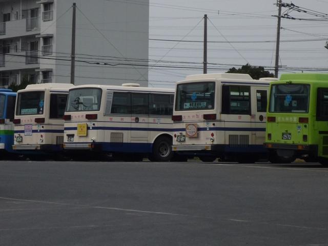 計画停電もとりあえずひと段落しましたが、問題が根本的に解決したわけでもなく。 拙ブログでは引き続き節電を考慮した更新を行っていきます。 さて、前エントリでも書きましたが、北九州へまた出かけました。 2月に出かけてからそれほど日もおかず再訪したのは、北九州市交通局久々の新車導 入となったLKG規制車のエアロスターを記録したかったからです。 もっとも、目的のエアロスターは残念ながら営業所の奥で整備中でしたが。まあ今後20 年近く活躍するでしょうから、次のチャンスを狙うということで。 ならば今後代替対象となるであろう富士5Eだけでも・・・、と思いましたが もちろんこちらも動いておらず。若松配置のこの車両は貸切登録になっているのかもしれ ません。北九州市交通局の車両は撮りためたものの、わざわざ2回出かけたほどの成果 はなかったという結果に終わりました。 ということで、北九州市交通局の車両を主に4月に記録した画像を中心に2回にわたって 更新していきます。今回のその1では北九州市交通局のツーステップ車両を並べていきま す。ただし、西日本車体をメインに導入している北九州市交通局ゆえ、西工58MCばかり となっていることをあらかじめお断りしておきます。 なお、型式・年式は「北九州市交通局 在籍車両一覧」『バスラマインターナショナル73号』 (2002),ぽると出版 を参照しました。 局番:6306.P-U32L(88年車)。 北九州市交通局はUDと三菱ふそう車の2メーカーを導入しています。現在在籍するツ ーステップ車は中扉4枚折戸に上部引き違いの側面窓という仕様で揃えられています。 局番は96年まで元号の導入年度+導入年度ごとの2桁連番となっており、この車両は 昭和63年度の導入。古さを感じさせない仕様ですが、既に20年超活躍しているという なかなかの古参車です。 北九州市交通局では事業再建の一環で2004年から6年間にわたり新車代替が行われ ませんでした。先日登場したLKG規制エアロスターは老朽化した車両代替のための先 行導入という位置づけで、先ごろ策定された「北九州市交通局事業経営計画 平成23年 度~27年度」によれば、今後は中・小型車や移籍車の導入も予定しているとのこと。昭 和時代に登録された20年超えの古参車がワンステップ・ノンステップ車にまじって活躍 する姿を見られるのもあとわずかかもしれません。 局番:H103.P-MP218M(89年車)。 平成元年度導入車は三菱ふそうのMP。この画像だけではUDと見分け困難ですが。 局番:H206.U-MP218M(90年車)。 行先表示は数年前にLED改造済みです。 北九州市交通局では行先と経由を表した系統番号を採用していますが、これがはっきり いってよそ者にとって理解不能なもの。多くのバス停は時刻表のみ、車内掲示の路線図 は路線・系統表示の無い神奈中タイプのみのため、時刻表掲示の系統番号がどこを走 るのか分からない不親切仕様となっています。 わかりやすい路線なら問題ないのですが、若松中心部の経路など一見さんお断り状態、 交通局のHPにも系統番号の表示はなく、全体的にいかにも縦割り行政といった感じ、も はや市営バスに乗って欲しくないとしか考えられません。 先ほども紹介した「北九州市交通局事業経営計画 平成23年度~27年度」によれば、バ ス待合環境の整備が取り組み予定となっています。あわせて分かりやすい系統路線図の 掲示もお願いしたいところです。 局番:H403.U-MP618M(92年車)。 見た目の変化はありませんが、92年からエアサス仕様で導入。 局番:H503.U-UA440LAN(93年車)。 93年導入の大型車は88年以来の富士ボディで導入。富士ボディを導入した経緯はよく わかりませんが、西工ばかりの中では違和感たっぷり。なお、この画像は2月に記録した ものになります。 局番:H504.U-UA440LAN(93年車)。 せっかくなので富士7Eボディの車両をもう1台。 ちなみに93年は西工ボディのJPワンステップ車も導入しています。9両在籍しているにも 関わらず2度の訪問とも記録出来ず。路線限定なのでしょうか? 局番:H602.U-MP618M(95年車)。 局番:H601.U-MP618M(95年車)。 前後で局番が異なり失礼。2010年から登場した新塗装に塗り替えられたMP。塗装デ ザインは貸切車やリムジン車の色違いで、塗装のグリーンは北九州市が目指している 「環境モデル都市」をアピールしたものとか。この塗装変更がどのあたりの車両までを対 象としているのか気になるところです。 さて、北九州市交通局の内装ですが、後部の側板やシート後部にギラギラ輝くウロコ模 様の金属板を貼り付けているのが特徴。他事業者でもこんな仕様があるのでしょうか? 局番:H703.U-UA440LAN(95年車)。 局番:H702.U-UA440LAN(95年車)。 平成7年度はU規制車とKC規制車を導入。まずはU規制車のUA。前後で局番が異なり 失礼。 局番:H705.KC-UA460LAN(95年車)。 KC規制車では1両だけ富士7Eボディを導入。交通局内部に富士ボディファンがいたの でしょうか。 局番:H707.KC-UA460LAN(96年車)。 こちらは多数派の西工ボディ。U規制車との外観上大きな変化は屋根上の冷房装置位置