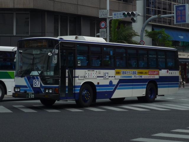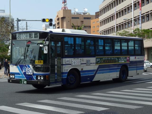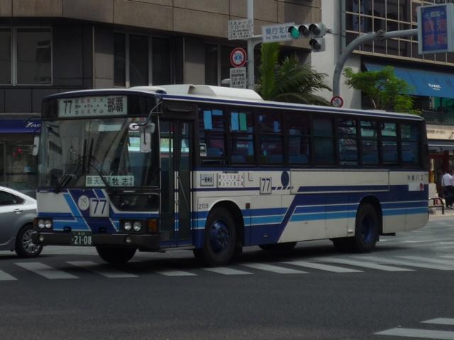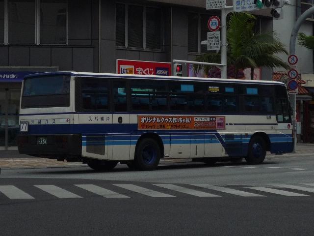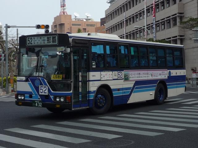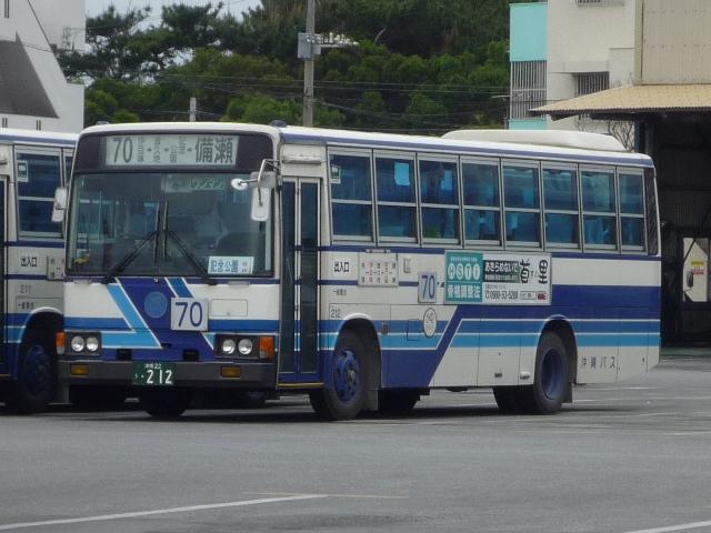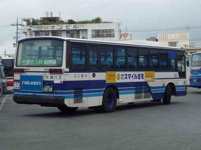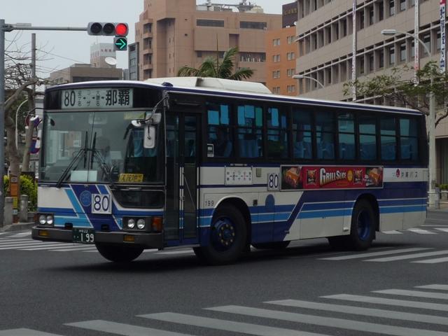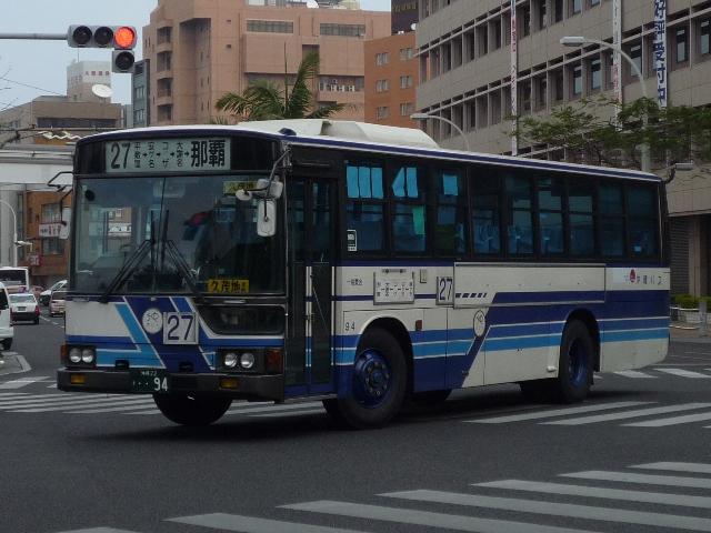 4月に沖縄本島で記録したバス画像のよせ集めシリーズ、「沖縄で見たバス2011」。 シリーズの目玉といえる2010年4月以降に導入した車両はあらかた並べ終わり、出 涸らネタでまだ続けます。今回は沖縄バスの沖22か・沖縄22きナンバーの自社発注 乗合車(111番高速バス除く)を並べていきます。2010年編と被りますが、2011年に 走っていた車両の記録ということでお付き合いください。 なお、型式・年式は、「沖縄バス在籍車両一覧」『バスラマインターナショナル106号』 (2008),ぽると出版を参照しました。 <沖22かナンバー> 沖22か2063.P-MP218M(87年車)。 今回記録出来た沖縄バスの最古参車。2010年訪問時に比べると、沖縄バスは古参移 籍車だけでなく、沖22かナンバーの自社発注車両も代替されている模様。 沖22か2108.P-MP218M(87年車)。 自社社発注ワンステップ車やエアロバスK顔のMPがメインで活躍する77番名護東線 ですが、この日は予備車の沖22かナンバーの車両も運用に入っていました。 沖22か2110.P-MP218M(87年車)。 リヤ側の画像だけですが、こちらは名護で見かけた沖22かナンバー。本来運行予定の 車両が不調だったらしく、代わりに120番の運用に入っていました。長距離利用者的に は当たりだったかも。 <沖縄22きナンバー> 沖縄22き94.P-MP218K(89年車)。 沖縄22き199.P-MP218K(90年車)。 沖22かナンバーが現役ですから、このあたりの車両は当然第一線で活躍しています。 K尺のエアロスターK。今回は逆T字側面窓のエアロスターK自社発注車は見られず。 沖縄22き209.P-MP218M(90年車)。 LED行先表示に改造された車両も在籍していましたが、系統番号にご注目。この日は中 型メインの87番てだこ線で運行中でした。行先表示をLEDとすることで、全路線対応の 予備車となっているものと推測。そう考えると、けして新しいとは思えない画像の車両がL ED行先表示の改造対象になった理由も納得出来そうです、はたして真相はいかに。 沖縄22き212.P-MK117J(90年車)。 沖縄バスで90年に初導入となった中型車。ここ数年は名護の北部ローカル線で活躍。 沖縄22き248.U-MP218M(90年車)。 90年車はU規制車も在籍。路線環境に合わせてK尺とM尺を導入していました。 沖縄22き354.U-MP618M(92年車)。 77番名護東線など長距離路線を中心に活躍するエアロバスK顔のMPエアサス車。 バリアフリーなワンステップ車を選ぶか、居住性をとるか悩むところ。 沖縄22き432.U-MP218K(93年車)。 エアロスターMボディとなった車両。 PR