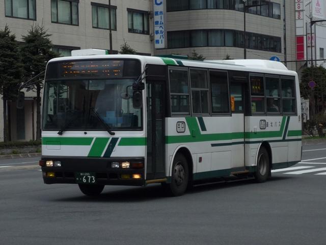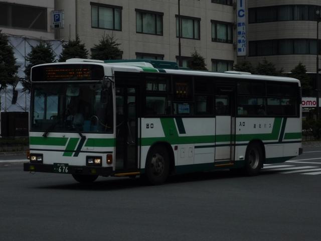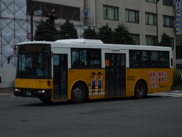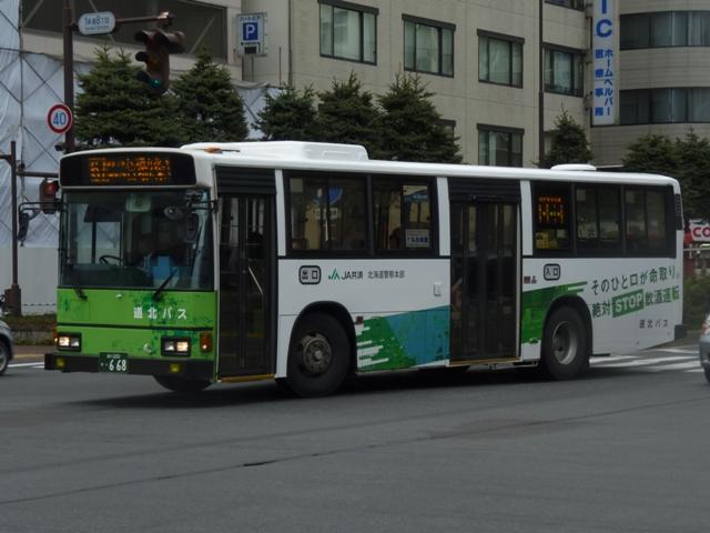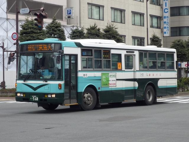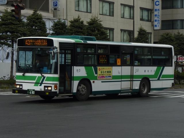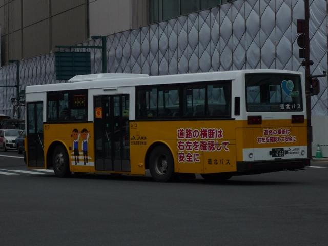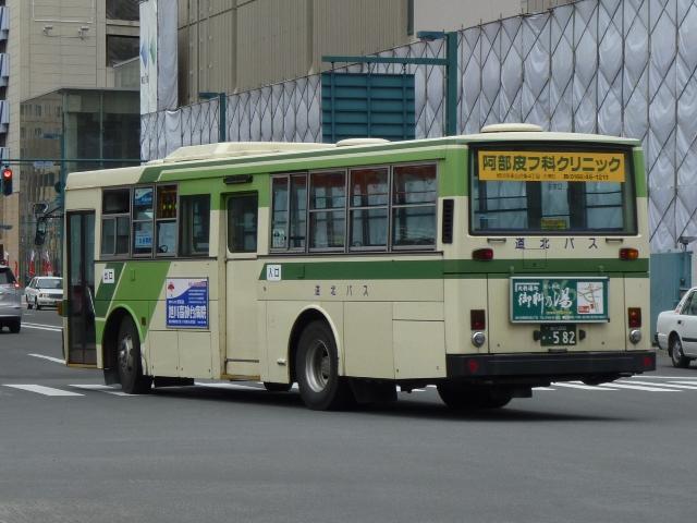 5月に旭川へ出かけた際に見たバス画像よせ集め。道北バスで活躍する移籍車編その 4では、前回の続き~神奈川中央交通元ワンロマ&スヌーピー移籍車より前に導入され た車両を並べていきます。 なお、型式は「移籍車両の最新トレンド」『バスマガジン47号』(2011),講談社ビーシー /講談社 を参照しました。 旭川200か568.U-UA440LSN。 地元の学習塾スポンサーによる旧塗装復元車。川崎市交通局から移籍のエアロスター Kに続き、相模鉄道からの富士7Eボディ移籍車も加わりました。旧塗装復元車はさらに 都市間車にも登場しています。 旭川200か582. 旧塗装復元車以外の相鉄移籍車は正面のみ道北バス風な帯となっているだけの、見た ままそのままで活躍しています。