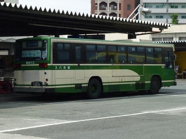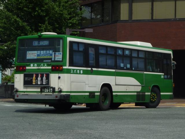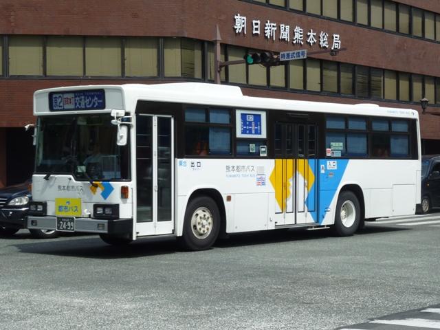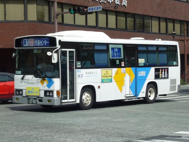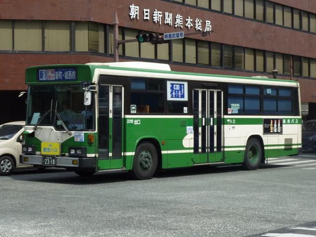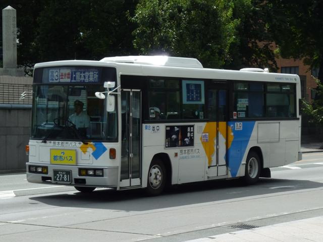 今年は九州へ出かける機会が多い小生。高速バスの乗り継ぎ等で熊本も訪ねていま すが、行く度天気がパッとせず。このためブログのネタにしたのは1度きり。そこそこの 枚数をようやく確保出来たことから、新シリーズ「熊本で見たバス2011」をスタート。 大分編が微妙に終わっていない状況で見切り発車です。 ちなみに熊本ネタを集中して行うのは2009年以来。ちょうど「熊本都市バス」が運行を 開始したばかりの頃で、「都市バス」の正面看板が無かった過渡的な状態でした。時間 が無かったとはいえ、もう少しきちんと記録できればと今になって思う次第。新シリーズ 第1回はそんな反省をこめて熊本都市バスからスタート。もっとも反省を踏まえたとは いえない内容ですが、とりあえず今回のその1では記録出来た「熊本22かナンバー」の 車両を並べていきます。 ここで熊本都市バスについてのおさらい。熊本市交通局では競合しているバス路線を 産交・熊電・熊バスの県内事業者3社に移譲しました。路線移譲を引き続き進めるにあた り、移譲路線の配分・エリア・採算等の諸問題が発生。その解決策として、路線移譲の受 け皿会社「熊本都市バス」が県内事業者3社の出資により設立。2009年4月に熊本市営 バス本山車庫の面的移譲を受け、市営バスからの転籍車で運行を開始しました。 着々と路線移譲が進み、2011年4月からは上熊本営業所の面的移譲も受け、当初に比 べると、所属車両が大幅に増えている状況となっています。 熊本22か2318. まずは市営バスカラーのままで残る市営バスから生え抜きのいすゞLV。登録番号からP 規制車と思われますが、西工58MCボディはP規制車というほどの古さを感じさせず。逆に KC規制車をそれほど新しいと感じさせないということもあるのですが。 市営バス時代系統を表す動物看板を掲示していた正面部は、「都市バス」の掲示に変わり ました。 熊本22か2499.U-HT2MLAA(90年車)※2。 熊本都市バスカラーに塗り替えられた車両。型式を参照した『バスマガジン』によれば、 塗装の黄色は銀杏・青色は地下水をイメージしたとのこと。これらのカラーに熊本城の シルエットロゴを側面中央に配置しています。このため中扉4枚折戸下部全体にラッピ ングを行い、塗装は白1色と簡素ながら微妙に手間のかかったデザインとなっています。 なお、熊本市営バスは4メーカー導入しており、熊本都市バスにもメーカー括りなく転籍 しています。ということで、小生レベルではこの画像だけでは西工ボディのシャーシメー カーを判別出来ません。と、書いていましたが、2014年にバスマガジンで熊本市営バ ス特集が掲載。ようやく型式・年式を追記することが出来ました。 熊本22か2616. 市営バスカラーで残る車両シリーズ。 熊本22か2619. こちらはいすゞLV。 熊本22か2707.U-RJ3HJAA(92年車)※1。 熊本都市バス運行開始時から在籍している日野中型車。 熊本22か2781. 熊本22か2782.U-RM210GSN(93年車)※2。 熊本市交通局では場所柄西工ボディを愛用していますが、93年導入のRMは富士ボディ で登場。転籍時期により都市バスカラー・市営バスカラーが在籍しています。 熊本22か2904.U-RJ3HJAA(94年車)※2。 中型車は狭隘路線もあることから、結構な台数在籍しています。 熊本22か3006.U-LR332J(95年車)※2。 西工ボディの中型ワンステップ車。この車両は2009年編で市営バス時代の画像を並 べていました。 熊本22か3301.KC-HU2PMCE(99年車)※2。 日野の初期型ノンステップ車も転籍しています。 PR