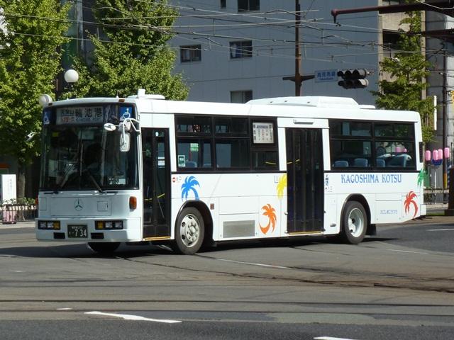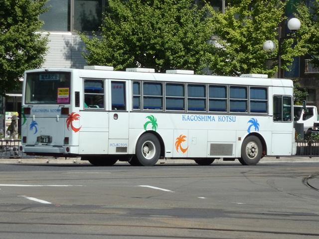 化。京成移籍車に続いて登場したのが東京都交通局からの移籍車。富士ボディのい すゞLV。2009年訪問時には無かった、扉の「出入口」表記がいつのまにか貼られて いることに軽い違和感と驚き。 鹿児島200か462.U-UA440LSN(94年車)。 西武バスからL尺のUA移籍車がまとまった台数在籍しています。まずは「イオン鹿児島 ショッピングセンター」ラッピング車。 鹿児島200か464.U-UA440LSN(95年車)。 西武バス移籍車といえば3扉車も在籍。扉を埋めるなどの改造は特に行われていない 模様。画像の車両は鹿児島交通・いわさきバスネットワーク・南国交通3社で共同運行 している「ドルフィン150」専用車として活躍。 鹿児島200か465.U-UA440LSN(95年車)。 「イオン鹿児島ショッピングセンター」ラッピングの3扉車。西武バス移籍車導入事業者 の中でも3扉車導入台数はずば抜けて多い印象。 鹿児島200か535.U-UA440LSN(95年車)。 鹿児島交通標準塗装の西武バス移籍車。 現在の鹿児島交通標準カラーは、白地にカラフルなヤシの木マークが散りばめられた デザインとなっています。 鹿児島200か550.U-UA440LSN(95年車)。 標準塗装の3扉車。 鹿児島200か576.U-UA440LSN(95年車)。 西武バス移籍車は記録出来た枚数も多いので、とりたてて代わり映えしませんが並べ ておきます。 鹿児島200か734.U-JP211NTN(95年車)。 京王電鉄バスグループからのJP移籍車。鹿児島交通初のワンステップ車で、富士ボディ のU規制車がそこそこまとまった台数在籍しています。 鹿児島200か750.U-LV324K改(95年車)。 西武バス移籍車と並び、かなりまとまった台数在籍しているのが国際興業バス移籍車。 まずはU規制車のキュービックK尺。 鹿児島200か803.U-LV324K改(95年車)。 いわさきグループの白露酒造ラッピング広告車となっている国際興業バス移籍車。 鹿児島200か805.U-LV324K改(95年車)。 同じく国際興業バスからの移籍車ですが、塗装工場の違い?か、前扉・中扉周囲が白塗 りの車両も在籍。 PR