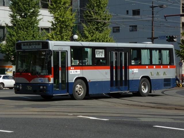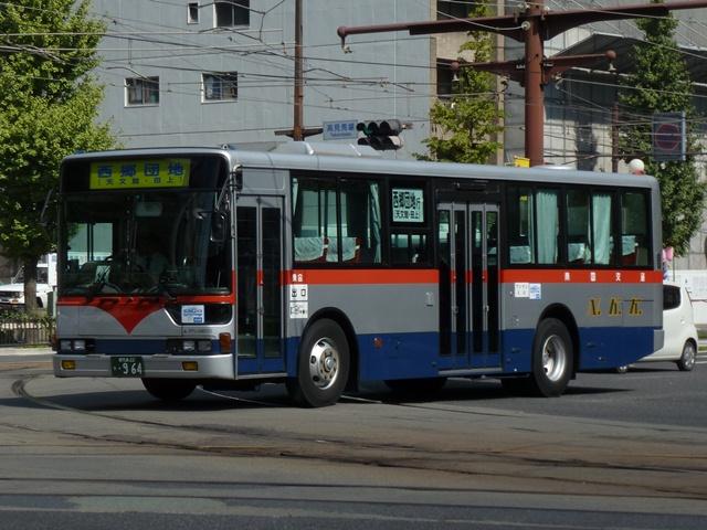 10月に記録したバス画像のよせ集め、「鹿児島で見たバス2011」。 今回は南国交通編その2として、鹿児島22きナンバーの一般乗合車を並べていきます。 なお、型式・年式は「南国交通 在籍車両一覧」『バスラマインターナショナル94号』 (2006),ぽると出版 を参照しました。 鹿児島22き361.U-LV218M改(90年車)。 UD以外の車種が在籍する南国交通。大型一般乗合車の標準的な仕様は中扉4枚折戸で 全引違側面窓でエアサス、内装も都内在住者からすると驚くべきほどしっかりしたシートと なっています。まずは結構な台数在籍しているキュービックボディ。起伏の多い鹿児島市内 路線を考慮し、いすゞ車は90年から高出力エンジン車を導入しています。 この車両は正面に「ISUZU」エンブレムを取り付けていますが、元々なのか担当運転士 さんの趣味かは分からず。 鹿児島22き361.U-LV218M改(90年車)。 U規制車以降のいすゞキュービックにはご覧のように正面のエンブレムはありません。 ちなみにこの車両の運用している「市4」系統は鹿児島市交通局と共同運行路線。現在 「市4」と「市26」の2路線を共同運行しています。 鹿児島22き365.U-LV218M改(90年車)。