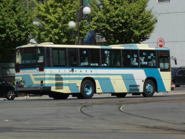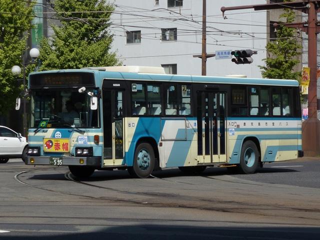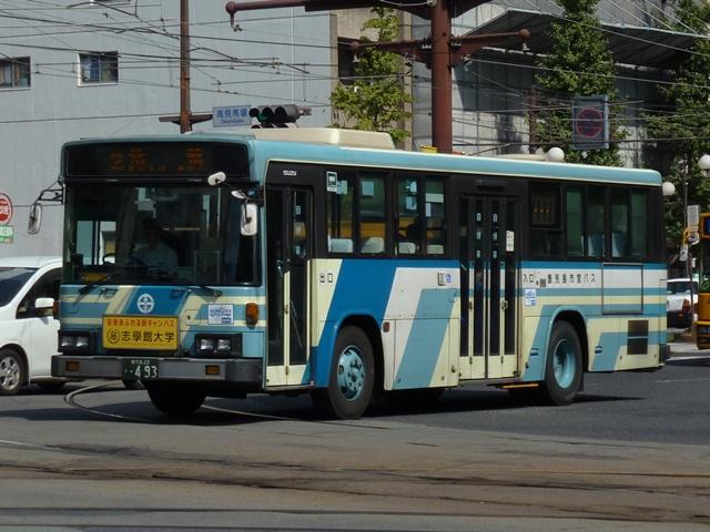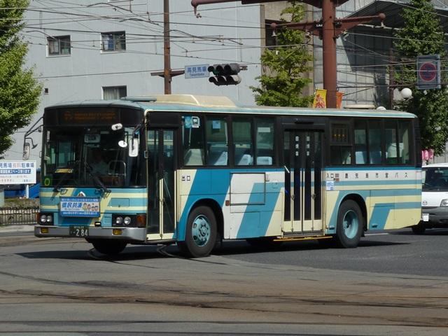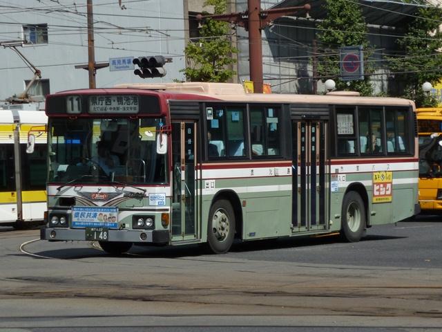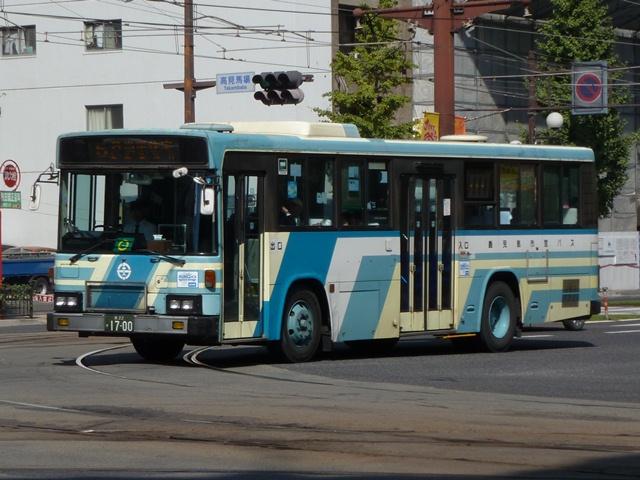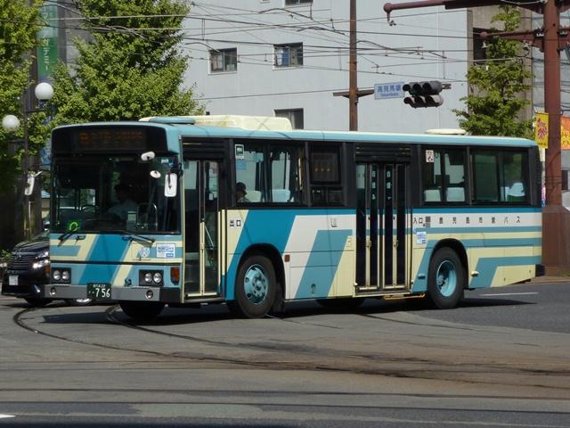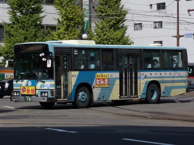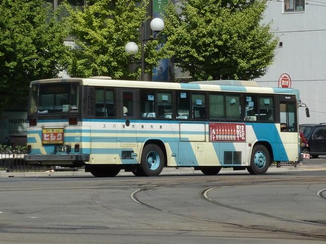 10月に鹿児島で見たバス画像のよせ集め、「鹿児島で見たバス2011」。 今回は鹿児島市交通局編です。その3では記録出来たP・U規制の一般乗合車を並べ ていきます。なお、タイトルがその2までと若干異なるのは車体表記をモチーフとしてい るため。特に深い意味はないのであしからず。 型式・年式は「鹿児島市交通局 在籍車両一覧」『バスラマインターナショナル65号』 (2001),ぽると出版 を参照しました。 鹿22か1700.P-LV214M(87年車)。 記録出来た鹿児島市交通局の最古参ナンバー車両は2009年訪問時同様、87年車の 西工ボディのいすゞLV。鹿児島市交通局のバスといえばフロントガラス1枚にオーバー ラップ式ワイパー。キュービックならデフォな仕様も、わざわざ西工ボディで特注導入す るところがポイント。一部の経年車は行先表示をLED改造しています。 鹿児島22き148.P-HU235BA改(89年車)。 方向幕+旧塗装で残る日野HU。89年以前まで採用されたなかなか渋い塗装デザイン。 この塗装も新車導入で残りわずかと推測。見かけたのはこの車両だけでした。 ちなみにこの頃の鹿児島市交通局は既にサイズ毎に同一モデルをまとめて導入してい ます。このため年毎に導入メーカーが変わり、メーカーによってはしばらく導入されない こともしばしば。 鹿児島22き284.P-MP618M改(90年車)。 水色主体の塗装は90年に導入したエアロスターKから採用。もちろんフロントガラスは 1枚仕様。 鹿児島22き493.U-LV224M(92年車)。 91年は定期観光車のみの導入だったため、一般乗合車のU規制車は92年導入車から。 87年以来となる西工ボディのいすゞLVが登場。 鹿児島22き504.U-LV224M(92年車)。 せっかくなのでもう1台、広告看板がまったく入っていない車両。鹿児島市交通局のHP によれば、前面・側面・後面それぞれ掲示金額が異なるようです。ちなみに掲示金額は 前面より後面の方が高いようです。サイズが理由なのかちょっと意外。 鹿児島22き595.U-UA440LAN(93年車)。 93年はUD。西工ボディなのでどれも同じに見えますが。 鹿児島22き747.U-HU3KMAA改(95年車)。 95年から高出力エンジン車の導入を開始。 鹿児島22き756.U-HU3KMAA改(95年車)。 ラッピング広告対策で広告枠を撤去した車両も在籍。前面がすっきりしています。 鹿児島22き758.U-HU3KMAA改(95年車)。