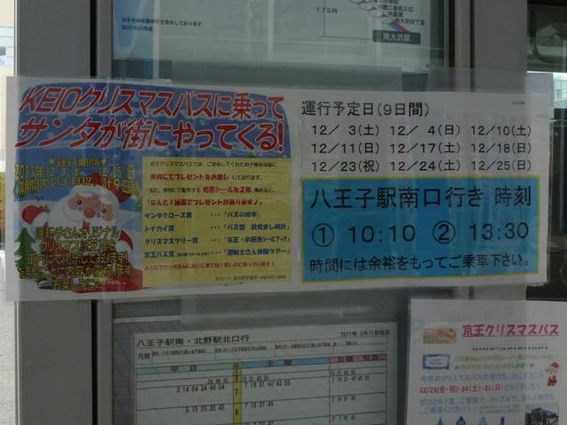 京王電鉄バスグループ各社で恒例となった「京王クリスマスバス」。 今年も検索キーワードでお探しの方が誤って覗いてしまっているようなので、南大沢 で記録出来た2011年クリスマスバスの車両を並べておきます。 社番:M40282. 今年のラッピングデザインはこんな感じ。昨年あった「サンタ号」・「トナカイ号」の愛称は 無い模様。例年同様、土日祝日はサンタクロースも添乗し、お子様向けにお菓子とクリス マスカードなどを配っているようです。小生も一度実物を拝んでみたいものですが、子供 がいないんだから無理な話。いないのは子供だけではないのですが。 南大沢駅発着のクリスマスバスは「南大沢5丁目循環線」と「由木八王子線」の2路線で 運行。「由木八王子線」の南大沢駅発クリスマスバスは画像の通り。 「南大沢5丁目循環線」は概ね30分に1本の運行となっています。12時台の運行は無 いので、ご注意を。 PR
