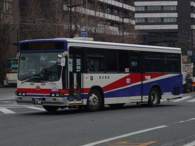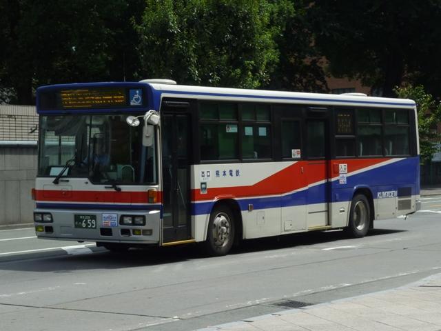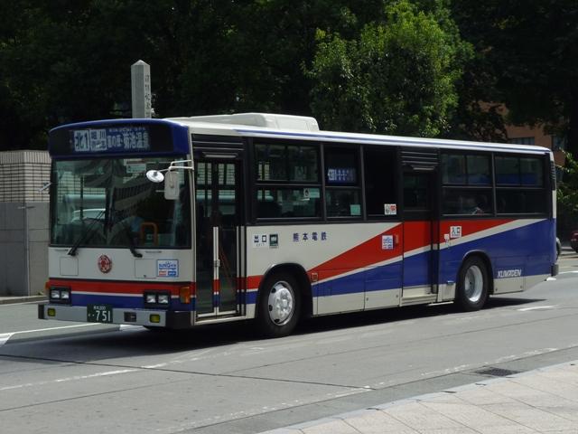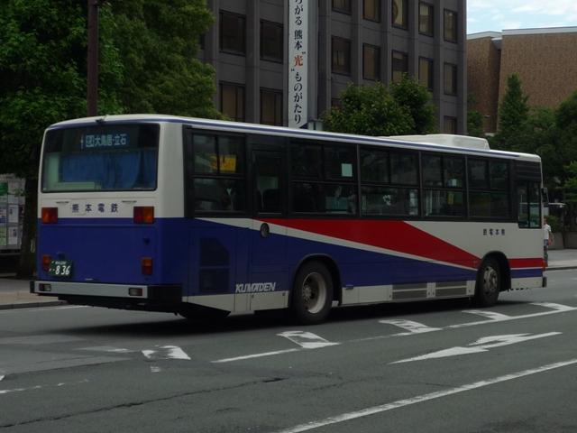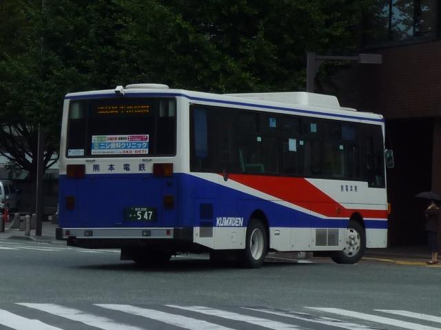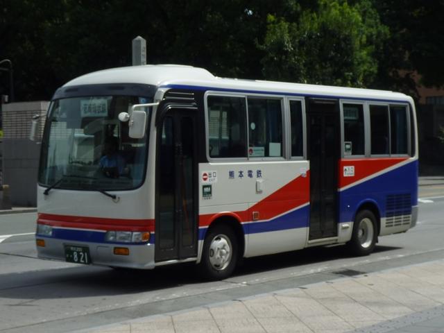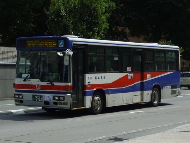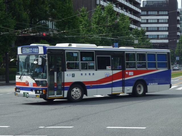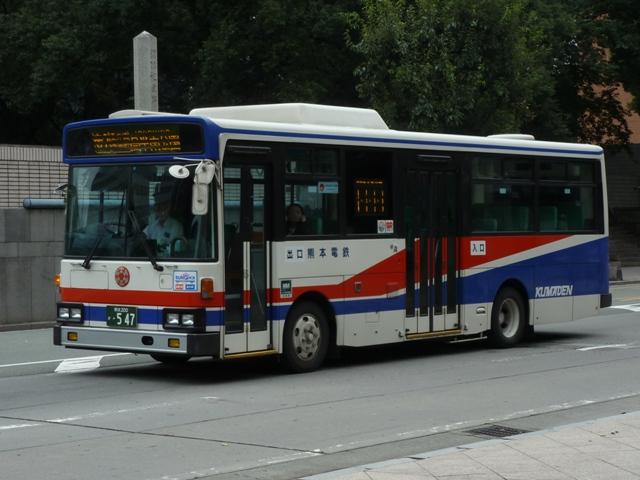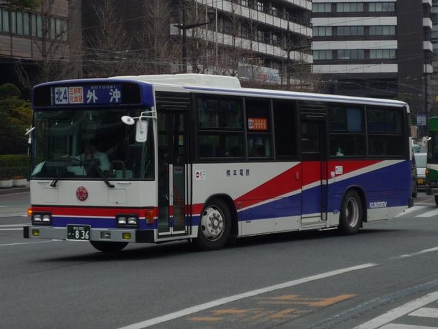 熊本200か493.2011年12月に記録。 ここ数年の熊本県内各社で大人気移籍車種といえばこれ、京浜急行バスグループから の日野HTワンステップ車。熊本電気鉄道にも、まとまった台数が在籍しています。 熊本200か547.2011年10月に記録。 神戸市交通局在籍時、異端的存在だった中扉4枚折戸仕様のいすゞ中型車も熊本電気 鉄道入り。高平団地線で運用しているところをよく見かけます。 熊本200か601.2011年9月に記録。 京浜急行バスグループからの日野HTワンステップ移籍車。 熊本200か659.2011年9月に記録。 熊本200か702.2011年9月に記録。 近年人気急上昇の高槻市交通局移籍車も導入しています。西工ボディのいすゞLVワン ステップ車が数台在籍している模様。 熊本200か708.2011年4月に記録。 コンスタントに導入される京浜急行グループ移籍車。キュービックボディのいすゞLVワン ステップ車も熊本電気鉄道入りしました。 熊本200か751.2011年9月に記録。 こちらは熊本電気鉄道おなじみの京浜急行バスグループから日野ワンステップ車。 このあたりの導入車両は幕式の行先表示となっています。側面の小型サイズから廃車 再利用品と推測。 熊本200か779.2011年9月に記録。 ヘッドライト角目仕様の三菱ふそうMP、久々の川崎市交通局移籍車です。 熊本200か821.2011年9月に記録。 京浜急行バスグループからは日野リエッセも移籍しています。「まちめぐりん」こと「藤崎 宮環状線」を中心に運用されています。 熊本200か836.2011年4月に記録。