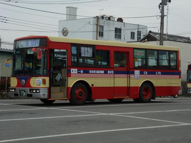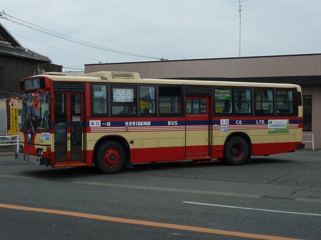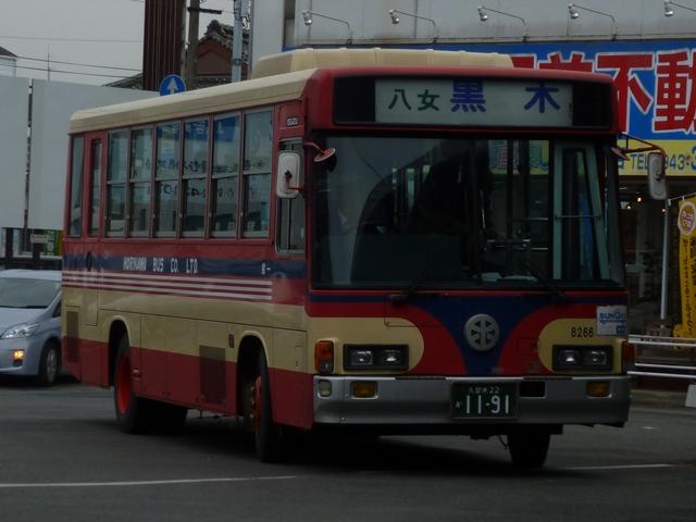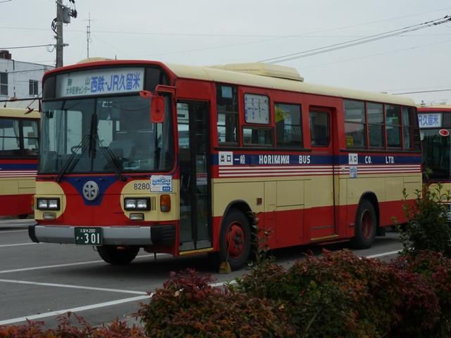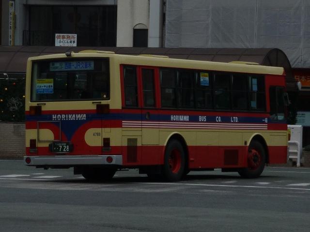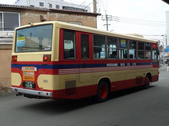 「バスマガジン50号」掲載の堀川バス特集を読み、2011年12月に久留米・福島(八女) へ出かけた際に記録した画像のよせ集め。当初は「バスマガジン50号」の感想めいたエ ントリに画像を追加する予定でしたが、更新するネタも無いので今回まとめて並べていき ます。出かけた当日は時折雨もぱらつく、まさにパッとしない天気。並べる画像も輪をか けてパッとしないことをあらかじめ御了承願います。 なお、型式・年式は「堀川バス最新車両ガイド」『バスマガジン50号』(2011),講談社 ビーシー/講談社 を参照しました。 車両コード:8266.KC-LR233J(98年車)。 まずは近年の移籍車導入により、画像の車両を含めていすゞLRが2台のみという自社 発注一般乗合車。扉側が記録出来ませんでしたが、見ることが出来たことを喜ばないと いけません。 型式を参照したバスマガジンによると、堀川バスでは4桁の車両コードを付番していると のことですが、付番法則については説明無し。頭3桁がメーカー及びサイズの連番+4 桁目はチェックデジットと推測しますがどうなんでしょうか。 車両コード:1995.P-HT233BA(89年車)。 車両コード:1015.P-HT233BA(89年車)。 現在一般乗合車の主力は川崎鶴見臨港バスからの移籍車。移籍車はいすゞメインと なっていますが、日野車も少数ながら在籍。古参格となったP規制車のHTツーステッ プ車。前後で車両が異なり失礼します。 車両コード:4789.KC-LT333J(96年車)。 いすゞ車は大型車・中型車どちらも移籍しており、大型車幅約9mサイズのLTも堀川バ ス入りしています。画像は富士ボディのLTツーステップ車。 車両コード:8280.U-LR332J(91年車)。 川崎鶴見臨港バスからの中型移籍車。富士8Eボディのほか、画像の富士6Eボディも 在籍しています。 車両コード:4844.KC-LV380L(97年車)。 再掲の画像になりますが、横浜市交通局からのいすゞLVワンステップスロープ付移籍車。 久留米競輪場無料送迎バスにほぼ専属して使われている模様。無料送迎バス専用車とす るには勿体無い感じもしますが、送迎バス利用者の年齢層を考慮するとむしろ適任なのか もしれません。 PR