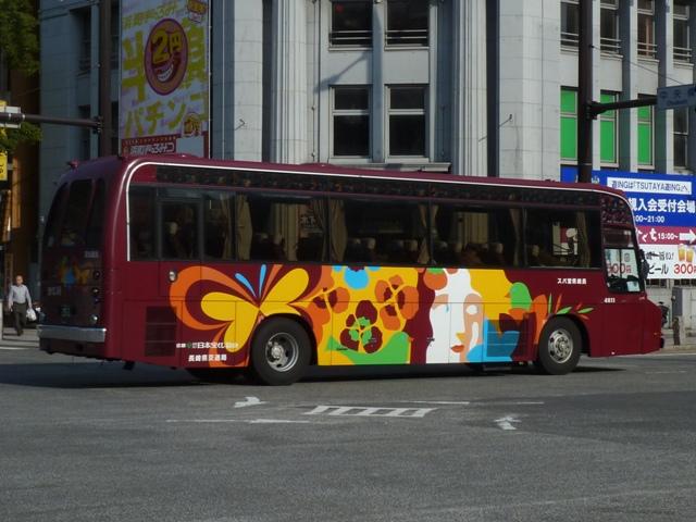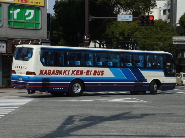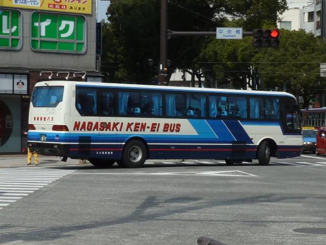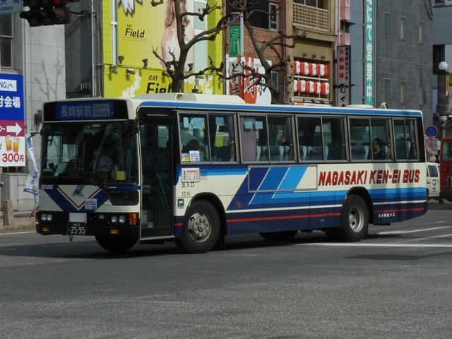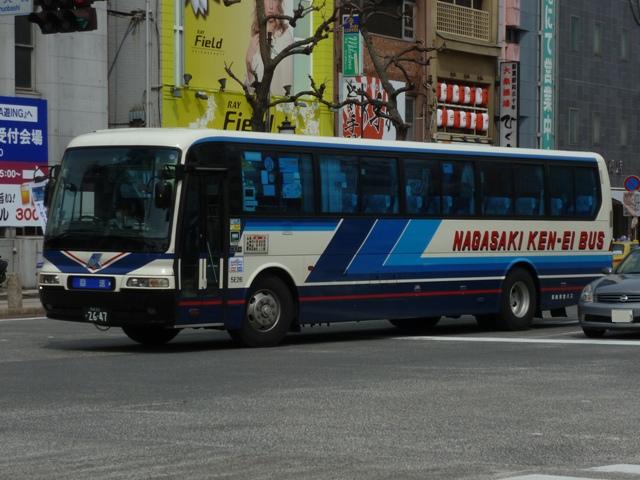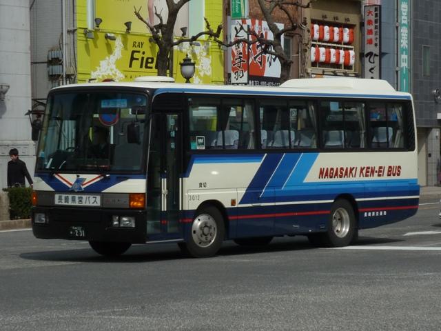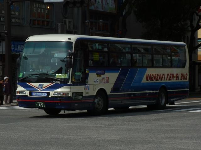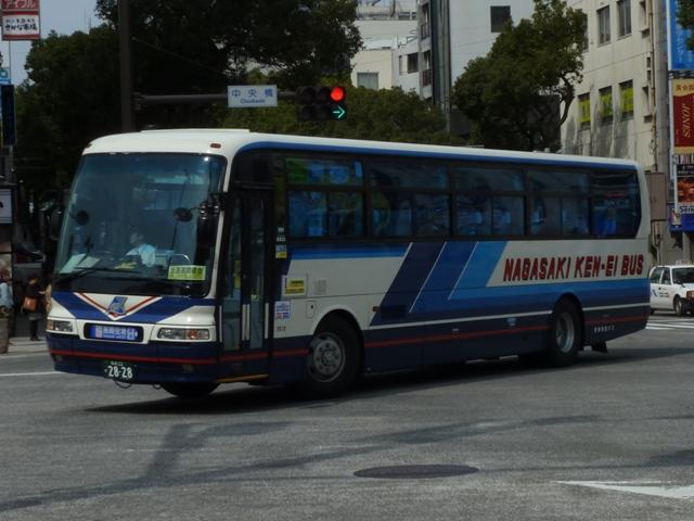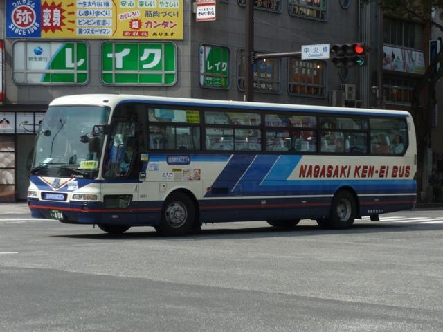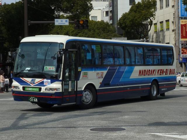 が、ベースは三菱ふそう初代エアロバスカタログカラーの色違いを採用しています。画像 の車両は折戸仕様でエアロバスK顔のMK短尺車。 長崎県交通局は配車エリアの拡大を目論み、新たに福岡県内に営業所を開設するなど 近年も積極的な営業を行っています。 <長距離路線車> 車号:5E16.U-MP618M改(93年車)。 続いて長崎~諫早間などの長距離路線運用にあたる車両。主に画像のMPトップドア車 がメインとなっています。塗装デザインは貸切車同様となっています。 車号:5E18.U-MP618M改(93年車)。 同年式の車両ですが、もう1枚並べておきます。 車号:4R11.U-MS726N改(92年車)。 エアロバスをボンネットバス風に改造したこんな車両も在籍。型式を参照したバスマガジ ンによれば、現在は雲仙特急バスを中心に運用されているとのこと。塗装デザインはなん ともアーティスティックな感じです。リヤ側しか記録出来なかったのが残念。 <長崎県央バス> 車号:1E17.P-MP618M改(89年車)。 長崎県交通局のいわゆる分離子会社となる長崎県央バス。2009年4月に長崎~諫早 間の一部路線を引き継いだほか、諫早・大村営業所の路線を受託運行しています。 長崎~諫早間の引き継いだ路線は画像の長距離路線転籍車で運行しています。側面表 記は「KEN-EI」を「KEN-OU」に変更しています。 <空港リムジン・県内特急バスなど> 車号:5E26.U-MS815S(93年車)。 最後に長崎空港リムジンバスや県内特急バス。よく見かけるのは折戸・側面全引違窓 仕様のニューエアロバススタンダードデッカーです。 車号:7E12.U-MS826P(95年車)。 U規制車のハイデッカーは貸切転用車。 車号:9E18.KC-MS815S(97年車)。 KC規制車もスタンダードデッカーが中心。まずはリヤ画像しか記録できなかった97年車。 車号:0E15.KC-MS815S(98年車)。 長崎と諫早を高速道路経由で結ぶ諫早シャトル。長崎空港リムジンバス車両の間合い 運用で運行。 車号:0E17.KC-MS815S(98年車)。 98年車のリヤ側画像。もはやただ画像を並べているだけですな。 車号:8E51.PJ-MS86JP(06年車)。 車号:9E53.PJ-MS86JP(07年車)。 PJ規制車のエアロバスも長崎空港リムジンバスとして運用中。スタンダードデッカーの 販売終了により、ハイデッカーでの導入となっています。空港リムジンバスにはこのほか エアロエースも在籍しているとのこと。 PR