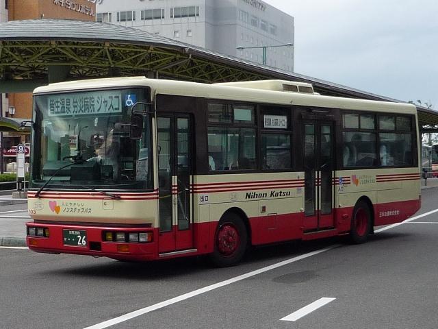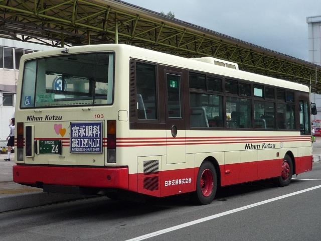 用者の目に触れる機会が少ない 」実際の事故報告を中心に紹介しています。 事業者訪問は95年以来の登場となる日本交通を中心に北部部分を引き継いだ京都交 通を紹介。特に路線バスを展開している鳥取地区は輸送環境・コミュニティバス事情・高 速バス・観光などについての現状をくわしくまとめています。小生が特に気になったのは、 都市間ツアーバスの影響を大きく受けているという都市間高速バスについて。「需要が 存在することが証明されているところに参入する、リスクを取らない経営がなぜ称揚され るのか理解に苦しみます 」という一文に事業者側の偽らざる本音を感じました。こういっ た表現が出てくるのも、「高速路線バスとローカル路線を併営し、事業規模を大きくする ことにより、共通する固定費の率を引き下げている 」というごく当たり前の事業モデルが あるから。「最近は高速路線バスの収益でローカル路線を維持する、いわゆる内部補助 を否定する意見も耳にする 」という意見に対して「理解に苦しむ 」とバッサリ。どうも最近 のバスラマは高速バスではなく「長距離移動バス」と言い換え、妙な理屈で自己正当化し たような意見が多く紹介されていたように感じていただけに、今号の事業者訪問はスッと 読むことが出来ました。 車両アルバムはどちらかといえば日本交通の車両をメインに掲載。ただ、どちらの車両も まぜこぜとなっているのでちょっと分かり難い印象をもちました。 ここで、いつものように小生が記録した日本交通の車両画像を何枚か並べていきます が、路線車の画像は2008年に米子で記録したもののみ。再掲のものばかりとなります。 鳥取200か26.KC-RM211GAN改(99年車)。2008年に記録したものを再掲。 まずは西工ボディのRMノンステップ車。掲載の在籍車両一覧によればUD車は日本交 通グループ全体で8台のみの少数派。なお、車両に表記されている3ケタ数字は「搭載 無線のコード番号であり客観性には欠ける 」とのこと。 鳥取200か132.KK-RJ1JJHK改(01年車)。2008年に記録。 側面サッシ窓仕様の日野中型ワンステップ車。日野の一般乗合路線車はダウンサイジ ングによりマイクロバスサイズのリエッセがまとまった台数在籍しています。 鳥取200か150.KK-HR1JEEE(02年車)。2008年に記録したものを再掲。 7mサイズのHR。画像の車両は米子市のコミュニティバス「だんだん」専用車です。 神戸200か2286.KK-MK23HH(00年車)。 三宮と六甲アイランドを結ぶ「サブローバス」で運用されるMKトップドア車。グループ会 社の日交シティバス所属車両で、小型サイズの正面LED行先表示がポイント。この画像 のみ2012年に記録したものです。 さて、今号のレポート記事では九州の大手事業者に登場したヒュンダイ・ユニバースのほ かにも、2012年3月に運行を終了した明石・呉・苫小牧の3ヶ所の公営バスの最終日を 紹介しています。 車号:1611.2012年3月に記録。 最終日の画像ではありませんが、運行終了が間近に迫った3月某日に記録した明石市 営バスの車両。