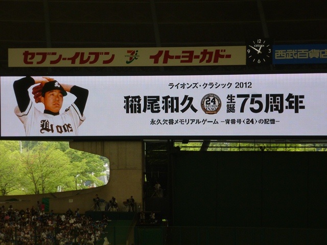 今年はやたらと野球観戦ネタを更新している拙ブログ。 今日も今日とて西武ドームへ野球観戦へ出かけておりました。 この日の試合は「ライオンズクラシック2012」、ここ数年のライオンズ球団恒例となった 懐古イベントです。埼玉西武ライオンズ球団では稲尾和久氏の実績やこれまでの功績を 讃え、背番号24を永久欠番とすることを発表しました。今年のライオンズクラシックはベ ンチ入り選手・コーチ・監督全員が背番号24の西鉄ライオンズユニフォームを着用すると いう日本初試み。 全員背番号24なので誰が誰だか・・・。先週が「らき☆すた」で今週が西鉄ライオンズ、 イベントのふり幅が大きすぎます。 埼玉西武ライオンズ 3 - 3 北海道日本ハムファイターズ 試合は延長10回特別ルールにより引き分け。ライオンズが終盤押し気味に進めるも決め きれず。それにしても2回表のトリプルプレーには驚きました。トリプルプレー自体初めて見 ました。水島漫画を見ているような鮮やかさをヘルマンに感じました。 PR