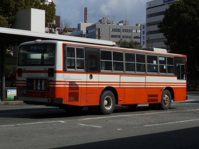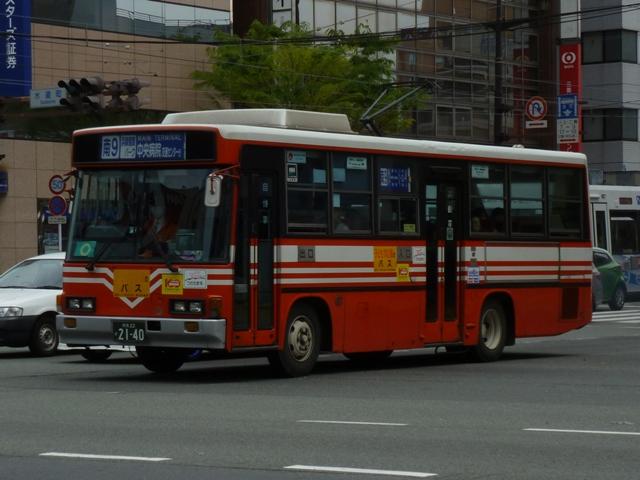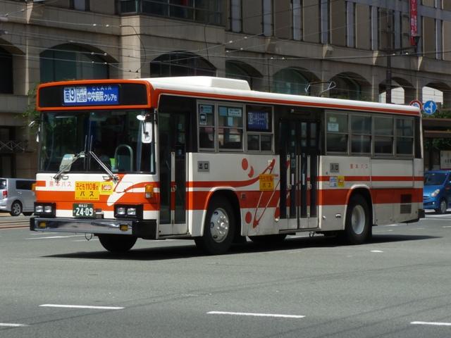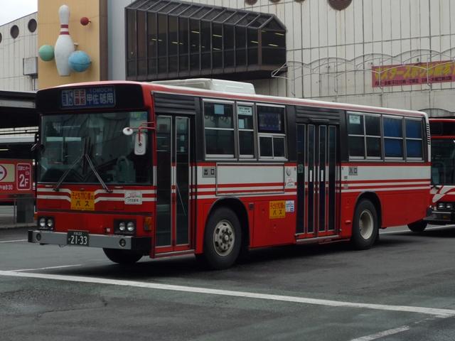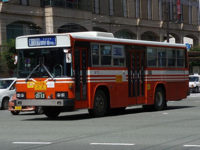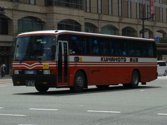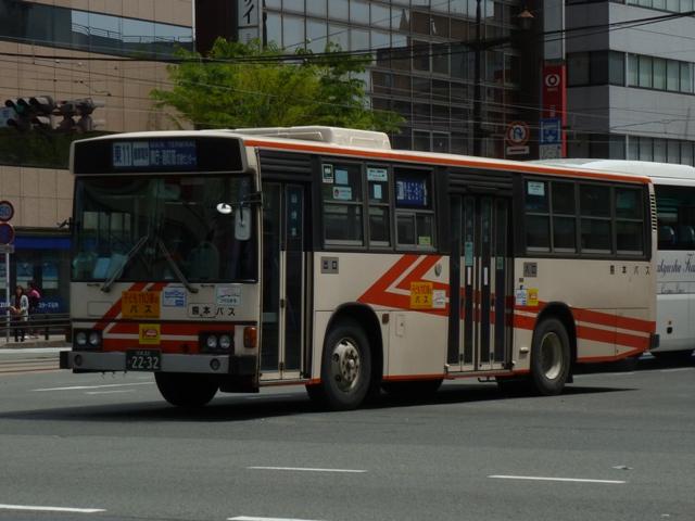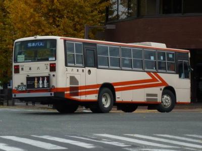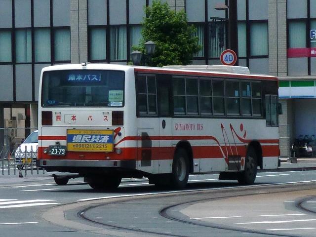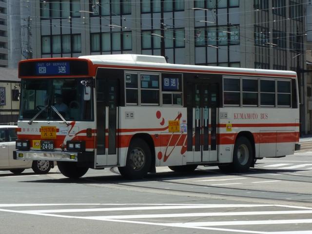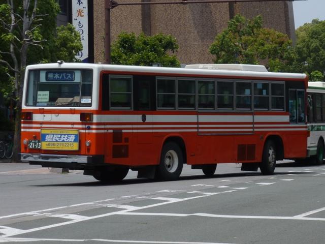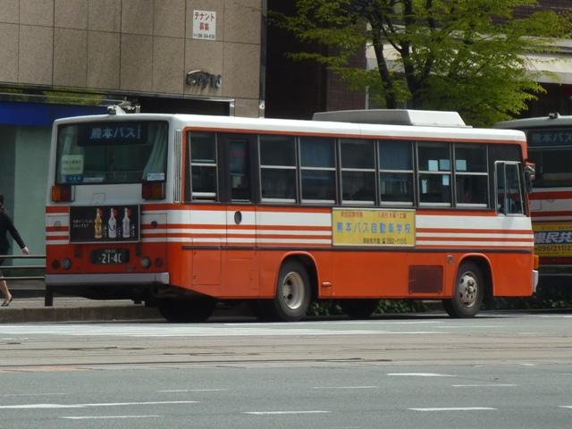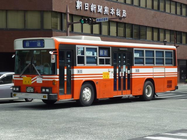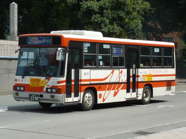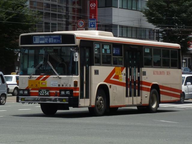 「熊本で見たバス2012」と題したバス画像のよせ集めシリーズ。 今回はその1からちょっと間が開いてしまった熊本バス編です。その2では、記録出来た 登録番号熊本22か1800~2400番台の一般乗合車両を並べていきます。 なお、一部2011年に記録した画像も含むことをあらかじめ御了承願います。 熊本22か2113. 前中4枚折戸仕様の西工ボディ日野車。県内他社ではそろそろ代替完了となる年式で すが、熊22かナンバーが現役の熊本バスですからまだまだ第一線で運用中です。 熊本22か2133.上は2011年6月に記録。 日野車は同時期に純正車体も導入しています。 ヘッドライトは標準の丸目タイプであったり、テールライトが観光ボディでおなじみの サイコロテールだったりと細かい仕様が西工ボディ車と異なっています。 熊本22か2140. 熊本バスはUD以外の3メーカーを導入。いすゞ車は純正車体の中型LRを導入。 熊本22か2152. 三菱ふそう車は貸切兼用車を導入。観光顔のMPではなく、リヤ側をご覧いただければ お分かりのように正真正銘のMSです。エアロバスのスタンダードデッカーで、矢部方面 など長距離路線にはありがたい仕様となっていますが、間合い運用?なのか短距離路 線に入ることもしばしば。 熊本22か2232.下は2011年12月に記録。 純正車体の日野大型車。熊本バスは1990年代後半に車体塗装デザインを現在のもの に変更しましたが、画像の車両は97年ごろ短期間採用された過渡的な塗装デザインと なっています。直線的なラインは社章をモチーフとしたと思われ、ボディ再生のタイミング からこの塗装に塗り替えられたものと推測。 熊本22か2254. 同じく過渡的デザインの塗装に塗り替えられた西工ボディ車。従来の塗装に比べ、白地 に直線主体の塗装デザインで簡略された印象。 熊本22か2255.2011年9月に記録。 同時期に登場した車両ですがボディ再生のタイミングが異なったらしく、画像のいすゞ車は 旧塗装デザインのままとなっています。 熊本22か2379.上は2011年9月に記録。 純正車体の日野車。このあたりの車両からボディ再生に合わせて現行塗装デザインに 塗り替えられています。直線から一転して動きのあるラインが特徴。 熊本22か2390. ということで、現行塗装に塗り替えられた車両シリーズ。いすゞの純正車体中型車。 熊本22か2408. 現行塗装に塗り替えられた西工ボディ大型車。リヤ側を記録していませんが、おそらく 日野車。 熊本22か2409. 現行塗装に塗り替えられた西工ボディのいすゞ車。 PR