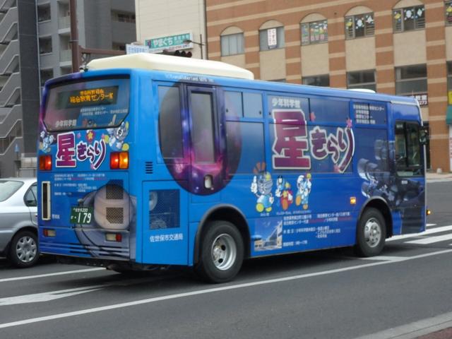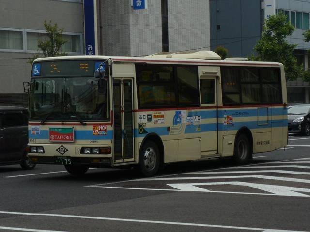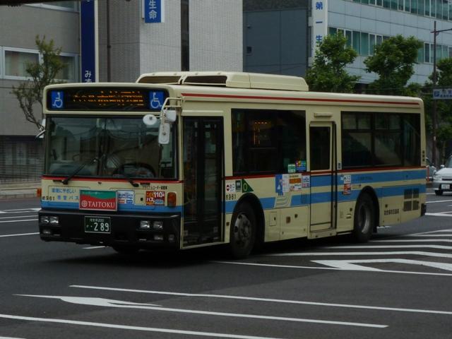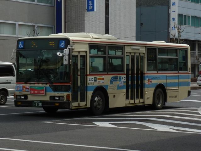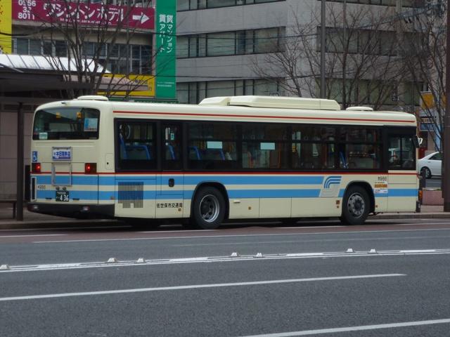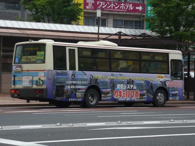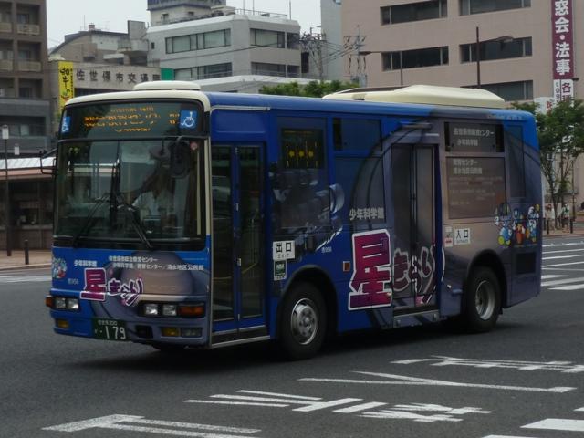 「佐世保で見たバス2012」と題したバス画像のよせ集め。2月と5月に記録したものを とりまぜて並べていきます。今回の佐世保市交通局編その2では、記録出来た佐世保 200かナンバーの生え抜き車両を並べていきます。 なお、ノンステップ車の型式・年式は『バスラマインターナショナル』,ぽると出版 各号掲 載の「ノンステップバス採用実績」を参照しました。 車号:市928. 佐世保市交通局では久々に登場した富士ボディ架装の新車、UDのRMです。フロントバ ンパーを塗り分けたことでおしゃれ感がアップしています。 ちなみに佐世保市交通局では90年代後半から東京都交通局からまとまった台数の大型 移籍車を導入し、車両代替を進めました。 車号:市943. 自動車バリアフリー法施行により、バリアフリー適合のいすゞエルガワンステップ車を 導入。大型車の新車導入は西工ボディのP規制車以来となり、中扉は4枚折戸仕様を 継続採用しています。 車号:市950. 車号:市951. 三菱ふそうのMPワンステップ車も導入。こちらは銀サッシです。 車号:市952. 中型のワンステップ車も登場、三菱ふそうのMKワンステップ車。前面広告掲示枠が上 部に移動した関係で、フロントに市章が復活しています。 車号:市956.KK-ME17DF(03年車)。 マイクロバスサイズの三菱ふそうMEも導入。長崎県内では島原鉄道に次ぐノンステップ 車導入事例となりました。画像の車両は少年科学館「星きらり」というプラネタリウムのラ ッピング車となっており、総合教育センター前への路線で運用しているようです。 車号:市961.PKG-RA274KAN(08年車)。 3台在籍する西工ボディの尿素RA大型ノンステップ車。07年から年1台ペースで導入し ています。 車号:市969.PDG-RM820GAN(10年車)。 車号:市966.PDG-RM820GAN(10年車)。 2010年に4台導入したRMノンステップ車。このRMが佐世保市交通局最後のUD 及び西工ボディの新車導入となりました。前後で車両が異なり失礼。 車号:市971.PDG-KR234J2(11年車)。 11年に2台導入した日野KRノンステップ車。佐世保市交通局で日野車の新車導入は 久々で、レインボーツーステップ車の次がいすゞのOEM車となりました。 車号:市986.LKG-LV234L3(11年車)。 2011年度は大型ノンステップ車と中型ノンステップ車をそれぞれ1台導入。まずは大 型ノンステップ車のいすゞエルガ。10穴ホイールのLKG規制車です。 車号:市989.SDG-LR290J1(12年車)。 中型ノンステップ車は年明けに登場、こちらもいすゞ車でエルガミオ。 PR