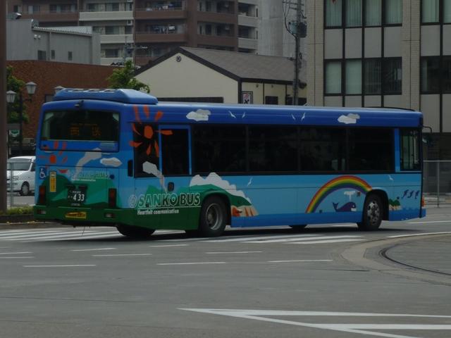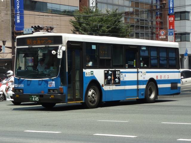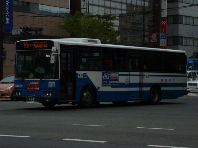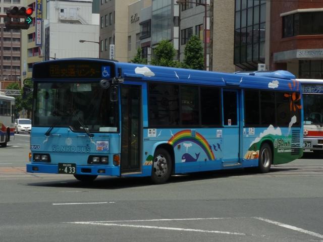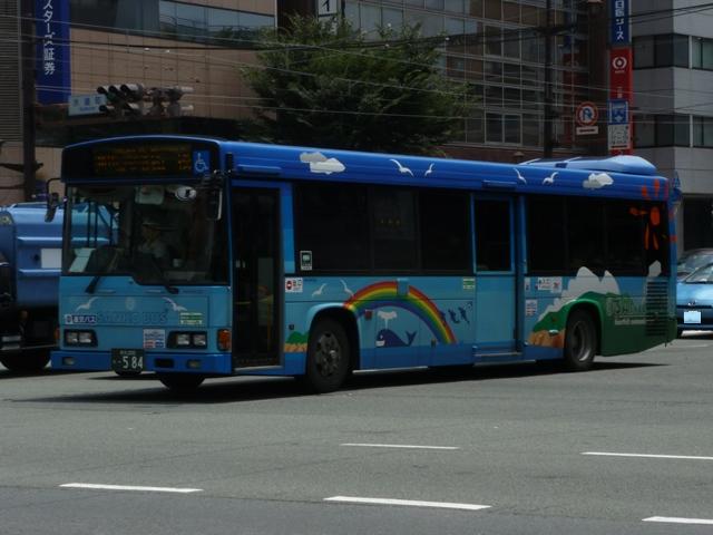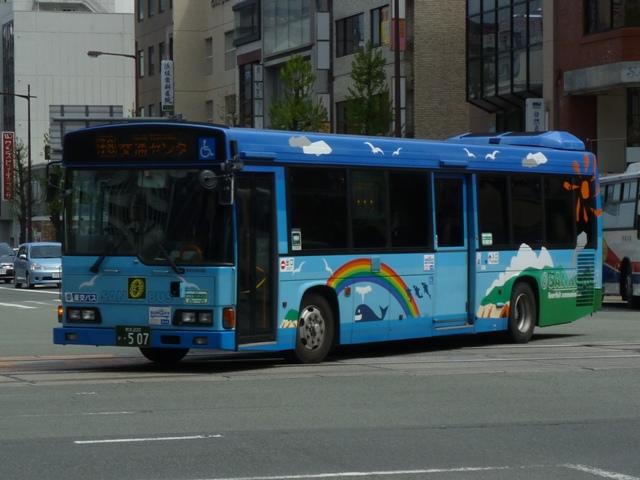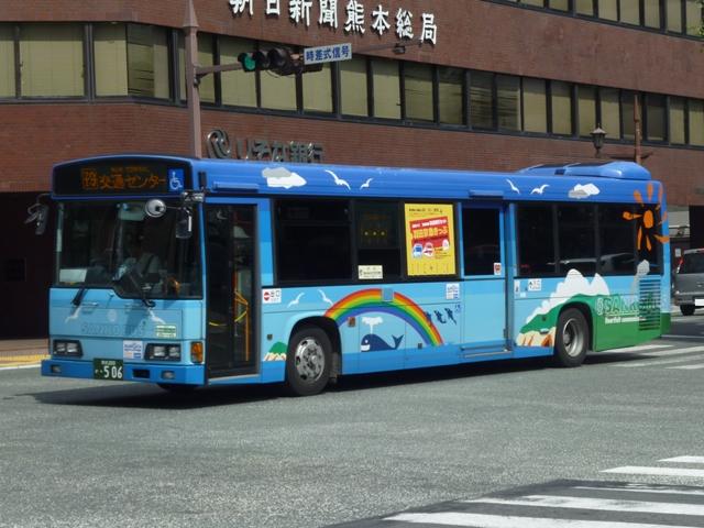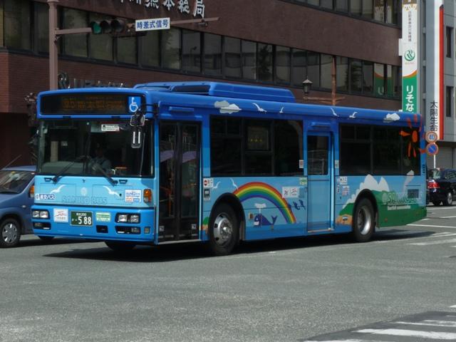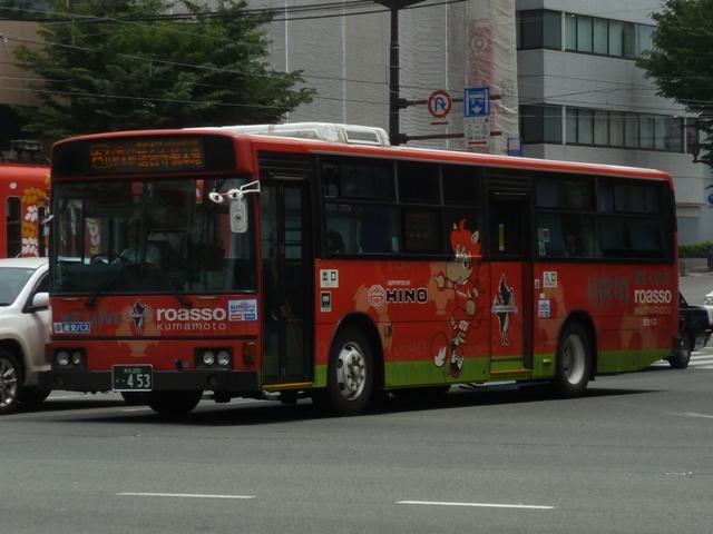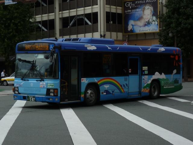 「熊本で見たバス2012」と題したバス画像のよせ集めシリーズ。 九州産交グループ編その5では記録出来た登録番号熊本200か400・500番台の一 般乗合車を並べていきます。中途半端な括り方となっているのは、熊本200か600番台 以降を2011年編(その1・その2)で並べている故。また、並べている画像は九州産交バ ス所属車と地域子会社を統合した産交バス所属車が混在していることをあらかじめ御理 解・御了承願いします。 なお、型式・年式は「九州産業交通グループ在籍車両一覧」『バスラマインターナショナル 107号』(2008),ぽると出版 を参照しました。 熊本200か433.PK-HR7JPAE(05年車)。 産交バスにRXが大量導入された影響からか、九州産交バスへの新車導入は相変わらず 少ない状況。05年は日野HR10.5mサイズを2台導入。非常口位置などが変更された PK規制車です。 熊本200か445.U-LV324K改(91年車)。 少ない新車導入だけでは、景気良く導入してきたP規制車の代替にメドがつかない。という ことで、九州産交バス本体にも移籍車導入を開始。川崎鶴見臨港バスからキュービックボ ディのいすゞLV移籍車。行先表示は当初からLED式で登場しています。 熊本200か453.U-HT2MMAA改(93年車)。 京浜急行バスからの日野HTワンステップ移籍車。導入第一陣のこの車両は現在ロアッ ソ熊本ラッピング車となっています。 熊本200か464.U-HT2MMAA改(93年車)。 同じく京浜急行バス日野HT移籍車。 熊本200か506.PK-HR7JPAC(06年車)。 06年導入の新車はお馴染みのHRのみですが、画像の1台だけいすゞブランドの「エルガJ」 で導入。ディーラーとの付き合いなど、色々あるのでしょう。 熊本200か507.PK-HR7JPAE(06年車)。 こちらは日野のHR。 熊本200か577.U-LV324L改(93年車)。2011年に記録。 キュービックボディのいすゞLVは国際興業バスからの移籍車。中扉4枚折戸仕様車な ので、生え抜き車両に見えなくもありません。 熊本200か584.BDG-HR7JPBE(08年車)。 熊本200か586.BDG-HR7JPBE(08年車)。 08年はノンステップバスを久しぶりに複数車種導入。まずはおなじみHR10.5mサイズ。 BDG規制車が初登場しました。 熊本200か587.PKG-LV234N2(08年車)。 99年以来となる大型ノンステップ車も登場。九州産交バスでは初導入となる純正ボディの いすゞエルガ。 熊本200か588.PKG-KV234N2(08年車)。 日野のブルーリボンⅡは西工ボディで導入。 PR