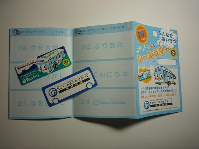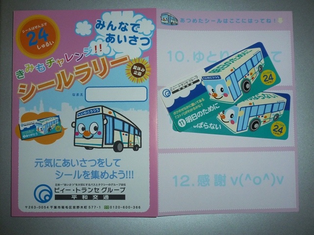 ビィー・トランセグループの平和交通は2010年に、バス乗車時に各国の言葉で挨拶 をして24種類のシールを集める「チャレンジ!シールラリー24」というイベントを開催し ていました。昨年は残念ながら行われませんでしたが、今年は「きみもチャレンジ!シ ールラリー」として復活。乗務員の方に挨拶をしてシールを集めるというコンセプトに変 わりはありませんが、今年は単純に「シールをください!」でOKの模様。「ハロー!シー ルください」と、自意識過剰からこっぱずかしさを感じて言いたくても言えなかった内気 なボーイズ&ガールズ達も、これならの集めることが出来ますね←なんだそれ。 なお、配布されるシールは2010年と同デザインとなっています。 ちなみに小生は今年も2枚集めたところで断念しております。 せっかくなので、今回は海浜幕張駅周辺で記録した平和交通の車両画像を数枚ほど 並べていきます。平和交通は京成電鉄(当時)と共同運行というかたちで幕張ベイタウ ン地区の路線バス運行に参入。これまでと全く異なる、黄色一色にBAY TOWN BUS 表記の「ベイタウンカラー」の専用車により運行しています。 なお、型式・年式は「ビィー・トランセグループ在籍車両一覧」『バスラマインターナショナ ル121号』(2010),ぽると出版を参照しています。 社番:173-019HN52.KL-HR1JNEE(01年車)。 幕張ベイタウン地区の路線は堅調に推移し、運行開始にあわせて登場した中型車から 大型化していきました。大型化の第一陣としてHRの10.5mサイズが登場しましたが、 後述する大型車導入により画像の車両はボディ表記の「BAY TOWN BUS」からBAY 部を消し、ベイタウン専用車の第一線から離れた模様。この日は先月から運行を開始し た稲毛駅と海浜幕張駅を結ぶ新路線の運用に入っていました。それにしても、久しぶりに 幕張地区で平和交通のカラー方向幕を見た気がします。 さて、このHRは数年前からヘッドライトベゼルを上下さかさまに取り付けていることで話 題となりました。現在もこの状態となっていることから、単なる付け間違えではないようで す。これはこれでサマになっているから不思議です。 社番:181-039HN52.KL-HR1JNEE(03年車)。 ちなみに平和交通に在籍する全てのHRがヘッドライトベゼルを上下さかさまに取り付けて いるわけではありません。今のところベイタウンカラーの車両だけにとどまっています。 社番:301-048H152.KL-HU2PMEA(04年車)。 ベイタウンバスにいよいよ大型車が登場。04年に登場したBRCワンステップ車。 社番:374-060HN52HV.ACG-HU8JLFP(06年車)。 千葉BRCハイブリッド旋風の第一陣となった平和交通。ベイタウンカラーの専用車も登場 しています。 PR