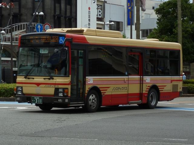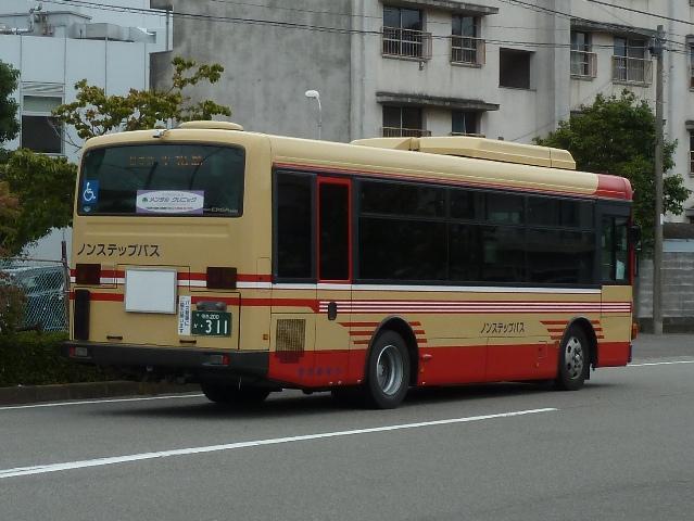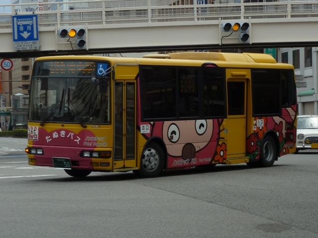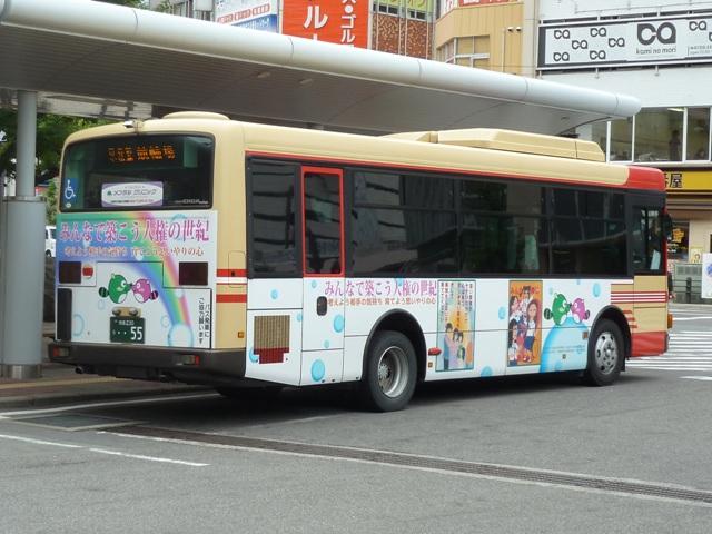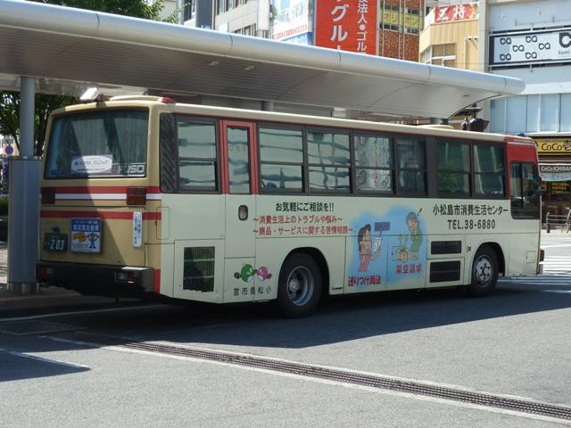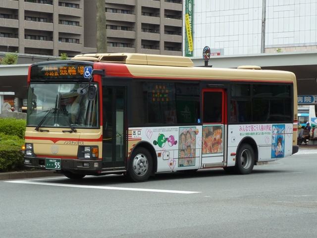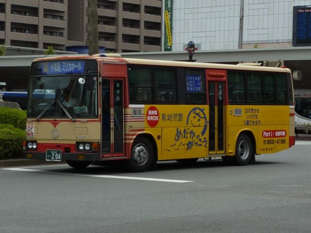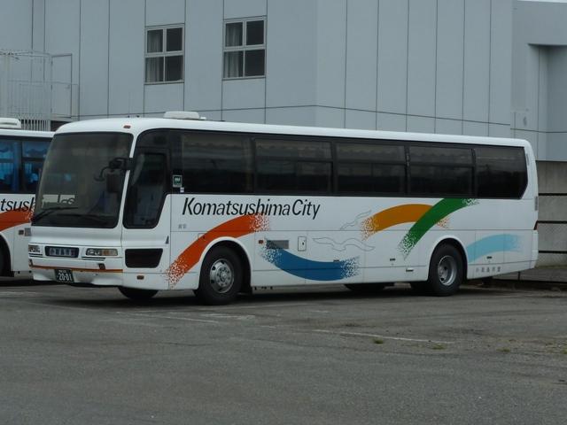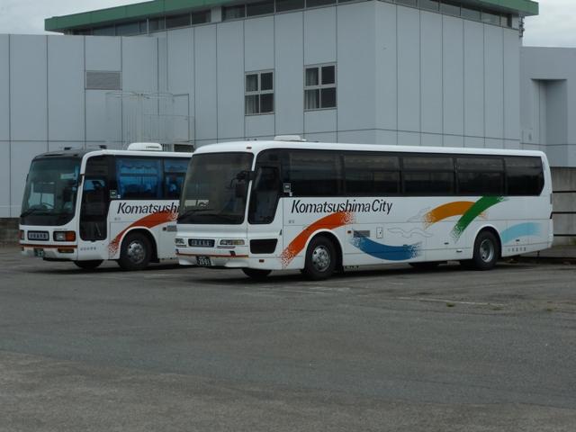 8月に徳島へ出かけた際に記録したバス画像のよせ集め「徳島で見たバス2012」。 徳島県内では徳島市・鳴門市・小松島市の3市で公営バスを運行していますが、徳島 市は路線移管により縮小、鳴門市は今年度をもって撤退と衰退著しい状況です。 そして小松島市も6月に発表した「小松島市運輸事業基本計画」に基づき、10月に一部 路線廃止を含む再編を行います。基本計画では、25年度中に市営バスを継続するかど うかを決定するということも盛り込まれていることから、小松島市営バスの命運が決まる 1年となりそうです。画像は小松島市営バス営業所前の路線案内板。 ということで、シリーズ最終回となる今回は、小松島市営バスこと小松島市運輸部の記録 出来た車両を並べていきます。 なお、ノンステップバスの型式は『年鑑バスラマ』・『バスラマインターナショナル』各号掲載 の「ノンステップバス導入一覧表」を参照しています。また、年式は判明したものについての み記しています。 徳22か826. まずは前後扉仕様の三菱ふそうMK古参車。もちろん「徳22か」ナンバーで、バンパーや テールライト周りなどのメッキパーツなどのこだわり仕様がポイント。4度目の徳島訪問で 初めて見ることが出来ましたが、正直まだ在籍していたことに驚き。 徳島22き204. 徳島22き203. 上下で車両が異なり失礼。前中扉仕様となった三菱ふそうMK。 今回記録出来たツーステップ車は以上、「痛快エブリディ」ラッピングが残るモデルチェン ジ後のMKなどは2011年編を御参照願います。 徳島230い50.KK-MJ26HF改(02年車)。 小松島市営バス初導入のノンステップ車となった三菱ふそうMJ。小松島名物のタヌキに 因んだ特別カラーで、「たぬきバスPON!POKO号」。となっています。 登録番号は希望番号で取得していますが、市営バス運行50周年に因んだものと推測。 徳島200か156.KK-LR233J1。 長らく三菱ふそう車の導入が続いてきた中で登場した、KK規制車のいすゞエルガミオ ノンステップ。以後小松島市営バスはいすゞ車の導入となります。 徳島230う55.PA-LR234J1(06年車)。 PA規制車のエルガミオノンステップ。登録番号はおそらく、市営バス運行開始55周年に 因んだものと推測。 徳島200か311.PDG-LR234J2(10年車)。 PDG規制車のエルガミオノンステップ。毎年とはいかないまでも、数年おきに新車導入が 続けられています。先ほど紹介した「小松島市運輸事業基本計画」によれば、25年度に 新車1台を導入し3台代替廃車する計画とのこと。 小松島市営バスは貸切バスに力を入れていることで知られていました。しかし、安定収 入だった小松島競輪場送迎バスが廃止となり、今年度中に減車し、1台のみとなる模様。 小松島港バス停前の貸切車庫には、いわゆるパンダマスクのエアロバスとニューエアロ バス2台が並んでいました。 徳島230い2001.