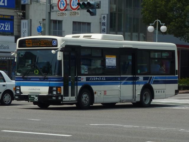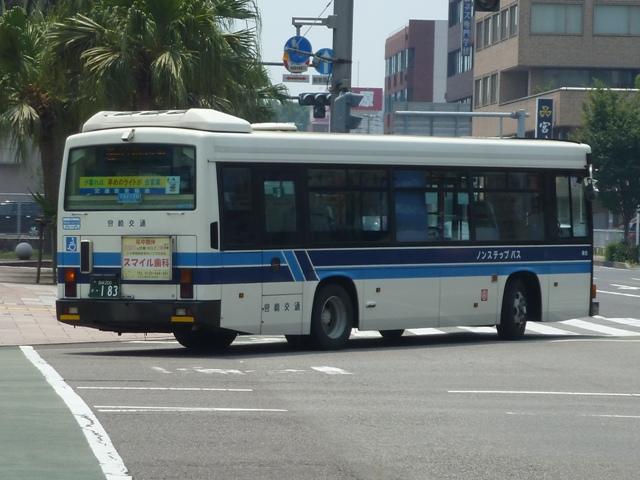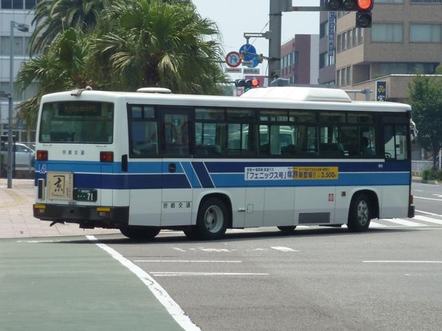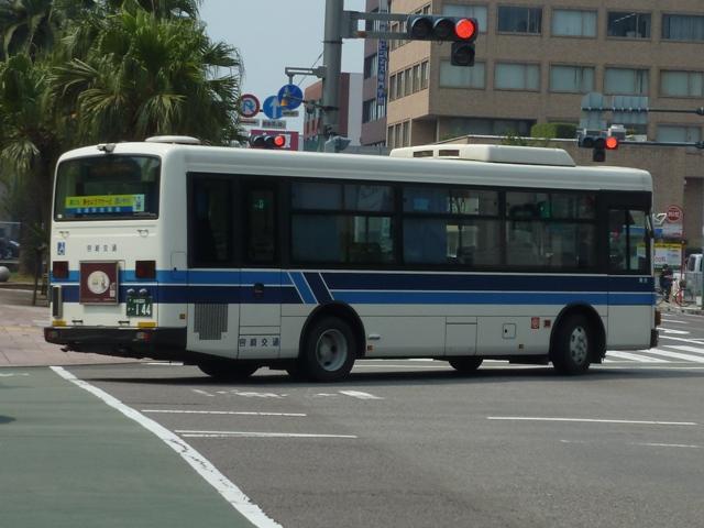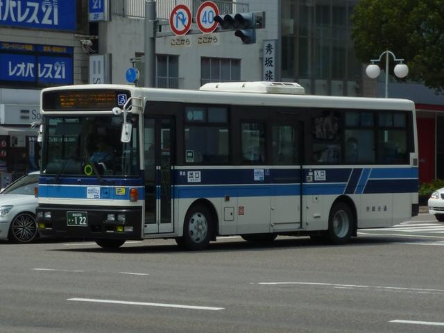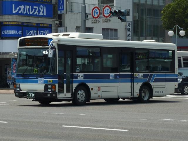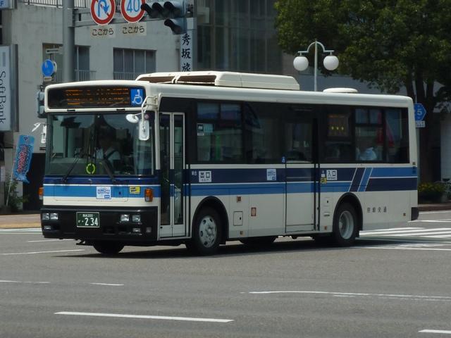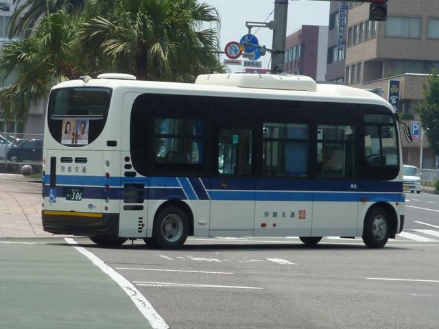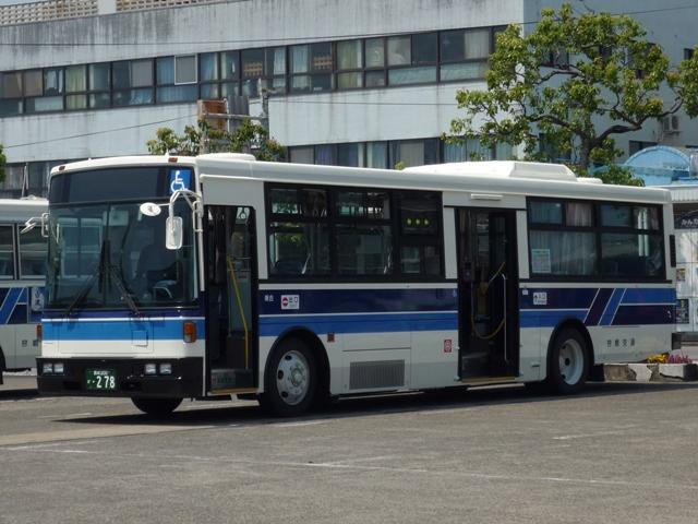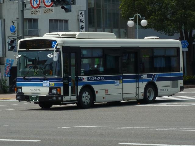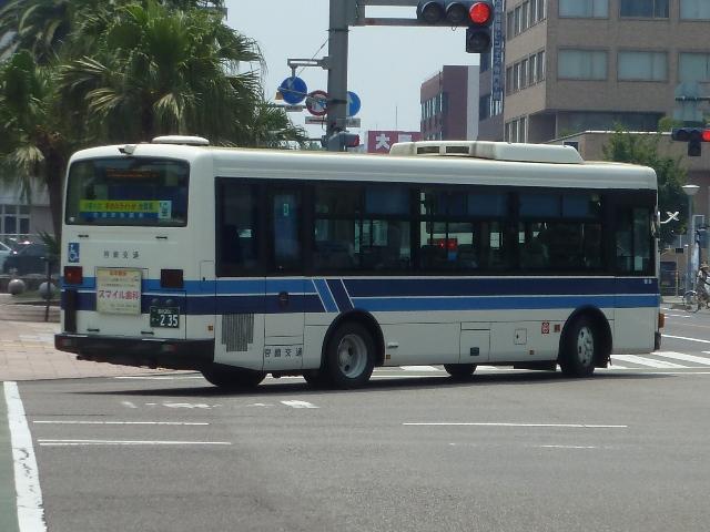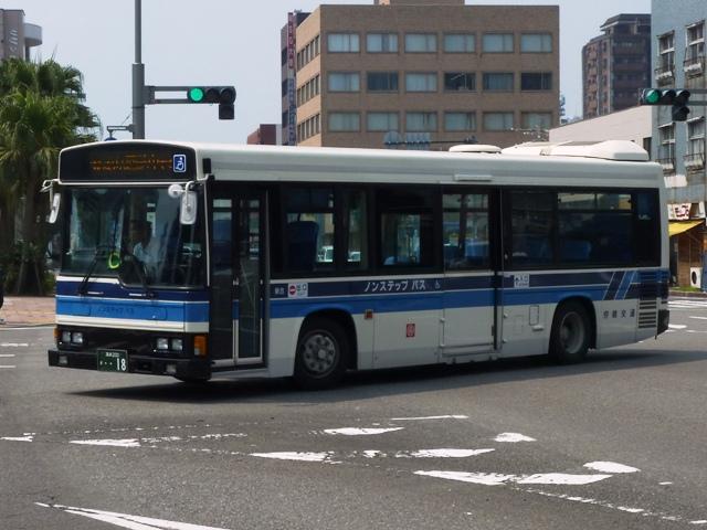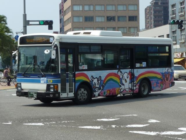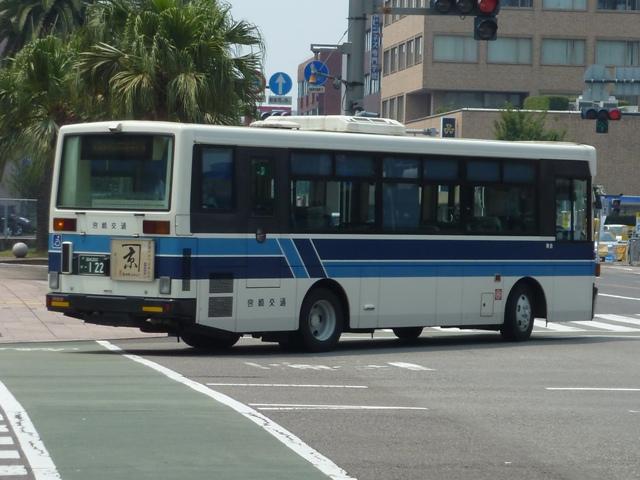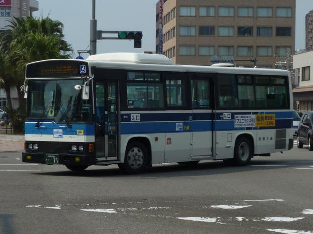「宮崎交通のバス2012」と題したバス画像のよせ集め。 シリーズ最終回となるその4では、00年以降に導入された一般乗合車のうち記録でき たものを並べていきます。 なお、型式・年式は「宮崎交通所有車両全データ」『バスマガジン16号』(2006), 三推社/講談社 及び、『年鑑バスラマ』・『バスラマインターナショナル』各号掲載の「ノン ステップバス導入一覧表」を参照しています。 宮崎200か18.KK-HR1JKEE(00年車)。 前年に続きノンステップ車を導入。まずは9mサイズの日野HR。 宮崎200か25.KK-LR233J1(00年車)。 いすゞ車のノンステップバスは00年に初登場。LRのノンステップバスを2台導入。 宮崎200か32.KK-HR1JKEE(00年車)。 宮崎200か31.KK-HR1JKEE(00年車)。 前後で車両が異なり失礼。00年導入のHRをもう2台ほど。KK規制車のHRは00~ 03年の間に10台導入しています。 宮崎200か71.KK-RJ1JJHK改(01年車)。 ノンステップ車と並行してワンステップ車も導入していますが、導入台数自体が少ない時 期ということもあり宮崎交通在籍車両からみれば少数派です。まずは2台のみ在籍する 日野RJのワンステップ車。 宮崎200か92.KK-LR233J1改(02年車)。 いすゞLRのワンステップ車は日野RJに比べればまとまった台数在籍。この車両は小学 生対象のデザインバスコンテストの受賞作をラッピング掲示しています。もともと小さい絵 を拡大しているため、微笑ましさが薄れてしまい残念。 宮崎200か122.KK-RM252GAN(03年車)。 西工ボディのRMワンステップ車。記録出来ませんでしたが、宮崎交通では富士ボディの RMワンステップ車も導入しています。 宮崎200か144.PA-LR234J1改(04年車)。 PA規制車となったいすゞLRワンステップ車。 宮崎200か183.PB-HR7JHAE(05年車)。 日野HRはPB規制車から非常口位置を後輪後位置に変更。宮崎交通は引き続き9mサ イズを導入しています。 宮崎200か234. 純正ボディの導入が続いていたいすゞLRにまさかの西工ボディ架装が登場。画像の車 両は増備車です。エアコンは純正ボディと異なりデンソーを装備。リヤ側画像が記録でき ず残念。 宮崎200か235. もちろん純正ボディも導入しています。 宮崎200か268. PDG規制車のいすゞLRワンステップ車。この頃の宮崎交通は移籍車の導入も行われ ましたが、本格的な導入に至らず。元京王のJPが試験導入車両だったのが結果的に 良かったのか悪かったのか・・・。 宮崎230あ306.BDG-HX6JLAE。 09~10年は日野ポンチョをまとまった台数導入。ローカル部だけでなく、宮崎市内に も活躍の場を広げています。希望番号を採用しているため登録年がよくわからず。 宮崎230あ319.PDG-KR234J2(11年車)。 11年は久々に中型ノンステップ車を導入。1つ目ヘッドライトの日野KRノンステップ車 が宮崎交通に初登場しました。 PR