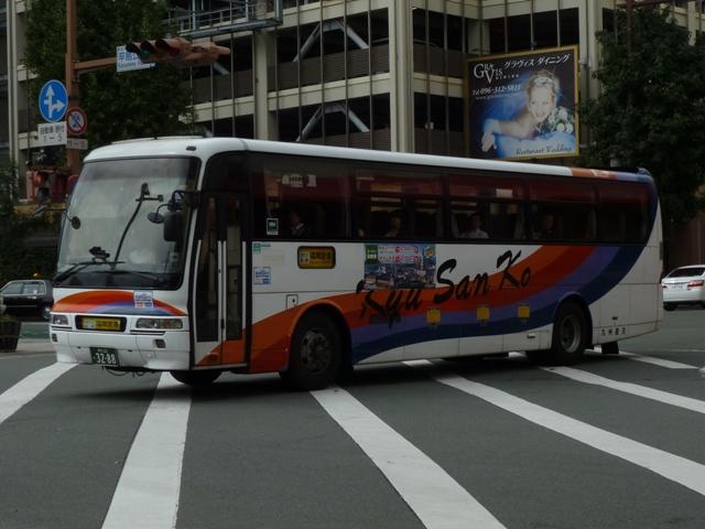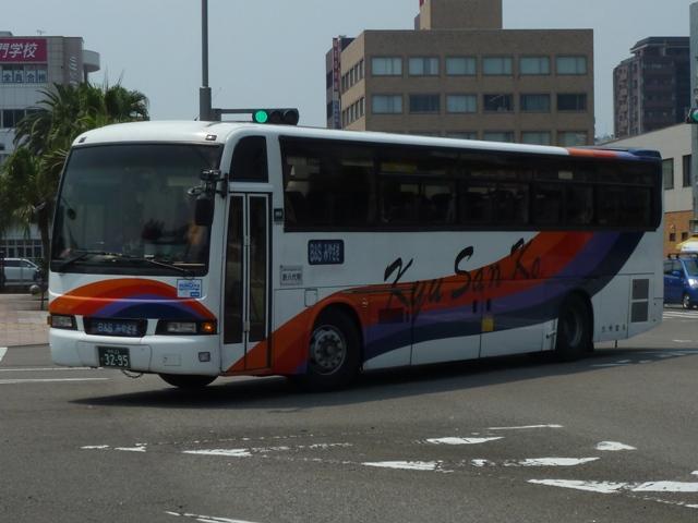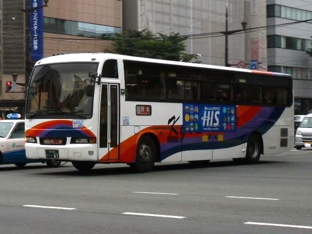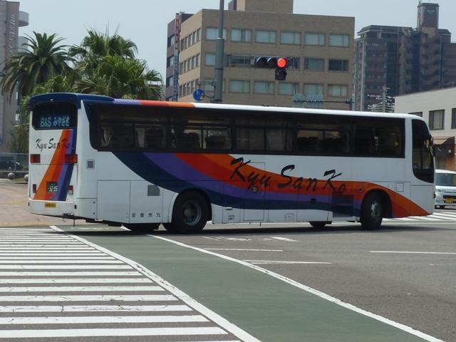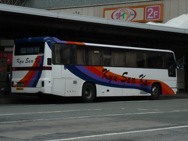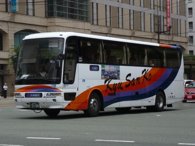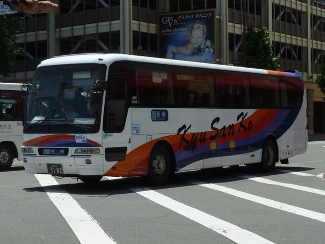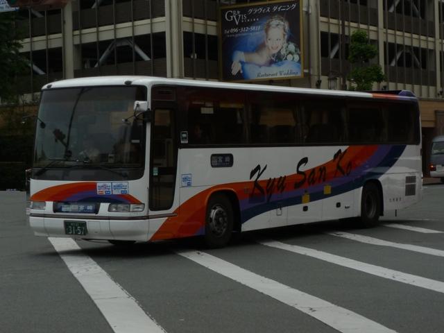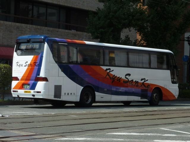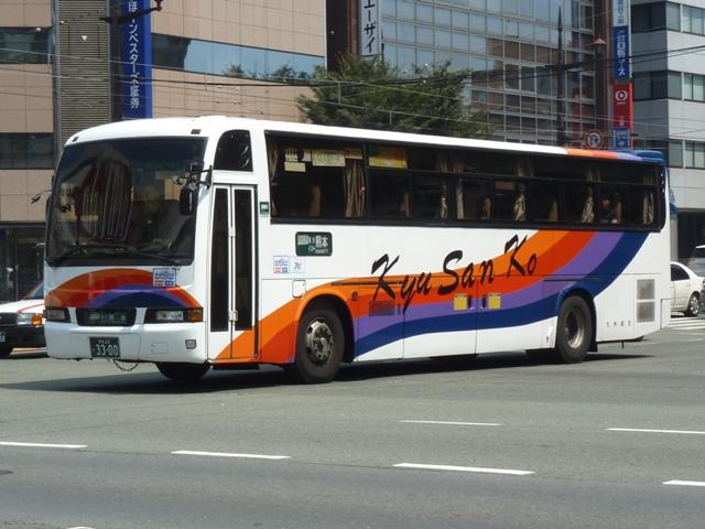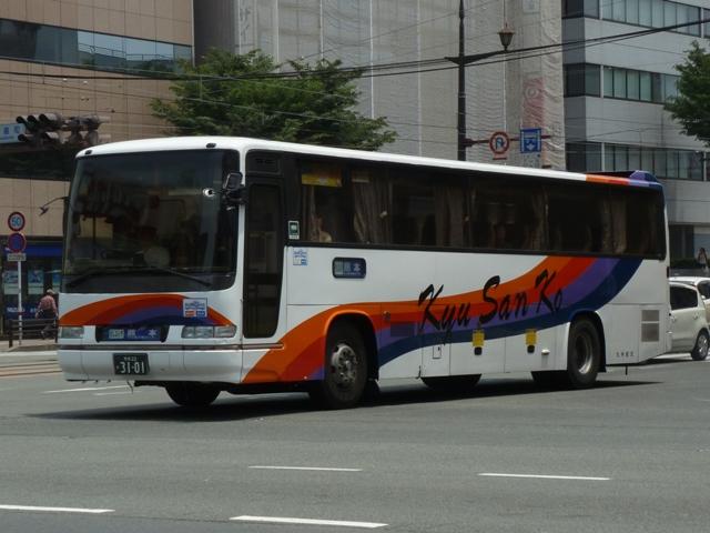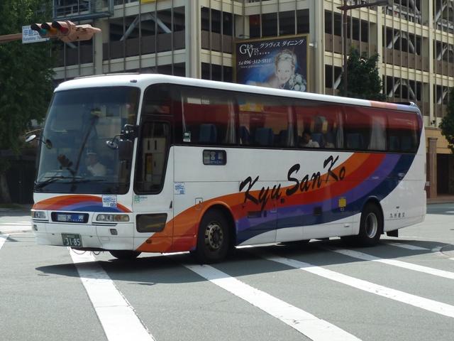 「熊本で見たバス2012」と題したバス画像のよせ集めシリーズ。 九州産交グループ編その9では記録出来たKC規制車の高速バスや特急・快速などに 運用される自社発注車両を並べていきます。 並べている画像は九州産交バス所属車と地域子会社を統合した産交バス所属車が混 在していることをあらかじめ御理解・御了承願いします。 型式・年式は「九州産業交通グループ在籍車両一覧」『バスラマインターナショナル107号』 (2008),ぽると出版 を参照しました。 熊本22か3101.KC-RU3FSCB(96年車)。 高速車・貸切車用の日野セレガはFSグレードを導入してきた九州産交。KC規制車も 引き続きセレガFSを導入。この車両はスイング扉+側面固定窓の偏心3列シート仕様 となっています。 熊本22か3104.KC-MS822P(96年車)。 トランク部に仮眠室を装備し、夜行運用可能なエアロクィーンⅠ。この日は小倉行「ぎん なん号」の運用に入っていましたが、行先方向幕は「九州産交」で紙を表示して代用。ど うやらイレギュラー的な運用だった模様。 熊本22か3157.KC-RU3FSCB(97年車)。 97年導入車から後部の行先表示サイズを拡大。高速車でこのサイズを採用したのは珍 しい事例です。画像の車両はセレガFSで、上は宮崎行「なんぷう号」・下は佐世保行「さ いかい」号の運用に入っていたことから、特に運用路線が決まっていない模様。 熊本22か3182.KC-MS829P(97年車)。 スイング扉+側面固定窓で偏心3列シート仕様のエアロバス。通常2本のトランクを3本 としているのが特徴。トイレが中央右側にある関係でこのような仕様にしたのでしょうか。 この日は長崎行「りんどう号」の運用に入っていました。 熊本22か3185.KC-MS822P(97年車)。 96年導入車両同様、夜行便運用可能なエアロクィーンⅠ。後部の行先表示はスーパー ハイデッカーも大きなものを装備しています。この車両も「なんぷう号」の運用に入ってい ました。 熊本22か3207.KC-RU3FSCB(98年車)。 スイング扉ながらフロント2枚ガラス+側面全引違窓仕様とやや安っぽく見えてしまうセレ ガFS。九州横断バスを運行していた九州国際観光からの引継ぎ車です。気球が描かれ た塗装は九州国際観光末期の「九州横断バス」標準デザインだった模様。現在も九州横 断バスで運用中。 熊本22か3288.KC-MS829P(98年車)。 折戸+側面T字窓、4列シート仕様で福岡行「ひのくに号」用とに登場したエアロバス。 97年導入車と同じく2本トランクを3本トランクにした仕様となっています。現在は画像の ように「ひのくに号」のほか、鹿児島行「きりしま号」など4列シート運用路線で活躍。 熊本22か3300.KC-RU3FSCB(98年車)。 高速車で久々となる西工ボディ架装車が登場。西工C-Ⅰボディの日野車で、「ひのく に号」専用車として導入。東京空港交通など空港リムジンバス用途で多く見られる左右 開閉式のトランクが特徴。 熊本22か3295.KC-RU3FSCB(98年車)。 「熊本」ではなく「宮崎」で見たバスになりますが、西工C-Ⅰボディの同型車は宮崎と 新八代を結ぶ「B&Sみやざき」専用車となっていました。九州産交バス公式HPによれ ば、「B&Sみやざき」にパウダールームトイレや全席コンセントなどを装備した新車が 2012年10月1日より運行開始とのこと。この新車導入で西工C-Ⅰボディがどの路 線に押し出されるのか気になるところ。 熊本200か60.KC-MS829P(00年車)。 00年導入車から「熊本200か」ナンバーとなります。まずは三菱ふそうエアロバス。 熊本200か61.KC-RU3FSCB改(00年車)。