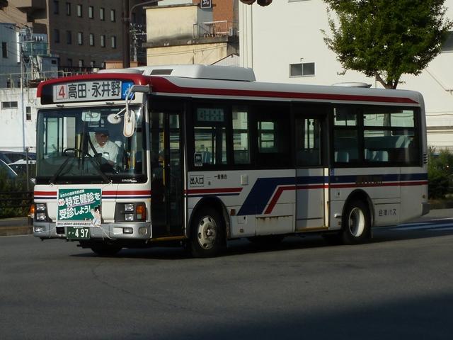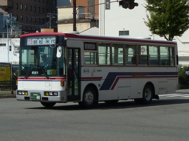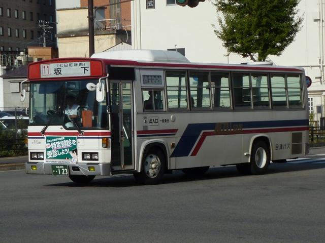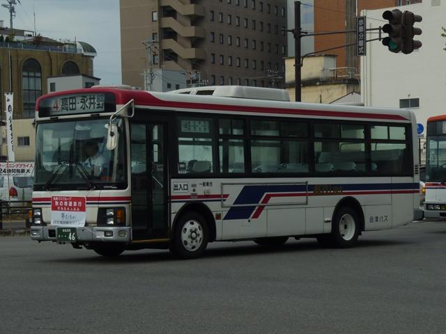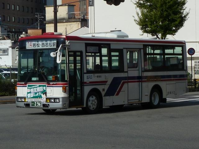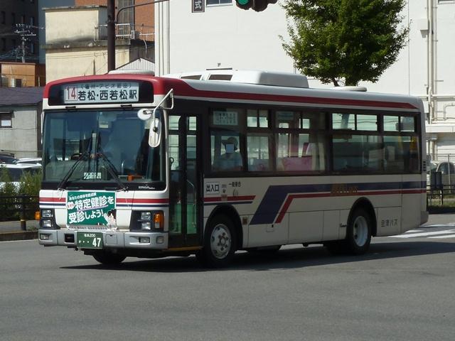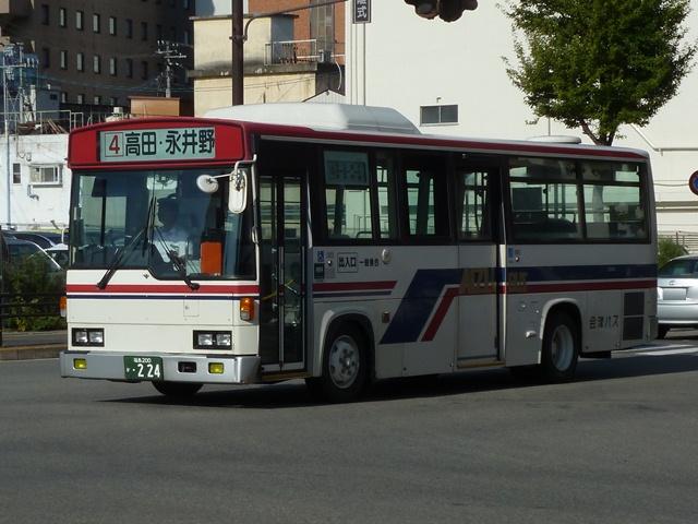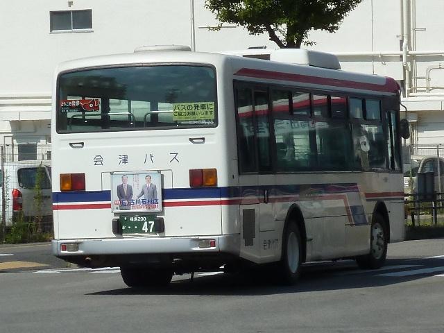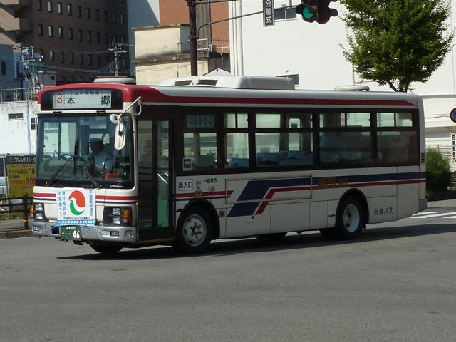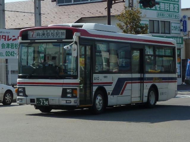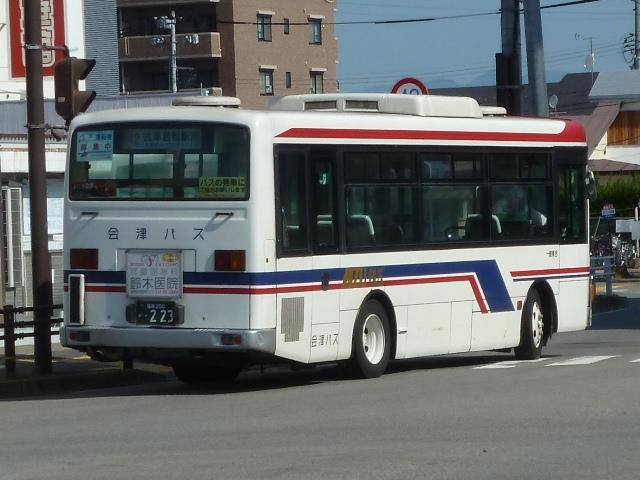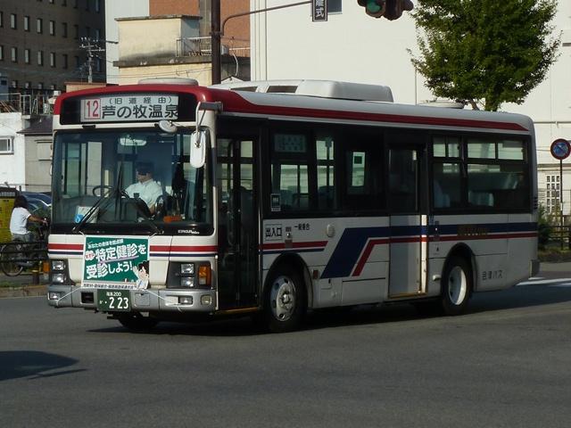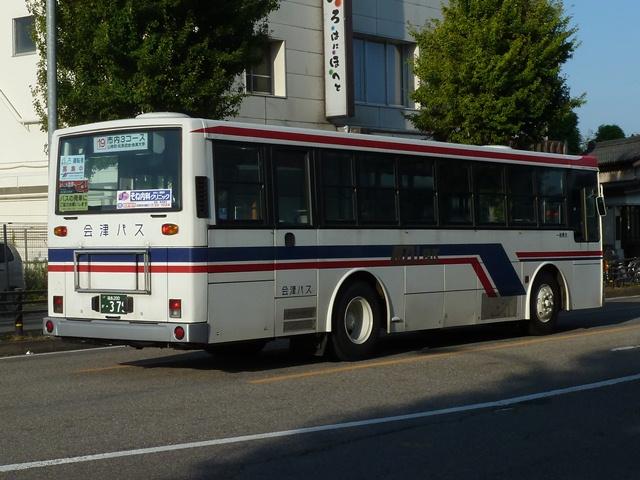 9月開催の福島バスまつりにあわせて出かけた会津若松で記録したバス画像のよせ 集め「会津若松で見たバス2012」。 今回の「その5」では、会津乗合自動車の「福島200か」・「会津200か」ナンバーの一 般乗合車を並べていきます。なお、並べている車両は2011年編とほぼ同じです。もは や定点観測としかいえない内容であることを、あらかじめおことわりしておきます。 福島200か46. 会津乗合自動車の一般路線車は中型車メインで、長らくトップドア仕様を採用していました。 いすゞLRはバリアフリー法施行前にエルガミオにモデルチェンジしたので、初期導入車は、 ワンステップのトップドア仕様となっています。それにしても画像の車両、前輪部付近のパ ネル腐食が1年前に比べるとだいぶ進んでいます。 福島200か47. 同時期に導入した車両ですが、こちらは喜多方営業所に配置。それほど目立つ腐食は 見られず。 福島200か48. 富士8EボディのRMトップドア車。こちらはツーステップ仕様です。 福島200か122. 日野RRのトップドア車。会津乗合自動車は基本的に三菱ふそうを除く3メーカーを導入 しています。 福島200か223. バリアフリー法施行後は前中扉仕様に変更。ただし中扉は車椅子専用で、乗降はこれ まで同様に前扉のみとなっています。あわせて後部にも行先表示を設置しています。 福島200か224. 日野RRもご覧の通り前中扉仕様となっています。 福島200か294. 導入台数は減ったものの、この頃はまだコンスタントに新車導入を行っていました。 いすゞLRのワンステップ車。 福島200か296. そしてUDのRMワンステップ車。 福島200か397. 東武バスから画像のいすゞLVと日野HTを導入。どちらも前後扉仕様車で、若松配置の 車両は主に3コース→松長団地・松長団地→4コースで運用しています。ちなみに後扉は 「しめきり」で、乗降は前扉のみとなっています。 福島200か497. 灯火規制対応したPA規制車のいすゞLR。1番違いの498は日野ブランドのKRを導入し ていますが、こちらは今年も見られず。 会津200か100. 永井野方面の路線をメインに運用している1ドア仕様のポンチョ。 PR
