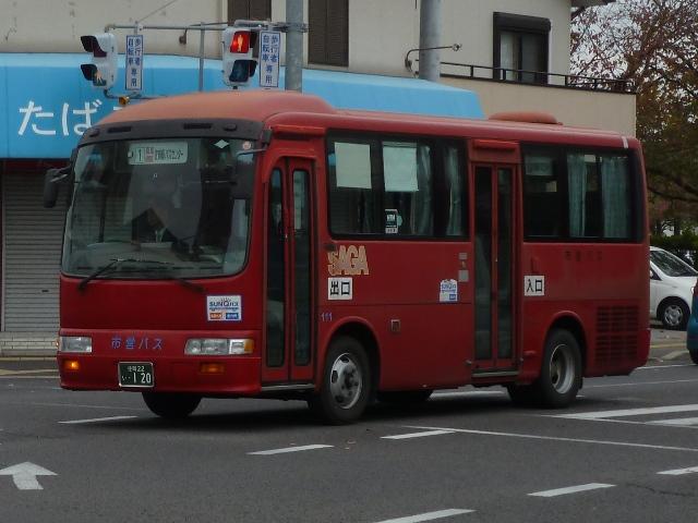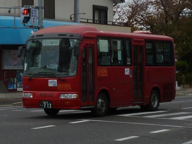 リミテッドと分かりますが、インパクトは十分です。車内に格納タイプの液晶テレビが装備さ れていることから、元は貸切車だったものと推測。さすがに元事業者を特定できる痕跡は 見当たりませんが、どうしても気になる方は他所様のサイトをご参照のこと。 <小型車> 車号:108. 一般乗合車として小型車の日野リエッセが在籍。台数は少ないものの、こまかい仕様差 があります。まずはトップドアで中板ナンバープレートのタイプ。この車両は全面ラッピン グ広告車となっています。 車号:111. 前中扉仕様で中板ナンバーのリエッセ。佐賀市交通局ではリエッセに赤1色塗装を採用 していますが、退色に加え、手入れの悪さ?なのかボディはだいぶお疲れな感じです。 車号:113.