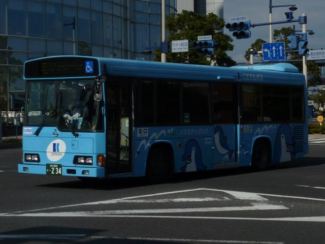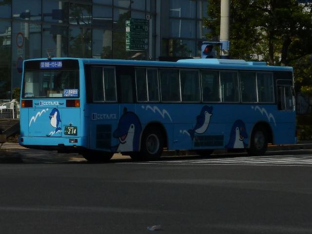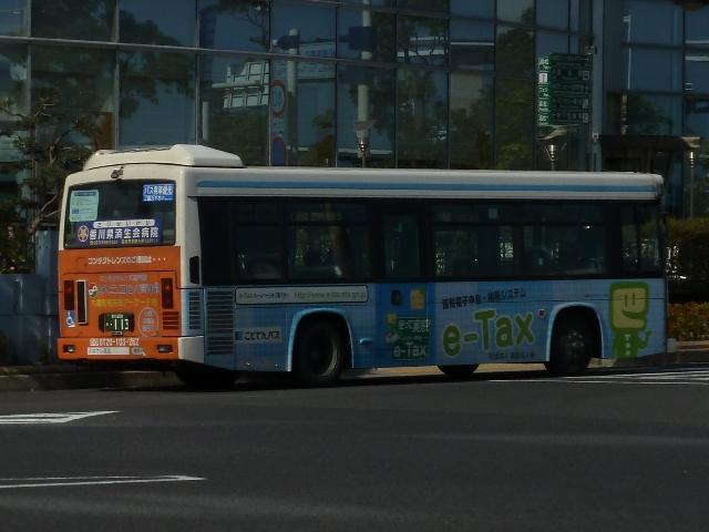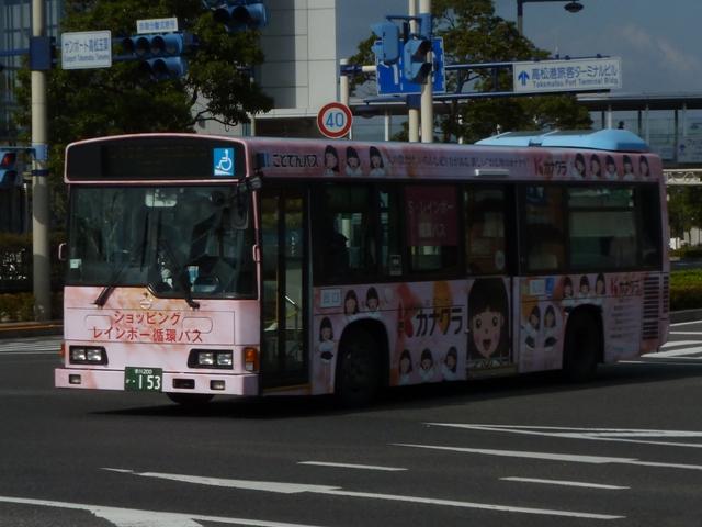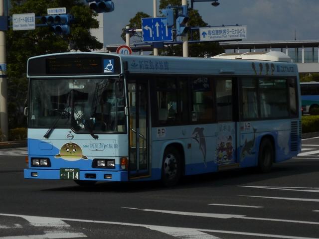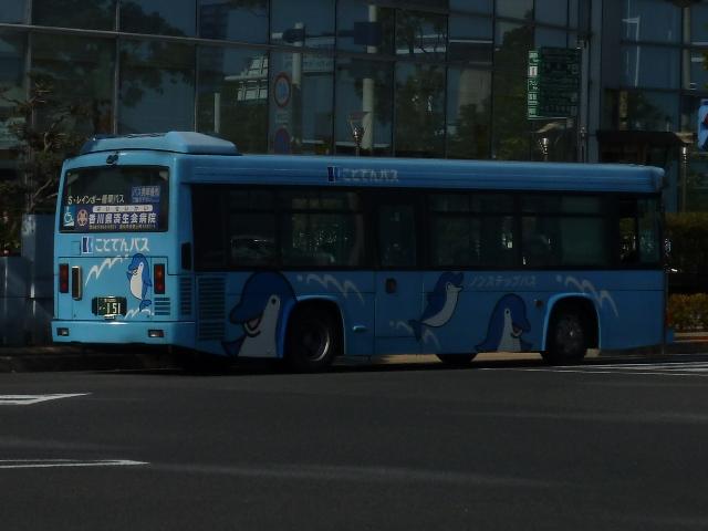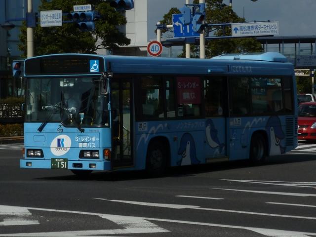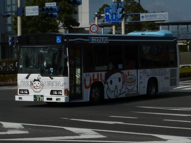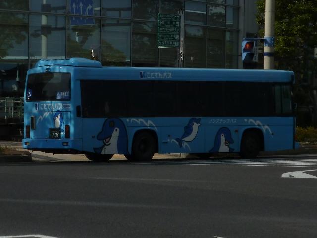 「高松で見たバス2012」と題したバス画像よせ集め。 今回のことでんバス編その2では、02~06年に導入した一般乗合車を並べていきます。 なお、ノンステップ車の型式・年式は『年鑑バスラマ』・『バスラマインターナショナル』各号 掲載の「ノンステップバス導入一覧」を参照しています。 香川200か110.KK-HR1JKEE(02年車)。 香川200か113.KK-HR1JKEE(02年車)。 一般乗合車は三菱ふそう車をメインに導入してきたコトデンバスですが、02年に初導入 した4台のノンステップ車は日野車でした。ラッピングで分かり難いですが、白色ベースに 水色帯のコトデンバス塗装で登場した最後のグループとなります。上下で車両が異なり 失礼。 香川200か114.KK-HR1JKEE(02年車)。 記録出来たコトデンバス時代導入の日野HRはラッピング車のみでした。この車両は新 屋島水族館のラッピング車。ラッピングしていない画像は2008年に記録したものをご 参照願います。 香川200か151.KK-HR1JKEE(03年車)。 高松琴平電鉄・コトデンバスの民事再生法申請により、新たなスポンサーの出資による 経営再建が進められることになります。これを機にバスの塗装は一新され、水色1色に 新生「ことでん」を象徴するイルカのキャラクター「ことちゃん」を描いたデザインとなりま した。ちなみに車両は前年から引き続いての日野HRを導入しています。 香川200か153.KK-HR1JKEE(03年車)。 こちらはお仏壇・仏具製造・販売の「カナクラ」ラッピング広告車となっている日野HR。見た 目女の子っぽいキャラクターが描かれていますが性別詳細等不明。03年春に導入した日 野HRは「ショッピング・レインボー循環バス」専用車となっています。 香川200か214. ことでんバスの大型一般乗合車は少数派で、移籍車メインとなっています。画像の車両 は名古屋市交通局からの三菱ふそうMP移籍車で、中扉4枚折戸仕様の基幹バスとして 導入した車両。現在日本全国で移籍事例が見られる名古屋市交通局移籍車ですが、当 時の廃車は3扉車中心だったこともあり珍しい存在でした。 香川200か234.PB-HR7JHAE(04年車)。 04年末導入の日野HRからPB規制車となります。非常口位置が後輪後部に変更され るなど見た目にも分かるマイナーチェンジを行っています。 香川200か235.PB-HR7JHAE(04年車)。 同じく04年末導入の日野HRですが、こちらは岡山放送のキャラクター「OH!くん」誕 生10周年を記念して登場したラッピングバスとなっています。デザインは公募作品で、 うどんとOH!くんがコラボレーションしたなかなか面白いものとなっています。 香川200か265.PA-MK27FH(05年車)。 05年末から06年初めにかけてノンステップ車を3台導入。 1台は日野HRで、2台が久々の三菱ふそう一般乗合車となるMKノンステップ車。 PR