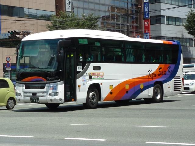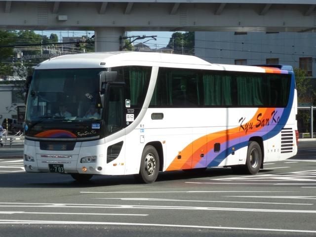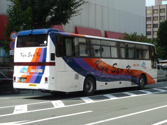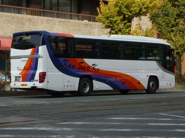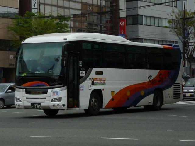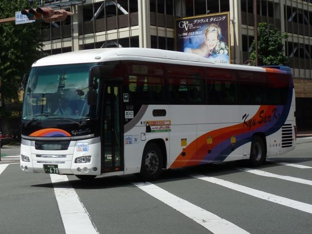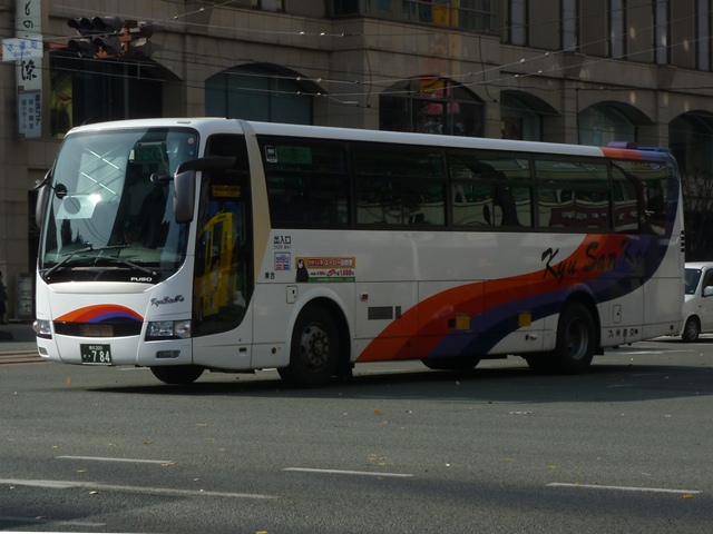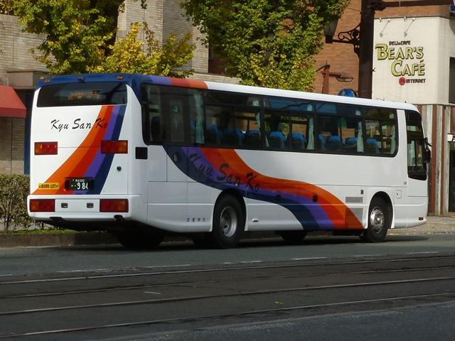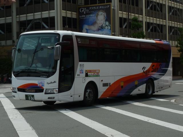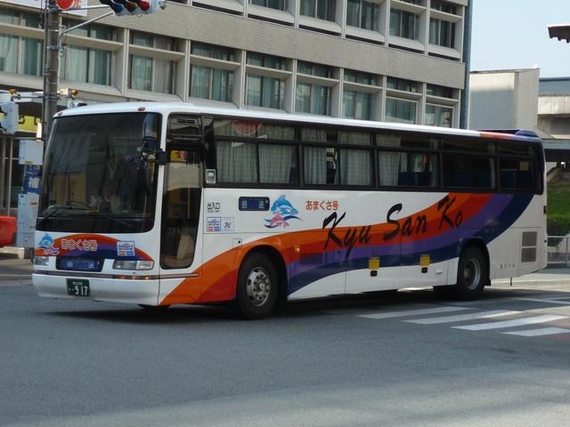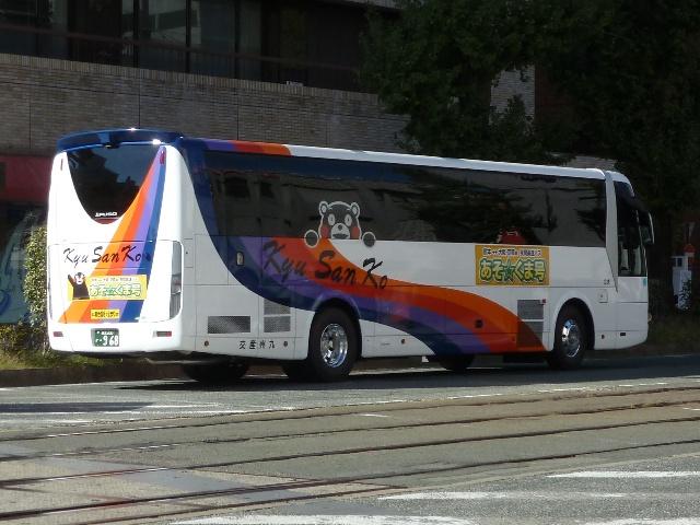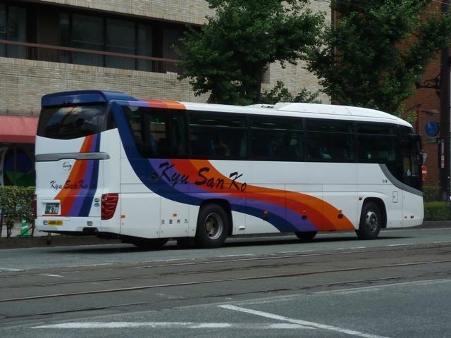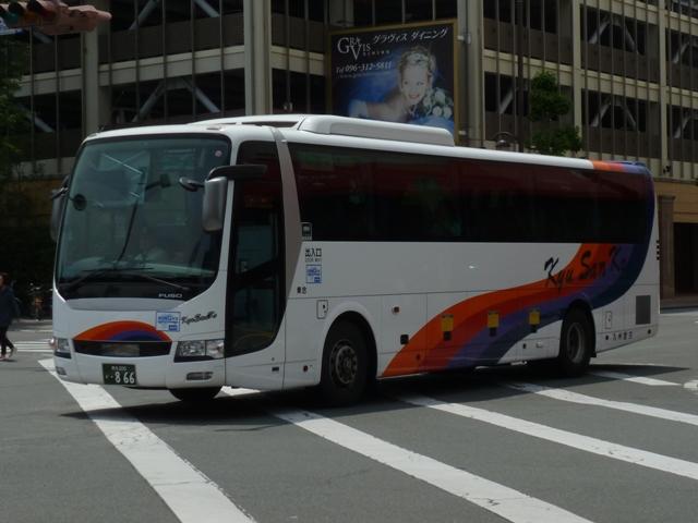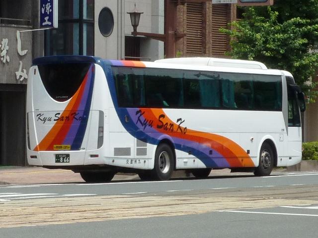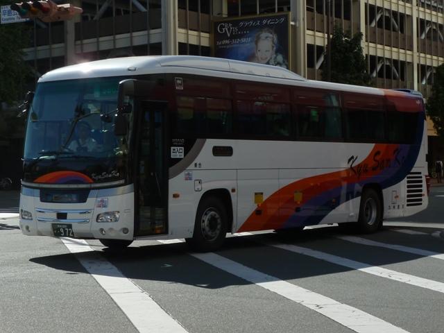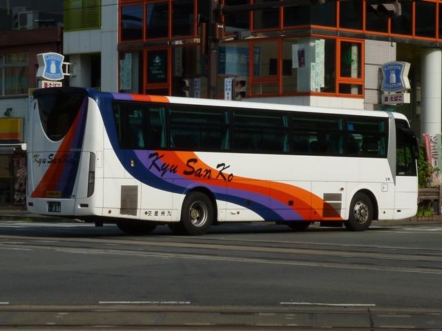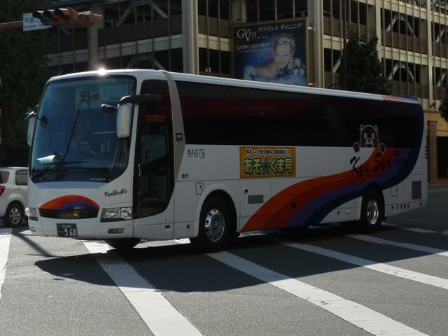 「熊本で見たバス2012」と題したバス画像のよせ集めシリーズ。長く続けてきたシリー ズですが、今回で一区切りつけます。シリーズ最終回は、九州産交グループ編その11 として、記録出来た熊本200か600番代以降の高速車及び特急・快速などで運用中の 観光ボディ車を並べていきます。 なお、並べている画像は九州産交バス所属車と地域子会社を統合した産交バス所属車 が混在していることをあらかじめ御理解・御了承願いします。 ※型式・年式は『BJハンドブックシリーズS85 九州産交バス』(2014),BJエディターズを参照し、2015年4月14日に追記しました。 熊本200か630.U-RA520TBN(93年車)。 登録番号がやけに新しいUDのRAで富士7HDボディ。再登録車か何かでしょうか。 元々は貸切車でしたが路線転用され、この日は九州横断バスで運用中でした。 熊本200か670.PKG-RU1ESAA(09年車)。 新型セレガの導入が続きます。このあたりの導入車両から側面「Kyu San Ko」ロゴが ボディ後部に変更されます。おそらくラッピング広告に対応したものと推測。 熊本200か703.PKG-RU1ESAA(09年車)。 スイング扉+側面固定窓の3列独立シート仕様の夜行高速車。この日は名古屋行「不知 火」号の運用に入っていました。ちなみに画像は9月に記録したものですが、現在は加藤 清正をモチーフにしたキャラクター「清正くん」の部分ラッピングバスとなっているようです。 熊本200か705.PKG-RU1ESAA(09年車)。 「ひのくに号」用に登場した車両はこれまで同様折戸+側面T字窓仕様で導入しています。 熊本200か784.BKG-MS96JP(10年車)。 日野セレガの導入が続いた高速車で、久々となる三菱ふそう車が登場。エアロエースで 「ひのくに号」メインに運用中。扉はさすがに折戸というわけにはいかず、標準のスイング 扉となっています。とりあえずこの1台が先行して導入されて・・・ 熊本200か806.BKG-MS96JP(10年車)。 20台弱の間を空けて、まとまった台数のエアロエースが増備されました。 熊本200か864.LKG-RU1ESBA(11年車)。 一般乗合車は移籍車導入ばかりですが、高速車は新車導入を継続。LKG規制車となった 日野セレガで、扉はこれまで同様折戸仕様となっています。 熊本200か866.LKG-MS96VP(11年車)。 側面固定窓で1+2の偏心3列シート仕様で登場した三菱ふそうエアロエース。直結冷房 3本トランクは新型セレガに合わせたのかもしれません。主に「なんぷう号」で運用中。 熊本200か917.KC-RU3FSDB(99年車)。 経年高速車や貸切転用車がメインとなっていた天草快速ですが、古参車ばかりという印 象は拭えず。そこで富士急グループや名阪近鉄バスなど、これまた微妙なところから日 野セレガFDの移籍車を数台導入し、車両の代替が進められることになりました。残念な がら小生レベルでは、外観からこの車両の元事業者判別は出来ず。無念。 ※型式を参照した『BJハンドブックシリーズS85 九州産交バス』によれば名阪近鉄 バスからの移籍車とのこと。2015年4月14日に追記。 熊本200か968.QRG-MS96VP(12年車)。 2012年8月より期間限定運行を開始した熊本と大阪・京都を結ぶ格安便「あそ☆くま号」 専用車として登場したQRG規制車の三菱ふそうエアロエース。「あそ☆くま号」は「サンラ イズ号」同様近鉄バスと共同運行しており、競合するツアーバスを意識したものと推測。 側面窓に貼られた「くまもん」がポイントとなっています。「あそ☆くま号」専用車ですが、時 折「ひのくに号」の運用にも入る模様。画像は分かり難いですが「ひのくに号」運用時に記 録したものです。 熊本200か972.QRG-RU1ASCA(12年車)。 2012年導入の日野セレガ。QPG規制車なのかQRG規制車なのか現状分からず。バ スラマ等で確認次第追記予定。 ※型式を参照した『BJハンドブックシリーズS85 九州産交バス』によりQRG規制車と判明。2015年4月14日に追記。 熊本200か979.QRG-RU1ASCJ(12年車)。 2012年はKL規制車のガーラ以来となる、いすゞブランドの高速車も登場。フロントガ ラス下の黒色部に何故か「KyuSanKo」ロゴがありません。 熊本200か984.KL-LV781R2(01年車)。 観光ボディの移籍車導入は継続しており、KL規制車のいすゞガーラが登場。路線車でも お馴染みの京浜急行バスからの移籍車で、元は羽田空港リムジンだった車両です。九州 横断バスの運用がメインとなっているようです。九州横断バスは現代ユニバースや貸切転 用車、移籍車のいすゞガーラ、旧九州国際観光塗装のセレガFSとバラエティ豊かです。 熊本200か1000番台の高速車も登場しているようですが、そこまで記録できませんでした。 PR