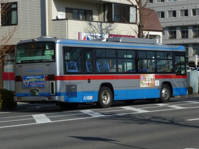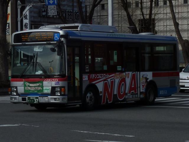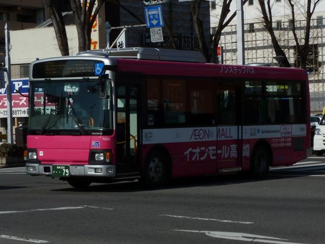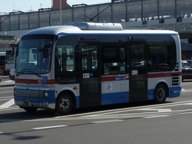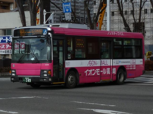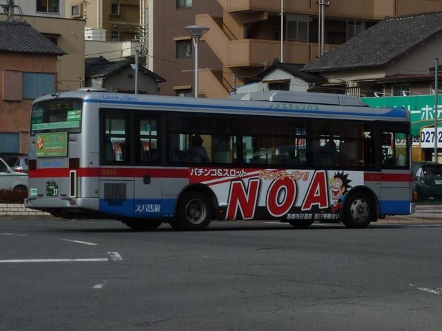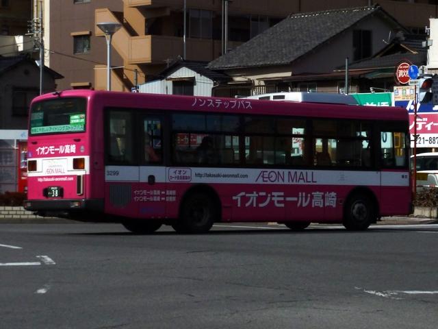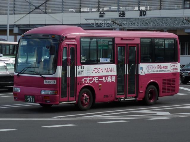 「前橋で見たバス2013」と題した、前橋駅前で記録したバス画像のよせ集め。 今回のその3では、記録出来た群馬バスの一般乗合車画像を並べていきます。 高崎駅を発着する路線がメインという印象の群馬バスですが、かつては前橋駅発着路 線も多く存在していました。90年代までに不採算路線は廃止され、いくつかが日本中央 バスや永井バスに引き継がれています。現在、前橋駅を発着する群馬バス路線は箕郷 行きとイオンモール高崎行きの2路線のみとなっていますが、運行本数のわりに運用車 両はバラエティに富んでいます。 社番:3314. まずは一般塗装車で運行している箕郷行きの車両から。4桁社番の頭数字「3」はいすゞ 車をあらわします。コンスタントに中型ノンステップ車の導入が続いており、画像の車両は PDG規制車のLRノンステップ車。銀色+赤帯の東急バスカラーに窓上とボディ下部に青 帯を追加した群馬バス新塗装車。 社番:7194. 4桁社番頭数字「7」は日野車。PKG規制車のKVワンステップ車は、群馬バスで久々に 新車導入した大型一般乗合車です。 社番:7207. 運用車両のサイズは特に決まっていないようで、昼間は7mノンステップ車のポンチョがやっ てくることも。この大きさでも問題無い乗客数というのが残念です。 社番:3299. イオンモール高崎行きはイオンカラーラッピングの専用車により運行。運行本数の割に 車種のバラエティが富むのはこのためです。まずは、いすゞLRノンステップ車。 社番:7188. 中型車の運用がメインとなっていますが、7mサイズの日野RXリフト付き車も運用に入り ます。 社番:7203. 1つ目ヘッドライトの日野KRノンステップ車。 PR