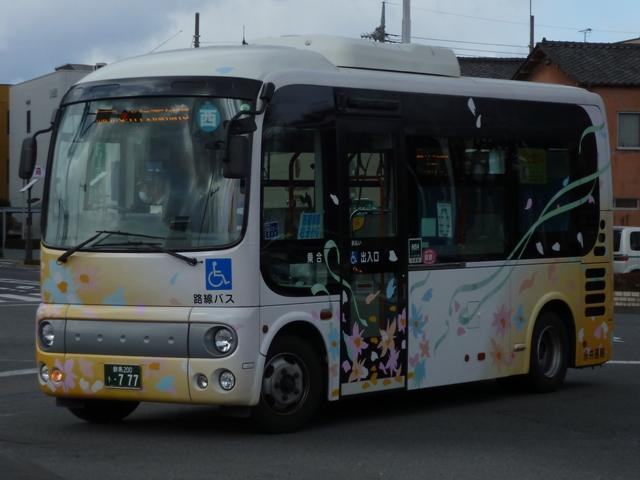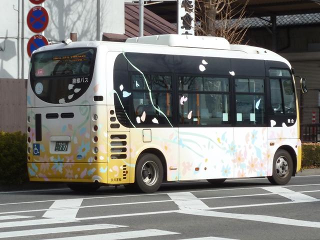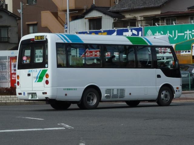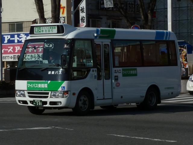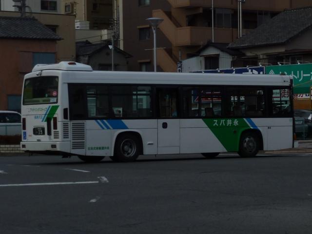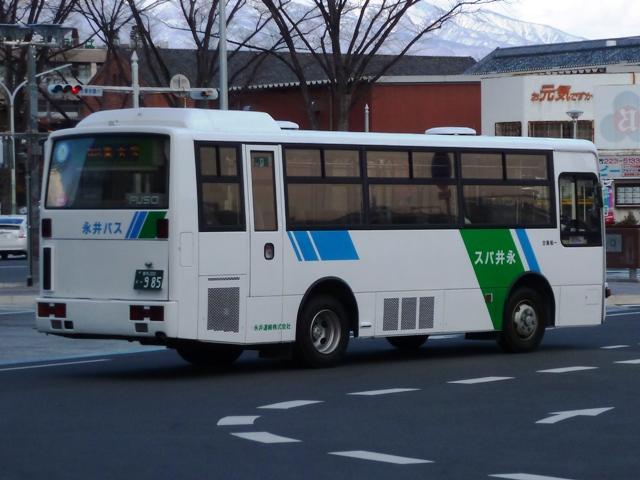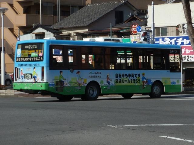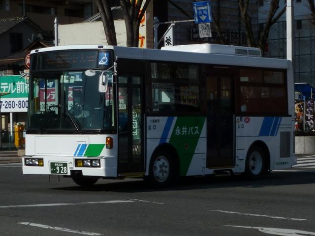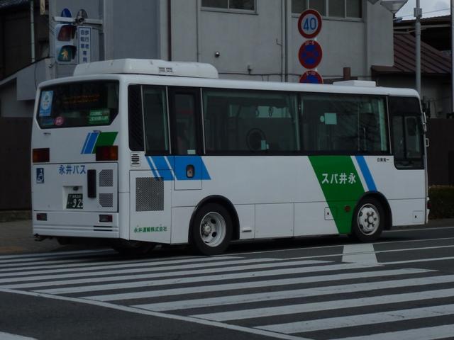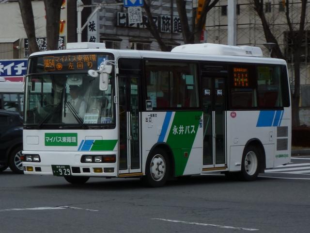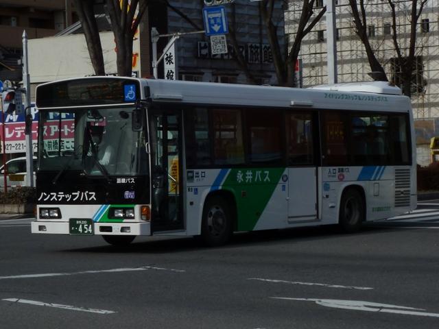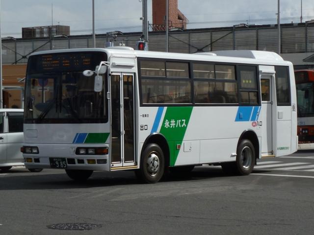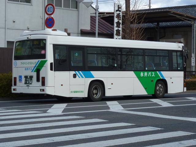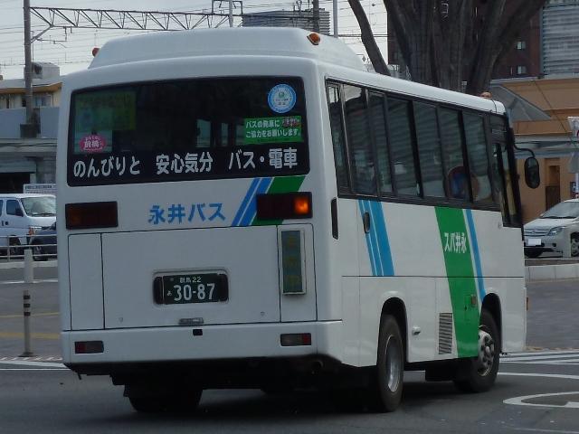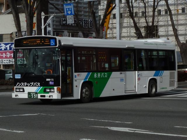 「前橋で見たバス2013」と題した、前橋駅前で記録したバス画像のよせ集め。 今回のその5では、記録出来た永井バスこと永井運輸の乗合バス画像を並べていきます。 なお、型式・年式は「永井運輸 所有車両44台全データ」『バスマガジン21号』(2007), 三推社/講談社 を参照しました。 群馬22あ2963.KC-LR333F(96年車)。 永井運輸は運送事業を皮切りにタクシー・貸切バスと事業を拡大、廃止代替バスの運行 を開始した1993年から路線バスに参入した事業者です。 まずは96年の代替バス運行にあたり4台導入した、いすゞLR短尺車。画像の車両は 群馬の路線バスでおなじみの「サントノーレ 」広告を貼り付けた車両。 群馬22あ2964.KC-LR333F(96年車)。 群馬22あ2965.KC-LR333F(96年車)。 群馬22あ2966.KC-LR333F(96年車)。 せっかくなので今回はLR短尺車4台の画像を並べておきます。担当路線の関係なのか、 ラッピングや広告を貼り付けた車両が4台中3台(2013年1月現在)となっています。 群馬22あ3087.KC-RH4JEAA(97年車)。 97年導入の日野RH乗合車。この頃7mサイズの乗合車は、UDのRNやマイクロバス サイズで日野RXなどが人気モデルとなっていたことから、KC規制車のRHを乗合車で 導入した事業者は熱心な日野ユーザーを除けば少ない印象。永井運輸は路線バス参 入時に日野RHを3台導入していたことから、勝手知ったる車両を増備したのかもしれま せん。 群馬22あ3290.KC-RM211GAN改(99年車)。 群馬県内初導入の中型ノンステップバスとなった西工ボディのRM。中扉はグライドスラ イドと、今から見ると過渡的な仕様となっています。 群馬200か398.KK-HR1JKEE(03年車)。 ノンステップ車の増車は日野HR9m。非常口が中央部にあるKK規制車。 群馬200か454.PB-HR7JHAE(04年車)。 04年導入車からPB規制車。非常口位置などがマイナーチェンジで変更しています。 群馬200か597.PK-HR7JPAE(06年車)。 06年は10.5mサイズを導入。 群馬200か928. 路線バス参入時に導入した車両代替や「マイバス」東循環線運行車両は移籍車導入で 対応しています。2011年は7mサイズの異なる車種をそれぞれ1台、計2台導入。まず は西武バスからのRMワンステップ車。中扉部にステップを装備しているところがポイント。 群馬200か929. もう1台は三菱ふそうMJワンステップ車。名古屋市交通局の都心ループバスだった車両 で側面固定窓やウッディな内装など名残十分です。この日は2012年1月より運行を開始 した「マイバス」東循環線で運用中でした。ちなみに現在のところ「マイバス」東循環線に専 用車は無く、7mサイズの車両が日替わりで運用中です。 群馬200か985. 前後扉仕様の三菱ふそうMK短尺車は高槻市営バスからの移籍車。画質の関係で分か りにくいですが、後面行先表示周りの緑色に名残。前後扉車も導入するとは思いもよらず。 群馬200う777. 続いて「マイバス」西循環線運行開始にともない登場したポンチョショート1ドア仕様車。 関越交通運行の「マイバス」と同車種ですが、塗装デザインが異なります。登録番号は 希望番号で取得し、画像の777のほか333の2台が専用車両として運用中です。 群馬200あ301. 「マイバス」東循環線のほか、一般路線でも運用中の三菱ふそうローザ。 PR