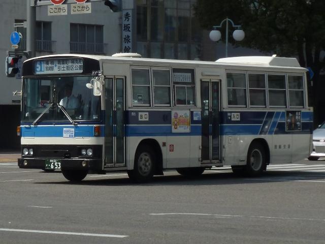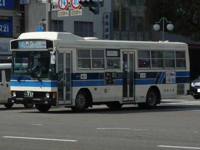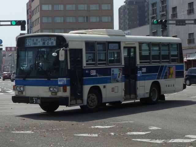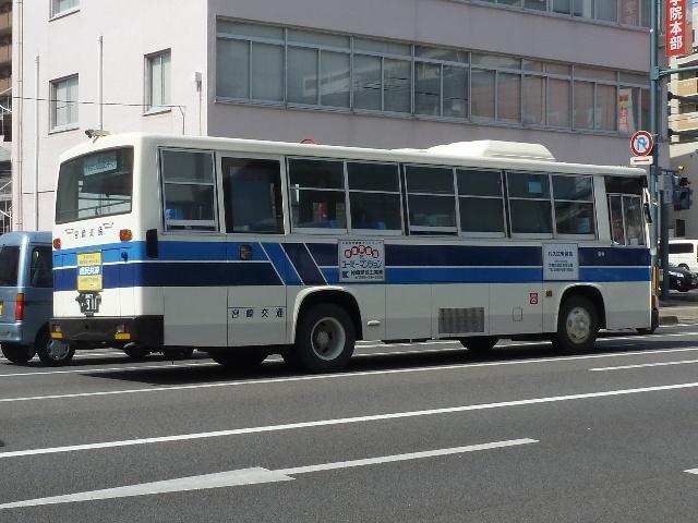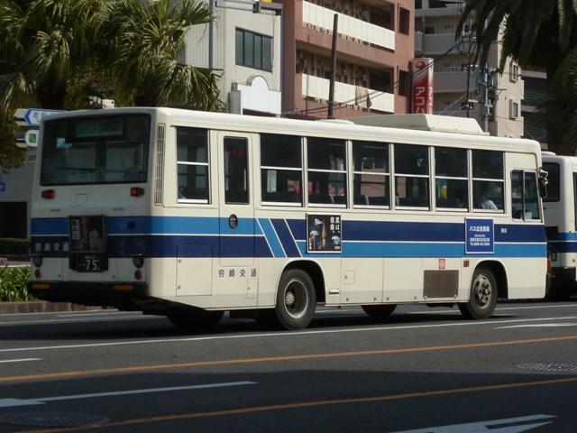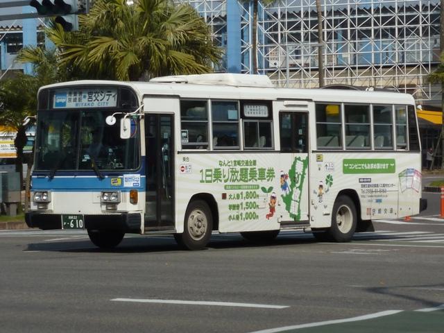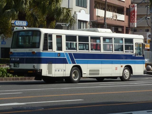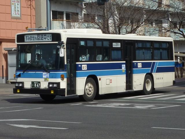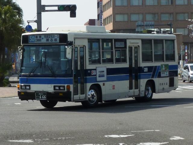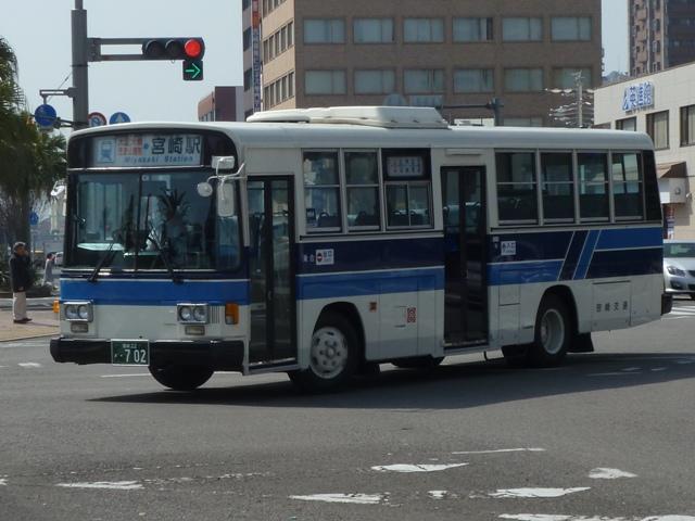 「宮崎交通のバス2013」と題したバス画像のよせ集め。 今回のその2では、宮崎交通で現在もまとまった台数在籍するP規制車の一般乗合車 (貸切転用車を除く)を並べていきます。 なお、型式・年式は「宮崎交通所有車両全データ」『バスマガジン16号』(2006), 三推社/講談社を参照しました。 宮崎22か605.P-LR312J(84年車)。 宮崎交通の一般乗合車は中型車メイン。4メーカー在籍していますが、台数に多少ばら つきがあります。まずは純正ボディのいすゞLR。まとまった台数が在籍しています。 2012年同様、今回も記録出来た最古参は84年登録車でした。 宮崎22か610.P-RM80G(84年車)。 UDは富士重工6EボディのRM。古参ながら、ラッピング広告車となってしまうところが 宮崎交通の凄いところ。 宮崎22か653.P-MK116J(85年車)。 三菱ふそう車の一般乗合車は他3メーカーに比べると少数。板バネのMK116J。 宮崎22か666.P-LR312J(85年車)。 純正ボディのいすゞLR。この車両は一般乗合車ながらアルミホイルを装着しているという、 こだわりの1台。2012年に撮り逃がしていたのでリベンジ成功です。 宮崎22か702.P-RM81G(86年車)。