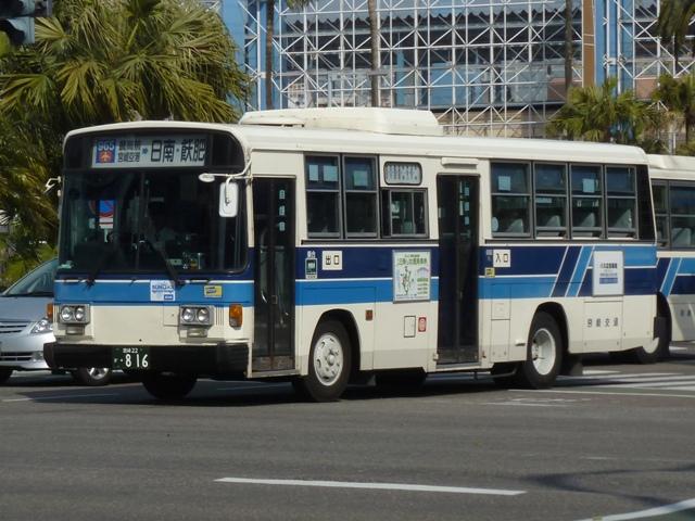 宮崎22か717.P-RJ172BA(86年車)。 丸1つ目ヘッドライトが特徴の日野RJ。宮崎交通では今も主力的存在モデルの1つです。 宮崎22か756.P-LR312J(87年車)。 宮崎22か757.P-LR312J(87年車)。 いすゞLR。上下で車両が異なり失礼。 宮崎22か816.P-RM81G(88年車)。 88年導入の日野中型一般乗合車はエアサス仕様となりましたが、UDのRMは板バネ 仕様を継続。 宮崎22か867.P-UA33L(89年車)。 貸切転用車を除き、純粋な大型乗合車は少数派の宮崎交通。89年に久々の大型乗合 新車としてキュービックボディのいすゞLV214MとUDのUA33Lを導入。UA33Lは富 士ボディと画像の西工ボディどちらも在籍しています。西工ボディのUA33Lは今回よう やく記録できました。 宮崎22か910.P-RM81GR(90年車)。 エアサス仕様で導入した90年車。エアサス仕様のRMは2台のみで、実はレア車です。 宮崎22か911.P-RR172CA(90年車)。 ボディをマイナーチェンジし、型式がRR172CAとなった日野中型車。翌年以降導入のU規 制車ではヘッドライトをオプションの角目仕様となるため、丸目4灯ヘッドライトは少数派。 上下で車両が異なり失礼。 PR