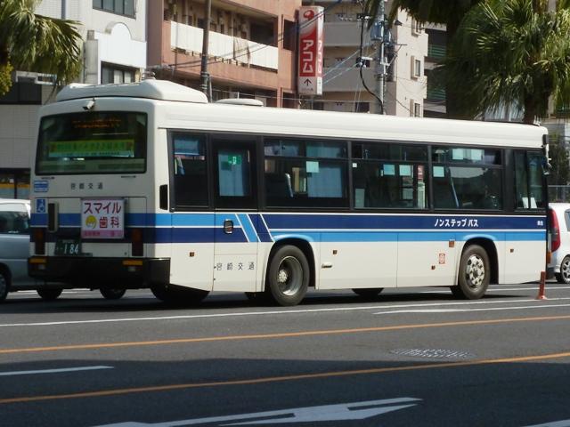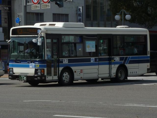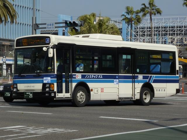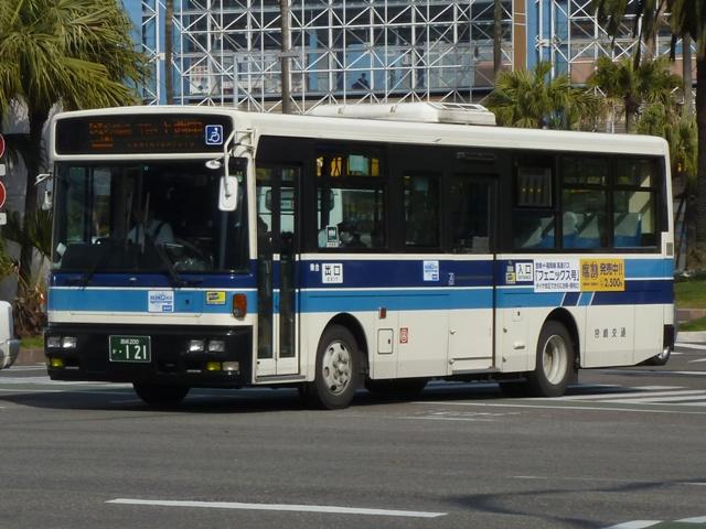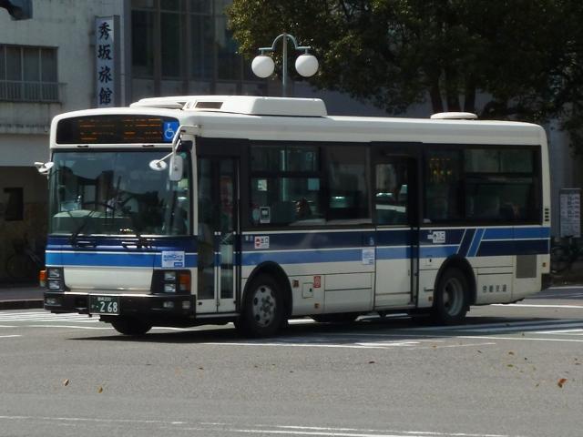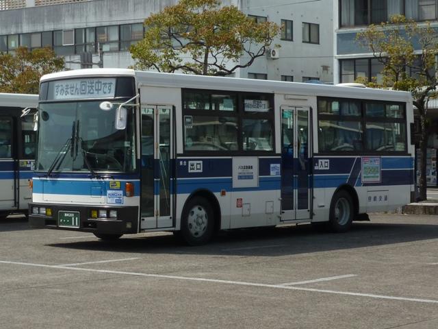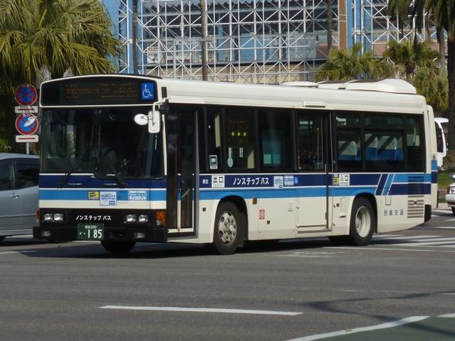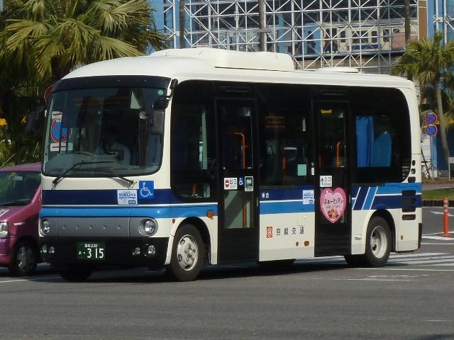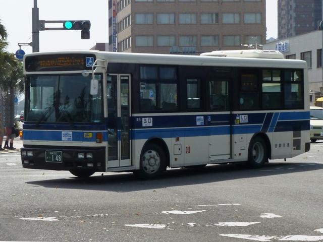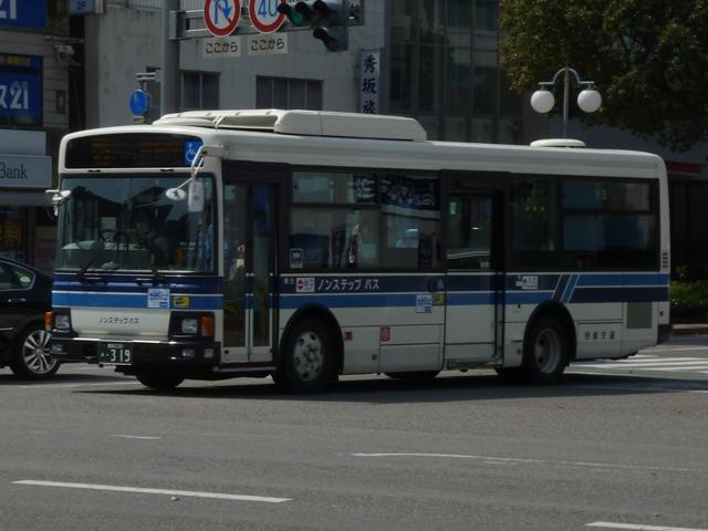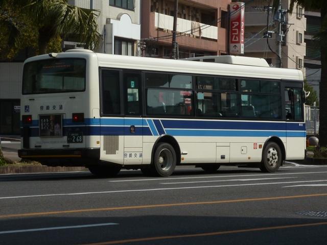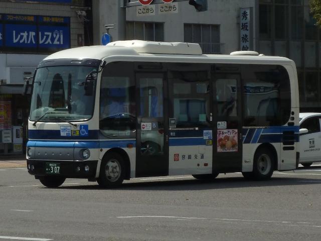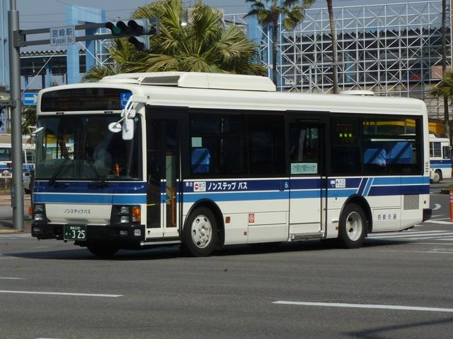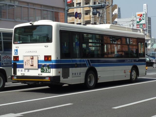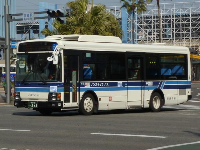 「宮崎交通のバス2013」と題したバス画像のよせ集め。 シリーズ最終回となるその4では、その3同様2012年編で一部の車種しか記録できな かった「宮崎200か(希望番号含む)」ナンバーの一般乗合車を並べていきます。 なお、型式・年式は「宮崎交通所有車両全データ」『バスマガジン16号』(2006), 三推社/講談社 及び、『年鑑バスラマ』・『バスラマインターナショナル』各号掲載の「ノン ステップバス導入一覧表」を参照しています。 宮崎200か11.KK-RM252GSN(99年車)。 宮崎交通の中型乗合車では久々の導入となった富士ボディ。KK規制車のRMワンステッ プ車ですが、交通バリアフリー法制定前ということでスロープ等は装備していません。 富士ボディのRMワンステップ車にはスロープを装備した中扉引戸車も導入していますが、 今回も見られませんでした。 宮崎200か25.KK-LR233J1(00年車)。 2012年編でも並べた車両ですが、枚数稼ぎということで。00年に登場したいすゞLRの ノンステップ車。 宮崎200か71.KK-RJ1JJHK改(01年車)。 2台が在籍する01年導入の日野RJワンステップ車。 宮崎200か94.KK-LR233J1改(02年車)。 まとまった台数が在籍する、いすゞLRのワンステップ車。この車両は全日空のラッピング 広告車となっています。 宮崎200か121.KK-RM252GAN(03年車)。 03年導入の西工ボディRMワンステップ車。 宮崎200か145.PA-LR234J1改(04年車)。 PA規制車となったいすゞLRワンステップ車。 宮崎200か148.PB-RM360GAN(04年車)。 PB規制車のRMワンステップ車も導入。いすゞLRや日野HRと比べると少数のため、 今回ようやく記録する事ができました。 宮崎200か185.PB-HR7JHAE(05年車)。 宮崎200か184.PB-HR7JHAE(05年車)。 日野HRはKK規制車とPB規制車のどちらも在籍。画像の車両は非常口位置を後輪後 位置に変更したPB規制車です。前後で車両が異なり失礼します。 宮崎200か268. PDG規制車のいすゞLRワンステップ車。画像の純正ボディの他、西工ボディも導入して います。西工ボディの方を記録したかったのですが、そう思うようにはなりません。 宮崎200か278. 車両代替の施策ということなのか、京王電鉄バスグループから富士ボディのJPワンステッ プ移籍車を導入。宮崎交通生え抜き車との差がありすぎたのか、一般乗合車への移籍車 導入は継続されず。 宮崎230あ307.BDG-HX6JLAE。 宮崎230あ315.BDG-HX6JLAE 2009年以降導入が続いている日野ポンチョ。ローカル部だけでなく、宮崎市内にも活躍の 場を広げています。希望番号を採用しているため登録年がよくわからず。 宮崎230あ319.PDG-KR234J2(11年車)。 11年導入の日野KRノンステップ車。1つ目ヘッドライトがポイント。 宮崎230あ323.SKG-LR2903J1(12年車)。 宮崎230あ324.SKG-LR290J1(12年車)。 12年はいすゞLRノンステップ車を4台導入。直4エンジン搭載のSKG規制車が宮崎交 通に初登場しました。上下で車両が異なり失礼します。 宮崎230あ325.SKG-LR290J1(12年車)。