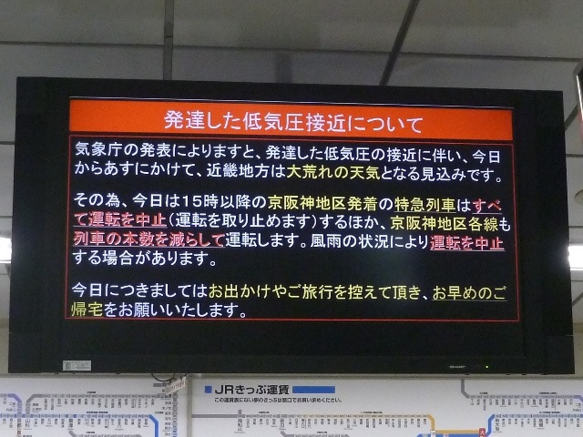 「春の嵐」が吹き荒れた今週末。気象庁などでは早い時期から週末に不要不急の外出 を控えるよう警戒を呼び掛けていました。 にも関わらず、大阪へ出かけていた小生。高速夜行バス予約時点に天候までは分かり ませんからね。キャンセル料をケチり、不要不急の外出強行です。 そんな旅情気分をぶっ飛ばす現実。 今回大阪へ出かけた目的は、次号バスラマ事業者訪問掲載(予定)「全但バス」の手持ち 画像確保のため。旅の目的が相変わらず他人に話せませんが、さすがに城崎温泉まで行 って帰れなくなっては笑えません。 苦渋の決断を下し、昼特急でトンボ帰りしました。大阪滞在わずか数時間・・・。 4月のブログ更新ネタを確保するはずが、雨の車窓を眺めるだけとなってしまいました。 まあブログの1ネタにはなりましたので、良しとしましょうか。 PR