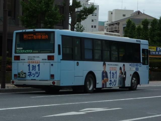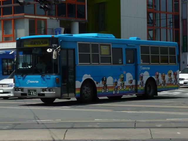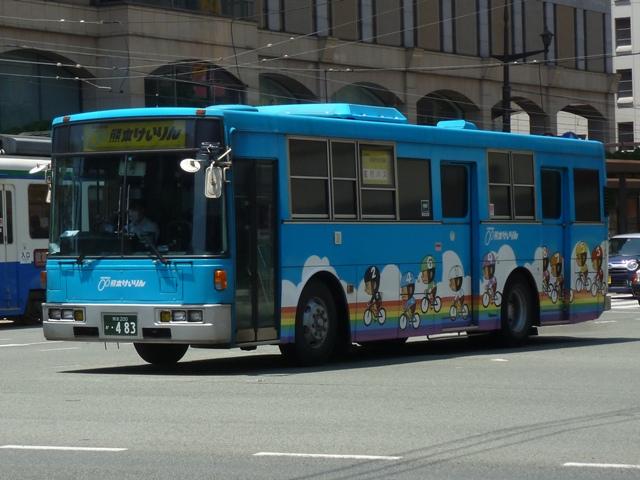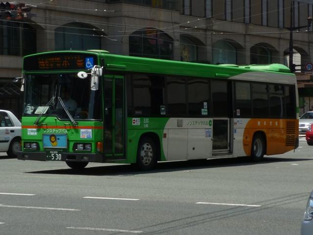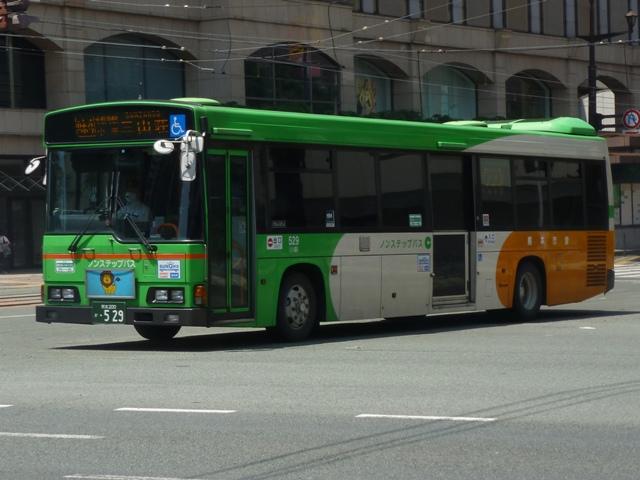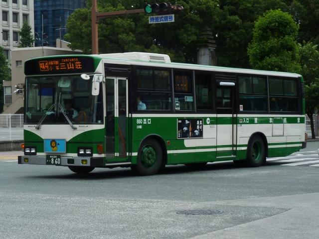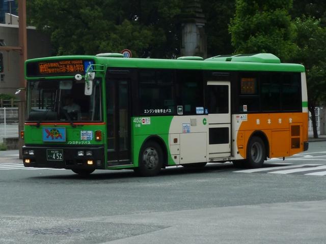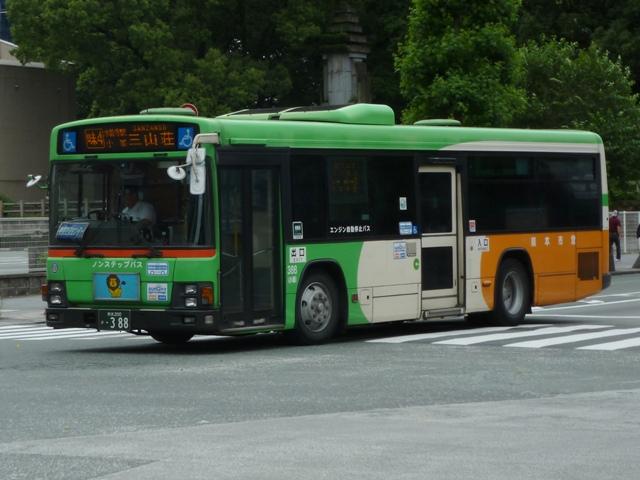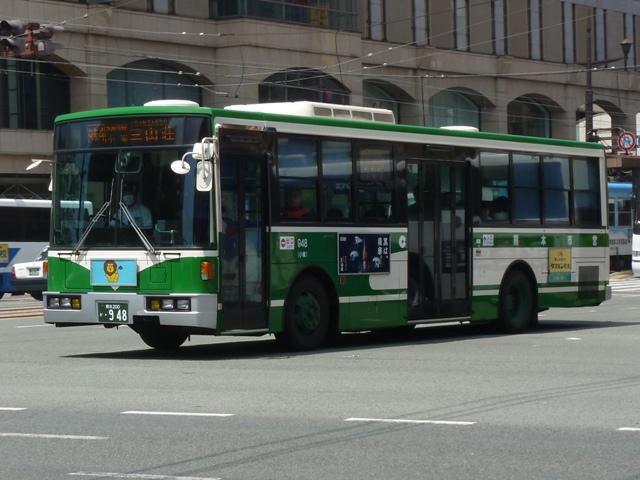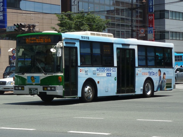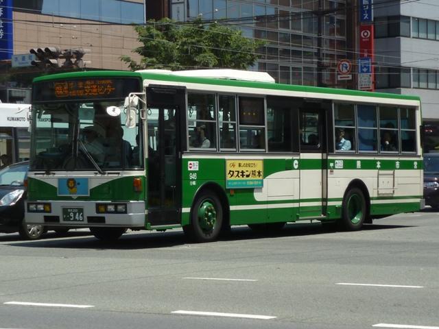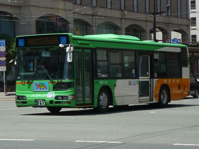 熊本で見たバス2013」と題したバス画像のよせ集めシリーズ。 前回に引き続き熊本市営バス編です。今回のその2では、記録出来た「熊本200か」ナ ンバーの車両を並べていきます。今年4月の熊本都市バスへの路線移譲にあわせ、車 両移籍が行われており、市営バスに残っている車両の陣容が相変わらずよく分かりませ ん。2013年4月以降に記録出来た車両から判断した内容となっていることをあらかじめ お断りしておきます。 ※なお、型式・年式を 「熊本市交通局・熊本都市バス在籍車両一覧表」『バスマガジン65号』(2014),講談社ビーシー/講談社 を参照し、2014年8月10日追記しました。 熊本200か253.KL-HU2PMEE(02年車)。 1990年代後半~2000年代初めにかけ、熊本市営バスでは東京都交通局からの移籍車 導入とノンステップバスの新車導入を並行して行っていました。この頃導入した車両は路線 移譲にあわせて熊本都市バスへ転籍しており、「熊本200か」ナンバー初期に新車導入した いすゞLR・三菱MJノンステップ車は全車転籍しています。 現在市営バスに残る「熊本200か」ナンバーのノンステップ車の古株は03年に登場した日野 ブルーリボンシティとなるようです。一部の車両は2012年に都市バスへ転籍し、現在は都市 バス塗装に塗り替えられて運用中です。 熊本200か388.KL-LV280L1改(04年車)。 2004年度の新車導入は大型ノンステップ車3台と中型ノンステップ車3台。大型ノンス テップ車はいすゞLVで、国交省仕様ノンステップバスのtype-A。 初期ノンステップバスがATのみのモデルがあった影響からか、熊本市営バスはAT導入 事業者へ変貌。MT設定のある車両もATで導入し、もちろんこの車両もATです。 中型ノンステップ車は9mサイズの日野HRを導入しましたが、2012年4月の都市バス への路線移譲にあわせて転籍しています。 熊本200か452.PB-RM360GAN(06年車)。 2006年はRMノンステップ車を5台導入。入札に強かったのか?RMノンステップ車は 数年おきに導入しており、2003年度末には10台登場。 06年車は日野のエンジンを搭載したPB規制車で、日産シビリアンと同じテールライトを 採用しています。市営バスでは勢力を築いたRMノンステップ車ですが、路線移譲にあわ せて都市バスへの転籍が進み、市営バスに残るのは06年車の一部のみのようです。 なお、新車導入と並行して行われてきた移籍車導入ですが、東京都交通局が知事の意向 により移籍車売却を中止したことから、西武バスや川崎鶴見臨港バスといった関東地方の 事業者からの移籍車導入へと変わりました。 熊本200か526.PA-MK27FH(07年車)。 07年の新車導入は5台。2台が9mサイズの中型車で、三菱ふそうMKノンステップ車。 三菱ふそう車はMJノンステップ以来の導入。 熊本200か529.PK-HR7JPAC(07年車)。 3台が中型幅10.5m低床車を採用。しかも日野HRのOEM車となる、いすゞエルガJ。 それでなくても採用事例が少ないレア型式ですが、さらにAT車となると熊本市営バス のみの存在と推測。 熊本200か530.PK-HR7JPAC(07年車)。 せっかくなので、エルガJをもう1枚。画像の車両は熊本市交通局発行のバス路線図の 表紙をここ何年間か連続して飾っています。 熊本200か860.KC-HU2MMCA改(97年車)。 熊本200か859.KC-HU2MMCA改(97年車)。 都市バスへの路線移譲が本格的に進められ、古参車代替は移籍車導入のみとなります。 熊本でおなじみ、京浜急行バスグループから日野ワンステップ移籍車が熊本市営バスにも 登場。上下で車両が異なり失礼します。同時期に江ノ電バスからUAツーステップ車を導入 していますが、市営バスに在籍しているのか分からず。 熊本200か946.KC-UA460LSN改(97年車)。 2012年は富士7Eボディのワンステップ移籍車を4台導入。まずは西武バスからのUA ワンステップ車で1台のみ在籍。 熊本200か947.KC-LV380N改(99年車)。 3台は新京成バスグループから導入したいすゞLVワンステップ車。画像の車両はラッピン グ広告車となっています。 熊本200か948.KC-LV380N改(99年車)。 せっかくなので標準塗装車も並べておきます。新京成バスグループからの移籍車の3台 のうち、1台が船橋バス引継ぎ車とのこと。 <熊本競輪場送迎バス専用車> 熊本200か482.U-UA440LSN(94年車)。 2013年度も熊本競輪場の無料送迎バス運行を熊本市営バスが担当。これまで通り 西武バスからのUAツーステップ移籍車が専用車として運用に入っています。 競輪送迎専用車のUAは前中扉車2台、3扉車1台の計3台という陣容。側面方向幕は 競輪場行が「直行バス」、熊本駅方面行が「停車停留所」と異なる表示となっています。 熊本200か483.U-UA440LSN(94年車)。 3扉車は扉を埋められることなく全て活用中です。 PR